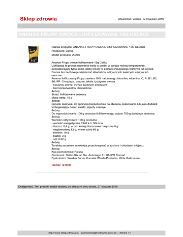 Sklep zdrowia Utworzono: wtorek, 12 kwiecień 2016 ANANAS FRUPP OWOCE LIOFILIZOWANE 15G CELIKO Nazwa produktu: ANANAS FRUPP OWOCE LIOFILIZOWANE 15G CELIKO Producent: Celiko Model produktu: 20276 Ananas Frupp owoce liofilizowane 15g Celiko Liofilizacja to proces usuwania wody w prożni w bardzo niskiej temperaturze, pozostawiający tylko samą istotę rzeczy w postaci chrupiącego warzywa lub owoca. Proces ten zachowuje większość składnikow odżywczych świeżych warzyw lub owocow. Ananas liofilizowany Frupp zawiera 10% naturalnego błonnika, witaminy: C, A, B1, B2, B6, PP. Chrupiące, pyszne, lekkie i pożywne owoce. - soczysty aromat i smak świeżych ananasow - bez konserwantow i barwnikow. Skład: liofilizowane ananasy Masa netto: 15 g Sposob spożycia: do spożycia bezpośrednio po otwarciu opakowania lub jako dodatek wzbogacający deser, ciasto, jogurty i napoje. Do wyprodukowania 100 g ananasa liofilizowanego zużyto 700 g świeżego ananasa. Wartość odżywcza w 100 g produktu: - wartość energetyczna 1540 kJ / 364 kcal - tłuszcz: 0,4 g, w tym kwasy tłuszczowe nasycone 0 g - węglowodany 82 g, w tym cukry 69 g - błonnik: 10 g - białko: 3 g - sol: 0,02 g Torebkę szczelnie zamkniętą przechowywać w suchym i chłodnym miejscu. Kraj pochodzenia: Polska Producent: Celiko SA, ul. Św. Antoniego 71, 61-359 Poznań Dystrubutor: Walden Farms Kornelia Warda-Poniecka, Wola Gołkowska Cena: 3.99zł Dostępność: Ten produkt został dodany do sklepu w dniu środa, 27 styczeń 2016 http://www.sklep-zdrowia.eu | [email protected] | | Strona 1/1