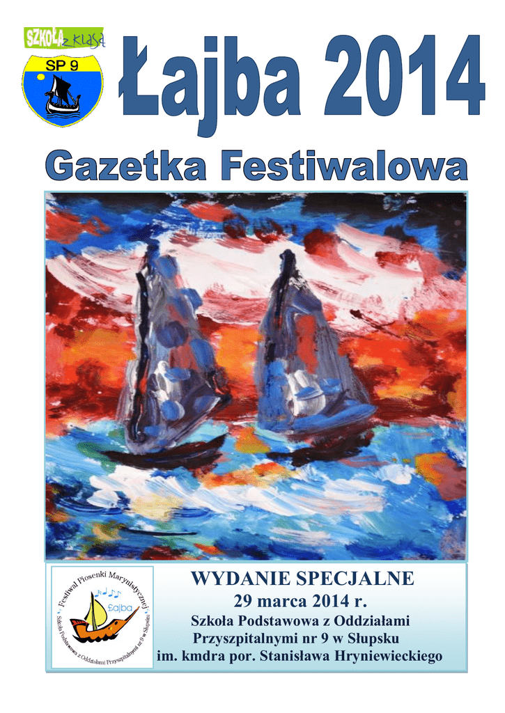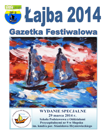 WYDANIE SPECJALNE 29 marca 2014 r. Szkoła Podstawowa z Oddziałami Przyszpitalnymi nr 9 w Słupsku im. kmdra por. Stanisława Hryniewieckiego 1 Mam ogromny zaszczyt otworzyć XVIII Festiwal Piosenki Marynistycznej „Łajba 2014”. Impreza ta, wraz z towarzyszącymi jej konkursami: XVI Ogólnopolskim Konkursem Plastycznym, XIII Ogólnopolskim Konkursem Dziennikarskim o „Laur Słupskich Kotwic”, pomaga młodym i uzdolnionym uczniom ze szkół podstawowych oraz domów i ośrodków kultury województwa pomorskiego rozwijać talenty muzyczne, plastyczne i dziennikarskie. Jest to jedna z piękniejszych form wyrażania emocji, wzbogacająca wiedzę o Pomorzu, województwie i naszym regionie. Cieszę się, że możemy podczas festiwalu delektować się pięknem zawartym w słowach i muzyce śpiewanej na żywo, ponieważ tak naprawdę, to ludzie są najważniejsi, i nawet najwspanialsze jachty bez nas nie popłyną. Z głębi serca bardzo dziękuję wszystkim, którzy poświęcili własny czas oraz swoje zdolności na organizację tego konkursu oraz przygotowanie znakomitych występów. Dziękuję za ofiarowaną pracę, za namysł nad wyborem utworów i ich ciekawe interpretacje. A wszystkim przyszłym zwycięzcom i wyróżnionym gratuluję. Uczestnikom Festiwalu, Publiczności, Gościom życzę najpiękniejszej podróży po niezgłębionych morzach muzyki, wielu wzruszeń i niezapomnianych przeżyć artystycznych. Paweł Dajer Dyrektor Szkoły Podstawowej z Oddziałami Przyszpitalnymi nr 9 w Słupsku SŁUPSKI INKUBATOR TECHNOLOGICZNY UL. PORTOWA 13 b 9.00 – występy uczniów szkół podstawowych 10.45 – PRZERWA obrady jury catering dla gości 11.30 – FINAŁ FESTIWALU ANDRZEJ KRÓLIKOWSKI PREZES ZARZĄDU GŁÓWNEGO LIGI MORSKIEJ rozdanie nagród w konkursie dziennikarskim I RZECZNEJ rozdanie nagród w konkursie plastycznym wręczenie nagród laureatom konkursu piosenki finałowy występ laureatów 2 KOLEJNOŚĆ PREZENTACJI Kategoria SOLIŚCI Lp. Zgłaszająca szkoła Wykonawca/Utwór 1 Szkoła Podstawowa w Zaleskich Imię i nazwisko opiekuna 2 Szkoła Podstawowa nr 4 w Słupsku 3 Dom Kultury w Ustce ROKSANA GARBOLIŃSKA Moja łódź ALEKSANDRA BARCIKOWSKA Latarnik JULIA MELNER Latarnia morska czuwa 4 Szkoła Podstawowa w Kobylnicy JULIA KUŚMIEREK Szekla 5 Szkoła Podstawowa w Wytownie 6 Wiejski Dom Kultury w Pobłociu JULIA WAŁCERZ Barbarossa Rafał Przybyło 7 Szkoła Podstawowa z Oddziałami Integracyjnymi nr 10 w Słupsku ADA TREDER Ballada o Wikingu Grzegorz Uszkiewicz 8 Szkoła Podstawowa w Zaleskich WERONIKA STĘPIEŃ Chłopcy! A-hoj! Urszula Tamulis 9 Gminny Ośrodek Kultury w Główczycach AGATA SZYMAŃSKA Pożegnalny ton Rafał Przybyło 10 Centrum Kultury Gminy Ustka ROKSANA BIAŁEK Syrena Zorza Sędzicka JOANNA PŁATWA Żeglarski czardasz 3 Mariola Wólczyńska Tomasz Ozdoba Urszula Tamulis Joanna Janulewicz-Nyc Zorza Sędzicka KOLEJNOŚĆ PREZENTACJI Kategoria ZESPOŁY Lp. Zgłaszająca szkoła Wykonawca Utwór Imię i nazwisko opiekuna 1 Szkoła Podstawowa w Zaleskich MINI WIOLINKI Żeglarski czardasz Mariola Wólczyńska 2 Szkoła Podstawowa nr 8 w Słupsku Zespół SŁONECZKA Wodny patrol Iwona Sazon 3 Szkoła Podstawowa nr 3 w Słupsku Zespół DO-RE-MI Nasza tratwa Monika Muszyńska Alicja Skrzypińska ZESPÓŁ „OSTINATO” Horn Grzegorz Uszkiewicz URWISY Zabiorę Cię w rejs Ewa Chowaniec 4 5 Szkoła Podstawowa z Oddziałami Integracyjnymi nr 10 w Słupsku w Słupsku Szkoła Podstawowa nr 3 w Słupsku 6 Szkoła Podstawowa nr 8 w Słupsku TĘCZA Stary jacht Natalia Hnatów 7 Niepubliczna Szkoła Podstawowa nr 7 w Słupsku SIÓDEMKA Przechyły Joanna Kaczmarska 4 6 marca 2014 roku komisja oceniła prace plastyczne nadesłane na konkurs. Komisji przewodniczyła p. Małgorzata Przewies. Członkami komisji były nauczycielki Szkoły Podstawowej z Oddziałami Przyszpitalnymi nr 9 w Słupsku p. Brygida Skolarus i p. Elżbieta Wojciechowska. Laureatów wyłoniono spośród autorów nadesłanych 400 prac. Kategoria: szkoła podstawowa klasy 0-3 Lp. Imię i nazwisko autora Imię i nazwisko opiekuna Joanna Chilczuk 1 Martyna Pawelec 2 Gracjan Krumplewski Zofia Szula 3 Oliwia Rezler Inez Janion 4 5 6 7 Dawid Wasilewski Iga Uchymiak Aleksandra Tabała Maciej Lewicki Agnieszka Kapczuk Anna Stabińska Anna Stabińska Anna Michalska Szkoła Miejsce I Społeczna Szkoła Podstawowa w Chełmie Szkoła Podstawowa z Oddziałami Integracyjnymi nr 4 w Słupsku Szkoła Podstawowa z Oddziałami Integracyjnymi nr 4 w Słupsku Zespół Szkół w Białce Zespół Szkół nr 3 w Zamościu Zespół Szkół nr 3 w Zamościu Szkoła Podstawowa w Nebrowie Wielkim I miejsce II miejsce III miejsce Wyróżnienie Wyróżnienie Wyróżnienie Wyróżnienie Kategoria: szkoła podstawowa klasy 4-6 Lp. Imię i nazwisko autora Imię i nazwisko opiekuna Mirosława Grynkiewicz 1 Alicja Bruździak 2 Emilia Zatorska Ewa Chowaniec 3 Martyna Gałek Wioletta Małachowska 4 Katarzyna Gołojuch Ewa Chowaniec 5 Ksawery Mielniczuk Ewa Szuchyta 6 Weronika Maniec Lilla Marciniak 7 Natalia Andrzejczuk Wioletta Małachowska 5 Szkoła Szkoła Podstawowa nr 3 w Lęborku Szkoła Podstawowa nr 3 w Słupsku Szkoła Podstawowa nr 3 w Słupsku Szkoła Podstawowa nr 3 w Słupsku Szkoła Podstawowa nr 2 w Słupsku Szkoła Podstawowa nr 1 w Ustce Szkoła Podstawowa nr 3 w Słupsku Miejsce I miejsce II miejsce III miejsce Wyróżnienie Wyróżnienie Wyróżnienie Wyróżnienie Kategoria: szkoła podstawowa – klasy 0-3 I miejsce Martyna Pawelec I Społeczna Szkoła Podstawowa w Chełmie op. Joanna Chilczuk II miejsce Gracjan Krumplewski Szkoła Podstawowa z Oddziałami Integracyjnymi nr 4 w Słupsku op. Zofia Szula III miejsce Oliwia Rezler Szkoła Podstawowa z Oddziałami Integracyjnymi nr 4 w Słupsku op. Inez Janion Wyróżnienie Dawid Wasilewski Zespół Szkół w Białce op. Agnieszka Kapczuk Wyróżnienie Iga Uchymiak Zespół Szkół nr 3 w Zamościu op. Anna Stabińska Wyróżnienie Aleksandra Tabała Zespół Szkół nr