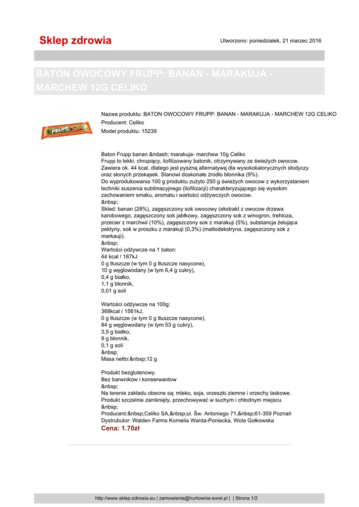 Sklep zdrowia Utworzono: poniedziałek, 21 marzec 2016 BATON OWOCOWY FRUPP: BANAN - MARAKUJA MARCHEW 12G CELIKO Nazwa produktu: BATON OWOCOWY FRUPP: BANAN - MARAKUJA - MARCHEW 12G CELIKO Producent: Celiko Model produktu: 15239 Baton Frupp banan – marakuja- marchew 10g Celiko Frupp to lekki, chrupiący, liofilizowany batonik, otrzymywany ze świeżych owocow. Zawiera ok. 44 kcal, dlatego jest pyszną alternatywą dla wysokokalorycznych słodyczy oraz słonych przekąsek. Stanowi doskonałe źrodło błonnika (9%). Do wyprodukowania 100 g produktu zużyto 250 g świeżych owocow z wykorzystaniem techniki suszenia sublimacyjnego (liofilizacji) charakteryzującego się wysokim zachowaniem smaku, aromatu i wartości odżywczych owocow. Skład: banan (28%), zagęszczony sok owocowy (ekstrakt z owocow drzewa karobowego, zagęszczony sok jabłkowy, zagęszczony sok z winogron, trehloza, przecier z marchwii (10%), zagęszczony sok z marakuji (5%), substancja żelująca pektyny, sok w proszku z marakuji (0,3%) (maltodekstryna, zagęszczony sok z markauji). Wartości odżywcze na 1 baton: 44 kcal / 187kJ 0 g tłuszcze (w tym 0 g tłuszcze nasycone), 10 g węglowodany (w tym 6,4 g cukry), 0,4 g białko, 1,1 g błonnik, 0,01 g soli Wartości odżywcze na 100g: 368kcal / 1561kJ, 0 g tłuszcze (w tym 0 g tłuszcze nasycone), 84 g węglowodany (w tym 53 g cukry), 3,5 g białko, 9 g błonnik, 0,1 g soli Masa netto: 12 g Produkt bezglutenowy. Bez barwnikow i konserwantow Na terenie zakładu obecne są: mleko, soja, orzeszki ziemne i orzechy laskowe. Produkt szczelnie zamknięty, przechowywać w suchym i chłodnym miejscu. Producent: Celiko SA, ul. Św. Antoniego 71, 61-359 Poznań Dystrubutor: Walden Farms Kornelia Warda-Poniecka, Wola Gołkowska Cena: 1.70zł http://www.sklep-zdrowia.eu | [email protected] | | Strona 1/2 Sklep zdrowia Utworzono: poniedziałek, 21 marzec 2016 BATON OWOCOWY FRUPP: BANAN - MARAKUJA MARCHEW 12G CELIKO Dostępność: Ten produkt został dodany do sklepu w dniu poniedziałek, 21 marzec 2016 http://www.sklep-zdrowia.eu | [email protected] | | Strona 2/2