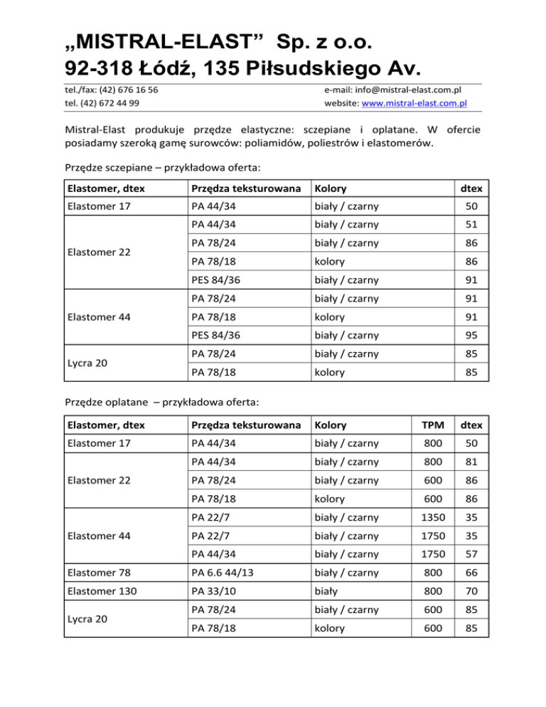 „MISTRAL-ELAST” Sp. z o.o. 92-318 Łódź, 135 Piłsudskiego Av. tel./fax: (42) 676 16 56 tel. (42) 672 44 99 e-mail: [email protected] website: www.mistral-elast.com.pl Mistral-Elast produkuje przędze elastyczne: sczepiane i oplatane. W ofercie posiadamy szeroką gamę surowców: poliamidów, poliestrów i elastomerów. Przędze sczepiane – przykładowa oferta: Elastomer, dtex Przędza teksturowana Kolory Elastomer 17 PA 44/34 biały / czarny 50 PA 44/34 biały / czarny 51 PA 78/24 biały / czarny 86 PA 78/18 kolory 86 PES 84/36 biały / czarny 91 PA 78/24 biały / czarny 91 PA 78/18 kolory 91 PES 84/36 biały / czarny 95 PA 78/24 biały / czarny 85 PA 78/18 kolory 85 Elastomer 22 Elastomer 44 Lycra 20 dtex Przędze oplatane – przykładowa oferta: Elastomer, dtex Przędza teksturowana Kolory TPM dtex Elastomer 17 PA 44/34 biały / czarny 800 50 PA 44/34 biały / czarny 800 81 PA 78/24 biały / czarny 600 86 PA 78/18 kolory 600 86 PA 22/7 biały / czarny 1350 35 PA 22/7 biały / czarny 1750 35 PA 44/34 biały / czarny 1750 57 Elastomer 78 PA 6.6 44/13 biały / czarny 800 66 Elastomer 130 PA 33/10 biały 800 70 PA 78/24 biały / czarny 600 85 PA 78/18 kolory 600 85 Elastomer 22 Elastomer 44 Lycra 20