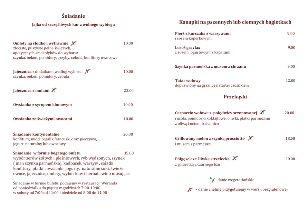 Śniadanie Kanapki na pszennych lub ciemnych bagietkach Jajka od szczęśliwych kur z wolnego wybiegu Omlety na słodko i wytrawnie złociste, puszyste pełne świeżych, apetycznych smakołyków do wyboru: szynka, bekon, pomidory, grzyby, cebula, konfitury owocowe 10.00 Jajecznica z dodatkami według wyboru: szynka, bekon, pomidory, cebula 10.00 Jajecznica z mulami 22.00 Pierś z kurczaka z warzywami i sosem koperkowym 9.00 Łosoś gravlax z sosem jogurtowym z kaparami 9.00 Szynka parmeńska z musem z chrzanu 9.00 Tatar wołowy doprawiony na grzance natartej czosnkiem 12.00 Przekąski Owsianka z syropem klonowym 10.00 Owsianka ze świeżymi owocami 10.00 Śniadanie kontynentalne konfitury, miód, rogalik francuski oraz pieczywo, jogurt naturalny lub owocowy 20.00 Śniadanie w formie bogatego bufetu 35.00 wybór serów żółtych i pleśniowych, ryb wędzonych, szynek ( m.in szynka parmeńska), kiełbasek, warzyw , sałatki, konfitury, płatki i owsianki, jogurty, naturalne soki, świeże owoce, jajecznice, omlety, wybór kaw i herbat , wino musujące Śniadanie w formie bufetu podajemy w restauracji Weranda od poniedziałku do piątku w godzinach 7:00-10:00 w soboty od 7:00 od 11:00 i niedziele od 8:00 do 11:00 Carpaccio wołowe z polędwicy sezonowanej rucola, pomidorki koktajlowe, oliwki, płatki parmezanu z oliwą i octem balsamico 20.00 Grillowany melon z szynką prosciutto i musem z parmezanu 18.00 Półgęsek ze śliwką strzelecką z galaretką z czarnego bzu 20.00 -danie wegetariańskie - danie chętnie przygotujemy w wersji bezglutenowej Lunch od poniedziałku do piątku Zupy Tradycyjny polski żurek z jajkiem Sałatki Sałatka z rostbefem Krem z pieczonego buraka 18.00 ogórki kiszone, marynowany burak, pomidorki cherry i dip z anchois Sałatka grecka oryginalna grecka feta, dorodne pomidory, ogórki, sałata lodowa, zioła, oliwa z oliwek, sok cytrynowy 18.00 Sałatka cezar 18.00 Bulion wołowy Consome grzybowe Krem korzenia pietruszki z gałką muszkatołową i pikantnym borowikiem Dania główne Filet drobiowy z żurawiną, marchewką i brokułem oraz pieczonym ziemniakiem pierś z kurczaka z sałatami i anchois Udo z kaczki duszone w bakaliach, podane z pampuchem drożdżowym, karmelizowaną gruszką w miodzie z tymiankiem i młodą kapustą na słodko-kwaśno Łosoś z pieca na salsie z warzyw , z gotowanym ziemniakiem z koperkiem, brokułem i sosem śmietanowo-borowikowym Bliny z mąki gryczanej podane z sandaczem w śmietanie z cukinią i orzechową rukolą -danie wegetariańskie - danie chętnie przygotujemy w wersji bezglutenowej Soczewica beluga z sezonowymi warzywami i grzyby smażone na oleju rzepakowym w asyście ziół Słodka niespodzianka Deser 30.00zł ( wybrana zupa, danie główne, deser) Lody i sorbety Desery Sernik z gorącą konfiturą z wiśni 12.00 Chrupiąca beza z kremem angielskim z płatkami kasztanów, orzechami i daktylami 16.00 Fondue czekoladowe z owocami 16.00 Domowe lody chałwowe ze świeżymi owocami 15.00 Domowe lody na bazie białej czekolady ze skórką z limonki i pomarańczy, z korą cynamonową podane na pure z jabłek i śliwowicy 15.00 Sorbet truskawkowy z chili i jogurtem greckim 14.00 Créme brûlé z młotkowanym pieprzem 14.00 14.00 14.00 Eton mess – tradycyjny angielski deser ten misz – masz stanowią pokruszone bezy, bita śmietana i owoce Dymiące cygaro z kremem kawowym z kieliszkiem rumu Havana Club 30.00 Suflet czekoladowy z sorbetem z porzeczek 20.00 Praliny z lokalnych serów zagrodowych 18.00 Selekcja trzech deserów na jednym talerzu (Suflet czekoladowy, Créme brûlé i Eton mess) 20.00 Pucharek gorących malin z płynną czekoladą i zmrożoną gałką lodów waniliowych Sorbet cytrynowy z szampanem Sorbety i lody o różnych smakach, Mrożone w sposób molekularny przy stole 15.00 40.00 -danie wegetariańskie - danie chętnie przygotujemy w wersji bezglutenowej Herbaty liściaste Świeżo mielona kawa i czekolada na gorąco Polecamy z konfiturą różaną lub malinami w syropie 5.00 Caffe creme 5.00 Espresso 5.00 Cappuccino 7.00 Kawa po wiedeńsku 9.00 Rooibos vanilla - czerwonokrzew z dodatkiem kawałków wanilii 7.00 Pomarańczowa caffe creme z bitą śmietaną Cointreau 20 ml, skórka pomarańczy 12.00 Herbata zielona Sonne asiens royal 7.00 zielona Sencha wzbogacona trawą cytrynową i kwiatami Saflory Kawa z advocatem i bitą śmietaną Advocat 40ml 12.00 Owoce letnie - kawalki jabłek i papai płatków hibiskusa, skórek dzikiej róży, owoców bzu 7.00 Latte machiato z Baileisem Baileis 30 ml, espresso, mleko 12.00 Ogród ziołowy- mieszanka ziołowa z trawy cytrynowej mięty Nana, czerwonokrzewu i korzenia lukrecji 7.00 Irish coffee whiskey, bita śmietana, cukier trzcinowy 12.00 Herbata miętowa grubo krojone, aromatyczne liście mięty pieprzowej 7.00 Latte Machiato 250/450ml 8.00/12.00 warstwowa kawa na bazie espresso z delikatną mleczną pianą Latte Machiato z syropem 250/450ml do wyboru: waniliowy, karmelowy lub amaretto Kawa zielona Czekolada na gorąco z bitą śmietaną 9.00/13.00 10.00 250/450ml 8.00/12.00 Herbata czarna- Darjeeling royal second flush 7.00 Earl grey – szlachetna mieszanka z owocem bergamotki 7.00 Herbata czarna z laską cynamonu, anyżem, jabłkiem i pomarańczą 250/450ml Miodowa herbata z whisky (40 ml), goździki i skórka z cytryny Herbata zielona z trawą cytrynową, z imbirem i limonką 11.00/14.00 13.00 250/450ml 11.00/14.00 Napoje zimne Wina wytrawne 100ml Soki owocowe 200ml 5.00 Soki wyciskane z pomarańczy i grejpfrutów 200ml 10.00 Sok pomidorowy 200ml 5.00 Pepsi, Mirinda, 7up, Tonic 200ml 5.00 Woda Cisowianka gazowana/niegazowana 300/700ml 5.00/10.00 Piwo bezalkoholowe 300ml 8.00 Piwo Bydgoskie 400ml 8.00 Piwo pszeniczne 500ml 10.00 Wino białe, wytrawne 8.00 Wino czerwone, wytrawne 8.00 Wina deserowe 100ml Wino półsłodkie czerwone 10.00 Tokaj Aszu III puttonowy 20.00 Porto 20 Years Old Port Osborne 30.00 Koniak i Brandy 40ml Orzeźwiające drinki i koktajle Ki