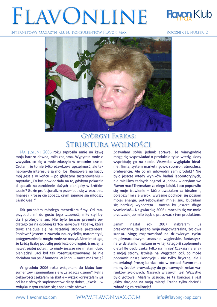 FlavOnline Internetowy Magazyn Klubu Konsumentów Flavon max Rocznik II. numer: 2 Györgyi Farkas: Struktura wolności Na jesieni 2006 roku zaprosiła mnie na kawę moja bardzo dawna, miła znajoma. Wypytała mnie o wszystko, co się u mnie zdarzyło w ostatnim czasie. Czułam, że to nie tylko zdawkowa uprzejmość, ale tak naprawdę interesuje ją mój los. Reagowała na każdy mój gest a w końcu – po głębszym zastanowieniu – zapytała: „Co byś powiedziała na to, gdybym pokazała ci sposób na zarobienie dużych pieniędzy w krótkim czasie? Gdzie profesjonalizm przekłada się wreszcie na finanse? Proszę cię zobacz, czym zajmuje się młodszy László Gaál.” Tak poznałam młodego menedżera fimy. Od razu przypadła mi do gustu jego szczerość, miły styl bycia i profesjonalizm. Nie było jeszcze prezenterów, dlatego też na osobnej kartce narysował tabelkę, która teraz znajduje się na ostatniej stronie prezentera. Ponieważ jestem z zawodu nauczycielką matematyki, potęgowanie nie mogło mnie zaskoczyć. Ale mimo tego, że każdą liczbę potrafię podnieść do drugiej, trzeciej, a nawet piątej potęgi, to nigdy jeszcze nie miałam dużo pieniędzy! Laci był tak rozentuzjazmowany, że nie chciałam mu psuć humoru. W końcu – może ma i rację? W grudniu 2006 roku wstąpiłam do klubu konsumentów i zamieniłam się w „zjadacza dżemu”. Pełna ciekawości czekałam na skutki – wszak korzystałam już od lat z różnych suplementów diety dobrej jakości i w związku z tym czułam się absolutnie zdrowa. Zdawałam sobie jednak sprawę, że wiarygodnie mogę się wypowiadać o produkcie tylko wtedy, kiedy wypróbuję go na sobie. Wszystko wyglądało idealnie: firma, system marketingowy, sponsor, atmosfera, preferencje. Ale co mi udowodni sam produkt? Nie było jeszcze wtedy wyników badań laboratoryjnych, nie mieliśmy żadnych nagród. A jednak wierzyłam we Flavon max! Trzymałam za niego kciuki. I oto poprawiło się moje trawienie – które uważałam za idealne -, polepszył mi się wzrok, wyraźnie podniósł się poziom mojej energii, potrzebowałam mniej snu, budziłam się bardziej wypoczęta i można by jeszcze długo wymieniać... Na gwiazdkę 2006 umocniło się we mnie przeczucie, że miło będzie pracować z tym produktem. Zanim nastał rok 2007 nabrałam już przekonania, że jest to moja niepowtarzalna, życiowa szansa. Mogę rozprowadzać na dziewiczym rynku międzynarodowym smaczne, węgierskie, fantastyczne w działaniu i najtańsze w tej kategorii suplementy diety! Ile osób czeka tylko na mnie? Czekają na znak z mojej strony. Istnieje na Węgrzech coś, co może poprawić naszą kondycję - nie tylko fizyczną, ale i materialną! Proszę bardzo: oto w postaci Flavon max mamy środek prowadzący do gruntownych zmian warunków życiowych. Naszych własnych też! Wszystko było gotowe. Miałam uczucie, że ta koncepcja jest jakby skrojona na moją miarę! Trzeba tylko chcieć i zabrać się za realizację! www.flavonmax.com www.flavonmax.com [email protected] FlavOnline Podjęłam więc decyzję, że pokażę mojej rodzinie, znajomym a przede wszystkim sobie, na co mnie jeszcze stać po dwóch dziesięcioleciach „urlopu wychowawczego”. Zabrałam się za budowanie biznesu w styczniu 2007 roku. Miałam mało czasu, za to wielki zapał! Postanowiłam, że codziennie zaprezentuję Flavon max dwóm osobom. Jeśli jedno spotkanie nie dojdzie do skutku, muszę je w jak najkrótszym czasie zastąpić innym. Dokądkolwiek szłam, zawsze miałam przy sobie słoiczek do degustacji, prezenter, umowę członkowską. Byłam w stanie przeprowadzić rozmowę gdziekolwiek, kiedykolwiek, mając nawet mało czasu. W ciągu dwóch tygodni przyłączyło się do mnie 9 nowych członków klubu. Akurat w styczniu 2007 wystartowały w Budapeszcie cotygodniowe, publiczne prezentacje w Hotelu Ibis. To była ogromna pomoc. W dalszym ciągu stanowi pomoc. Do dziś dnia mam zwyczaj liczyć, ilu moich ludzi bierze w niej udział. Widać to zresztą po efektach. Jest nas coraz więcej i mamy coraz większe obroty. Po zamknięciu miesiąca lubię widzieć nie tylko to, którzy członkowie mojej grupy otrzymają kartony promocyjne i ile tych kartonów, ale cieszy mnie też widok nazwisk nowych członków, wstępujących do klubu. (Nie tylko front, ale i głębokość) Dziękuję mojemu sponsorowi, Krystynie Jungné Kovács, za to, że pomyślała o mnie i zajęła się mną. Dziękuję jej za ogromną pomoc, poparcie, opiekę i sympatię, które od niej systematycznie otrzymuję. Dziękuję za naukę. Dziękuję młodszemu László Gaál za to, że pomógł mi stawiać pierwsze kroki i za to, że od tego czasu nieustannie okazuje mi uwagę. Dziękuję moim przyjaciołom, że mi zaufali i przyłączyli się do mnie. Dziękuję Wam - Ildikó, Marcsi, Zsuzsi, Ildikó, Izabell, Éva, Franciska, Judit, Zsuzsi za Waszą współpracę. Dziękuję członkom mojej grupy: Ági, Laci, Kriszta, Zsuzsi, Babi, Évike, Irénke, za to, że biorą sobie do serca moje wskazówki i wykonują codziennie to, co do nich należy. Na przełomie stycznia 2007 nic jeszcze nie wiedziałam o programie kartonów promocyjnych. Kiedy usłyszałam, że można otrzymać w prezencie kartony, byłam pewna, że je zdobędę. To była chyba jedyna prawdziwa batalia. Pozostałe poziomy przychodziły bez walki, automatycznie, bez wysiłku i – co najważniejsze – bez przemocy. Nikt nie dokonywał zakupów niepotrzebnie! W marcu osiągnęłam poziom Millionaire, w maju – Millionaire Plus a w październiku Elite. Już pierwsze bonusy stanowiły największe pobory w moim dotychczasowym życiu. Nigdy jeszcze, w żaden sposób tyle nie zarobiłam! I zawsze pierwsza cyfra sześciocyfrowego bonusu harmonizowała z kolejnym numerem miesiąca: w lutym bonus zaczynał się dwójką, w marcu trójką, w kwietniu czwórką, tylko w maju od razu szóstką. Ale to już sama przyjemność! Naprawdę istot