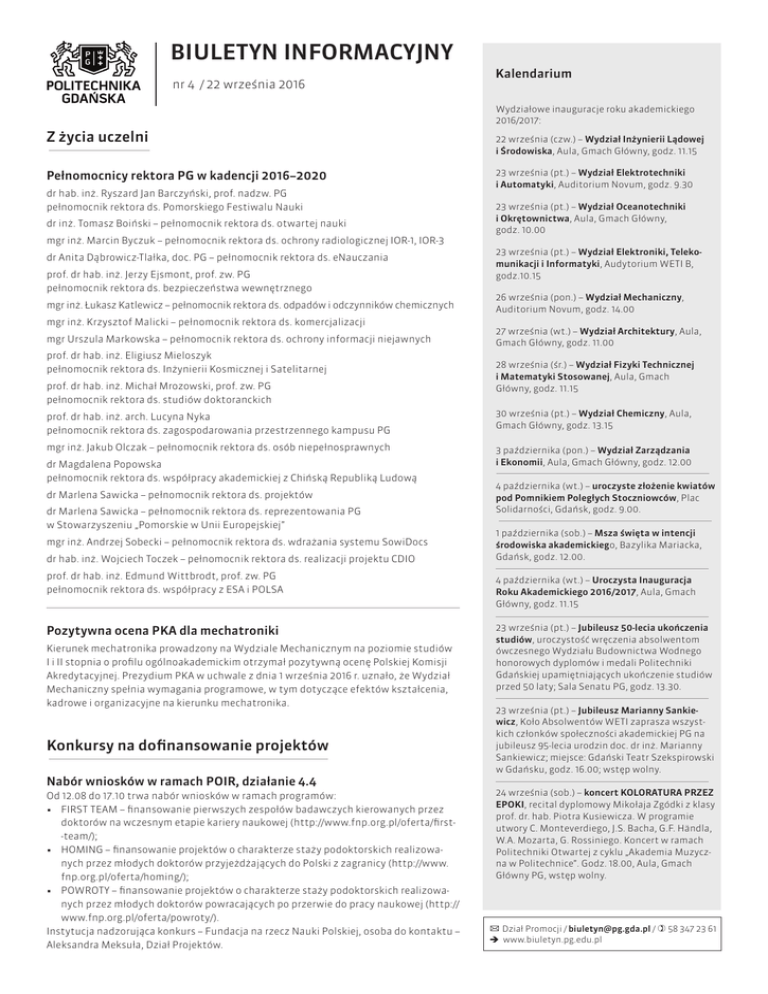 BIULETYN INFORMACYJNY nr 4 / 22 września 2016 Kalendarium Wydziałowe inauguracje roku akademickiego 2016/2017: Z życia uczelni Pełnomocnicy rektora PG w kadencji 2016–2020 dr hab. inż. Ryszard Jan Barczyński, prof. nadzw. PG pełnomocnik rektora ds. Pomorskiego Festiwalu Nauki dr inż. Tomasz Boiński – pełnomocnik rektora ds. otwartej nauki mgr inż. Marcin Byczuk – pełnomocnik rektora ds. ochrony radiologicznej IOR-1, IOR-3 dr Anita Dąbrowicz-Tlałka, doc. PG – pełnomocnik rektora ds. eNauczania prof. dr hab. inż. Jerzy Ejsmont, prof. zw. PG pełnomocnik rektora ds. bezpieczeństwa wewnętrznego mgr inż. Łukasz Katlewicz – pełnomocnik rektora ds. odpadów i odczynników chemicznych mgr inż. Krzysztof Malicki – pełnomocnik rektora ds. komercjalizacji mgr Urszula Markowska – pełnomocnik rektora ds. ochrony informacji niejawnych prof. dr hab. inż. Eligiusz Mieloszyk pełnomocnik rektora ds. Inżynierii Kosmicznej i Satelitarnej prof. dr hab. inż. Michał Mrozowski, prof. zw. PG pełnomocnik rektora ds. studiów doktoranckich 22 września (czw.) – Wydział Inżynierii Lądowej i Środowiska, Aula, Gmach Główny, godz. 11.15 23 września (pt.) – Wydział Elektrotechniki i Automatyki, Auditorium Novum, godz. 9.30 23 września (pt.) – Wydział Oceanotechniki i Okrętownictwa, Aula, Gmach Główny, godz. 10.00 23 września (pt.) – Wydział Elektroniki, Telekomunikacji i Informatyki, Audytorium WETI B, godz.10.15 26 września (pon.) – Wydział Mechaniczny, Auditorium Novum, godz. 14.00 27 września (wt.) – Wydział Architektury, Aula, Gmach Główny, godz. 11.00 28 września (śr.) – Wydział Fizyki Technicznej i Matematyki Stosowanej, Aula, Gmach Główny, godz. 11.15 prof. dr hab. inż. arch. Lucyna Nyka pełnomocnik rektora ds. zagospodarowania przestrzennego kampusu PG 30 września (pt.) – Wydział Chemiczny, Aula, Gmach Główny, godz. 13.15 mgr inż. Jakub Olczak – pełnomocnik rektora ds. osób niepełnosprawnych 3 października (pon.) – Wydział Zarządzania i Ekonomii, Aula, Gmach Główny, godz. 12.00 dr Magdalena Popowska pełnomocnik rektora ds. współpracy akademickiej z Chińską Republiką Ludową dr Marlena Sawicka – pełnomocnik rektora ds. projektów dr Marlena Sawicka – pełnomocnik rektora ds. reprezentowania PG w Stowarzyszeniu „Pomorskie w Unii Europejskiej” mgr inż. Andrzej Sobecki – pełnomocnik rektora ds. wdrażania systemu SowiDocs dr hab. inż. Wojciech Toczek – pełnomocnik rektora ds. realizacji projektu CDIO prof. dr hab. inż. Edmund Wittbrodt, prof. zw. PG pełnomocnik rektora ds. współpracy z ESA i POLSA Pozytywna ocena PKA dla mechatroniki Kierunek mechatronika prowadzony na Wydziale Mechanicznym na poziomie studiów I i II stopnia o profilu ogólnoakademickim otrzymał pozytywną ocenę Polskiej Komisji Akredytacyjnej. Prezydium PKA w uchwale z dnia 1 września 2016 r. uznało, że Wydział Mechaniczny spełnia wymagania programowe, w tym dotyczące efektów kształcenia, kadrowe i organizacyjne na kierunku mechatronika. Konkursy na dofinansowanie projektów Nabór wniosków w ramach POIR, działanie 4.4 Od 12.08 do 17.10 trwa nabór wniosków w ramach programów: • FIRST TEAM – finansowanie pierwszych zespołów badawczych kierowanych przez doktorów na wczesnym etapie kariery naukowej (http://www.fnp.org.pl/oferta/first-team/); • HOMING – finansowanie projektów o charakterze staży podoktorskich realizowanych przez młodych doktorów przyjeżdżających do Polski z zagranicy (http://www. fnp.org.pl/oferta/homing/); • POWROTY – finansowanie projektów o charakterze staży podoktorskich realizowanych przez młodych doktorów powracających po przerwie do pracy naukowej (http:// www.fnp.org.pl/oferta/powroty/). Instytucja nadzorująca konkurs – Fundacja na rzecz Nauki Polskiej, osoba do kontaktu – Aleksandra Meksuła, Dział Projektów. 4 października (wt.) – uroczyste złożenie kwiatów pod Pomnikiem Poległych Stoczniowców, Plac Solidarności, Gdańsk, godz. 9.00. 1 października (sob.) – Msza święta w intencji środowiska akademickiego, Bazylika Mariacka, Gdańsk, godz. 12.00. 4 października (wt.) – Uroczysta Inauguracja Roku Akademickiego 2016/2017, Aula, Gmach Główny, godz. 11.15 23 września (pt.) – Jubileusz 50-lecia ukończenia studiów, uroczystość wręczenia absolwentom ówczesnego Wydziału Budownictwa Wodnego honorowych dyplomów i medali Politechniki Gdańskiej upamiętniających ukończenie studiów przed 50 laty; Sala Senatu PG, godz. 13.30. 23 września (pt.) – Jubileusz Marianny Sankiewicz, Koło Absolwentów WETI zaprasza wszystkich członków społeczności akademickiej PG na jubileusz 95-lecia urodzin doc. dr inż. Marianny Sankiewicz; miejsce: Gdański Teatr Szekspirowski w Gdańsku, godz. 16.00; wstęp wolny. 24 września (sob.) – koncert KOLORATURA PRZEZ EPOKI, recital dyplomowy Mikołaja Zgódki z klasy prof. dr. hab. Piotra Kusiewicza. W programie utwory C. Monteverdiego, J.S. Bacha, G.F. Händla, W.A. Mozarta, G. Rossiniego. Koncert w ramach Politechniki Otwartej z cyklu „Akademia Muzyczna w Politechnice”. Godz. 18.00, Aula, Gmach Główny PG, wstęp wolny. ✉ Dział Promocji / [email protected] / 58 347 23 61 www.biuletyn.pg.edu.pl Nabór wniosków w ramach POIR, poddziałanie 1/4.1.4/2016/POIR Od 3.10 do 3.11 trwa nabór wniosków w ramach programu POIR, poddziałanie 4.1.4 Projekty Aplikacyjne (konkurs 1/4.1.4/2016/POIR). Dofinansowanie udzielane jest na realizację projektów, które obejmują badania przemysłowe i eksperymentalne prace rozwojowe albo eksperymentalne prace rozwojowe (http://www.ncbir.pl/fundusze-europejskie/poir/konkursy/konkurs14142016/). Instytucja nadzorująca konkurs – NCBiR, osoba do kontaktu – Aleksandra Meksuła, Dział Projektów. Nabór wniosków w ramach POPC, poddziałanie 2.3.1 Od 30.09.2016 do 10.01.2017 trwa nabór wniosków w ramach programu POPC, poddziałanie 2.3.1 Cyfrowe udostę