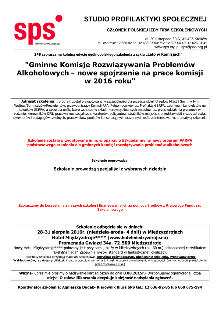 STUDIO PROFILAKTYKI SPOŁECZNEJ CZŁONEK POLSKIEJ IZBY FIRM SZKOLENIOWYCH al. 29 Listopada 39 A, 31-425 Kraków tel. centrala: 12 636 92 85, 12 636-37 93; fax: 12 626 94 40, 12 626 94 41 www.sps.org.pl [email protected] SPS zaprasza na kolejną edycję ogólnopolskiego szkolenia z cyklu „Lato w Komisjach” "Gminne Komisje Rozwiązywania Problemów Alkoholowych – nowe spojrzenie na prace komisji w 2016 roku" Adresat szkolenia: : program został przygotowany w szczególności dla przedstawicieli Urzędów Miast i Gmin, w tym Wójtów/Burmistrzów/Prezydentów, przewodniczący Komisji RPA, Pełnomocników ds. Profilaktyki i RPA, członków i kandydatów na członków GKRPA, a także dla osób, które wchodzą w skład interdyscyplinarnych zespołów ds. przeciwdziałania przemocy w rodzinie, kierowników OPS, pracowników socjalnych, kuratorów, policjantów, strażników miejskich, przedstawicieli służby zdrowia, dyrektorów i pedagogów szkolnych, pracowników punktów konsultacyjnych oraz innych osób zainteresowanych tematyką szkolenia Szkolenie zostało przygotowane m.in. w oparciu o 53-godzinny ramowy program PARPA podstawowego szkolenia dla gminnych komisji rozwiązywania problemów alkoholowych Szkolenie poprowadzą: Szkolenie prowadzą specjaliści z wybranych dziedzin Zapraszamy do korzystania z naszych szkoleń i finansowania ich za pomocą środków z Krajowego Funduszu Szkoleniowego Szkolenie odbędzie się w dniach: 28-31 sierpnia 2016r. (niedziela-środa- 4 dni!) w Międzyzdrojach Hotel Międzyzdroje**** (www.hotelmiedzyzdroje.eu) Promenada Gwiazd 34a, 72-500 Międzyzdroje Nowy Hotel Międzyzdroje**** położony jest przy samej plaży w Międzyzdrojach (ok. 60 m.) odznaczonej certyfikatem “Błękitna flaga”. Zapewnia wysoki standard w fantastycznej lokalizacji. Uczestnicy szkolenia otrzymują materiały szkoleniowe, certyfikat poświadczający ukończenie szkolenia, sygnowany przez Wykładowców, z zakresu profilaktyki i rpa., w oparciu o wymóg art. 41 ust. 4 ustawy o wychowaniu w trzeźwości (wymóg odbycia przeszkolenia przez członków KRPA.) Ważne- uprzejmie prosimy o nadsyłanie kart zgłoszeń do dnia 8.08.2015r.- Dysponujemy ograniczoną liczbą miejsc. O zakwalifikowaniu decyduje kolejność nadsyłania zgłoszeń. Koordynator szkolenia: Agnieszka Dudek- Kierownik Biura SPS tel.: 12 636-92-85 lub 660 675-194 STUDIO PROFILAKTYKI SPOŁECZNEJ CZŁONEK POLSKIEJ IZBY FIRM SZKOLENIOWYCH al. 29 Listopada 39 A, 31-425 Kraków tel. centrala: 12 636 92 85, 12 636-37 93; fax: 12 626 94 40, 12 626 94 41 www.sps.org.pl [email protected] PROGRAM SZKOLENIA: "Gminne Komisje Rozwiązywania Problemów Alkoholowych – nowe spojrzenie na prace komisji w 2016 roku" 28-31.08.2016r. - Hotel Międzyzdroje**** w Międzyzdrojach 28.08.2016r. (niedziela) Przyjazd i zakwaterowanie uczestników szkolenia od godz. 15.00 w „Hotel Międzyzdroje****” 29.08.2016r. (poniedziałek) Co nowego w pomaganiu osobom uzależnionym od alkoholu? 07.30-09.00 Śniadanie (13.00-14.00 Obiad) 09.00 Powitanie, omówienie harmonogramu szkolenia, rozpoczęcie szkolenia 09.00-15.30 Co nowego w pomaganiu osobom uzależnionym od alkoholu? W ostatnich latach można zaobserwować poważne zmiany w organizacji i metodach leczenia osób uzależnionych od alkoholu. Część z tych zmian wynika z konieczności dostosowania się do warunków finansowania placówek leczenia uzależnienia od alkoholu, część zaś – to następstwo uwzględnienia w praktyce klinicznej wyników badań dotyczących efektywności różnych strategii pomagania osobom uzależnionym. Rodzaje zaburzeń pojawiających się w wyniku spożywania alkoholu. Jak piją dorośli Polacy? Epidemiologia zaburzeń spowodowanych spożywaniem alkoholu. Zmiany w klasyfikacjach diagnostycznych zaburzeń wynikających z używania alkoholu. Cele pomagania osobom uzależnionym od alkoholu: abstynencja czy redukcja szkód? Kiedy abstynencja jest najlepszym wyjściem? Komu można zaproponować pracę nad ograniczaniem spożywania alkoholu? Strategie pracy z osobami uzależnionymi nakierowane na redukcję ilości wypijanego alkoholu. Standardy świadczeń w zakresie leczenia uzależnień w Polsce: koszyk świadczeń gwarantowanych. System lecznictwa odwykowego w Polsce, organizacja, finansowanie Pacjenci lecznictwa odwykowego: osoby pijące problemowo i członkowie ich rodzin Metody leczenia uzależnienia od alkoholu: psychoterapia i farmakoterapia Ocena jakości pracy placówek leczenia uzależnienia od alkoholu Rehabilitacja osób uzależnionych od alkoholu 15.30-19.30 Czas wolny. Dla zainteresowanych wycieczka piesza z przewodnikiem do Rezerwatu Żubrów od 19.30 Kolacja uroczysta połączona z dyskoteką 30.08.2016r. (wtorek) Szkody wynikające z picia alkoholu przez kobiety w ciąży – profilaktyka FASD w społeczności lokalnej. Lokalny system pomocy dzieciom z rodzin z problemem alkoholowym – zasoby i wyzwania. Pomoc dzieciom z rodzin z problemem alkoholowym w kontekście pracy z rodziną- jak wyznaczać kierunki działań? 07.30-09.00 Śniadanie (13.00-14.00 Obiad) 09.00-15.30 Szkody wynikające z picia alkoholu przez kobiety w ciąży – profilaktyka FASD w społeczności lokalnej. Rozpowszechnienie picia alkoholu przez kobiety w ciąży w Polsce, a częstość występowania FASD. Szkody zdrowotne płodu wywołane piciem alkoholu przez kobiety w ciąży Problemy funkcjonowania dzieci z FASD Pomaganie dzieciom i rodzinom z FASD Działania profilaktyczne w obszarze FASD w gminach STUDIO PROFILAKTYKI SPOŁECZNEJ CZŁONEK POLSKIEJ IZBY FIRM SZKOLENIOWYCH al. 29 Listopada 39 A, 31-425 Kraków tel. centrala: 12 636 92 85, 12 636-37 93; fax: 12 626 94 40, 12 626 94 41 www.sps.org.pl [email protected] Lokalny system pomocy dzieciom z rodzin z problemem alkoholowym – zasoby i wyzwania Potrzeby dzieci a potrzeby rodzin z problemem alkoholowym Rola i zadania świetlic socjoterapeutycznych i innych form pomocy dzieciom Współpraca interdyscyplinarna 