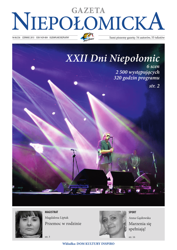 Nr 06/236 CZERWIEC 2013 ISSN 1429-004 EGZEMPLARZ BEZPŁATNY Sami piszemy gazetę: 54 autorów, 55 tekstów XXII Dni Niepołomic 6 scen 2 500 występujących 320 godzin programu str. 2 MAGISTRAT SPORT Magdalena Liptak Anna Gąsłowska Przemoc w rodzinie Marzenia się spełniają! str. 3 str. 16 Wkładka: DOM KULTURY INSPIRO XXII Dni Niepołomic czytaj str. 2 Czerwiec 2013 NA POCZĄTEK GAZETA NIEPOŁOMICKA Szanowni Państwo! 2500 występujących na sześciu scenach, 320 godzin programu. Imponujące. Cieszmy się, że jako nieliczne miasto w Polsce, mamy takie święto. Chciałbym także zwrócić Państwa uwagę na przykre zjawisko przemocy w rodzinie. O problemie tym pisze na stronie 3 Magdalena Liptak, zachęcając przy tym do korzystania z Punktu Informacji, Wsparcia i Pomocy Ofiarom i Sprawcom Przemocy w Rodzinie. Przemoc w rodzinie to problem nas wszystkich. Jeśli nie bezpośrednio, to może naszych sąsiadów. A sąsiedztwo zobowiązuje! Interesujmy się, co dzieje się obok. Miejmy nadzieję, że czasy tzw. znieczulicy to już niechlubna przeszłość. Mieszkając obok siebie tworzymy bowiem wspólnotę. Wspólnota zaś wymaga wzajemnego zainteresowania. Może nie każdy ma siłę uporać się z własnym problemem i czeka na naszą reakcję. Pomagajmy. Zapraszam do lektury Artur Negri redaktor naczelny W numerze: MAgisTrAT 2 2 500 osób na scenie 2 Statystyka – kwiecień 2013 3 Przemoc w rodzinie FAKTy 4 Florian 2013 5 Euro 6 nadjeżdża EDUKACJA 6 Biblioterapia 7 Wajda burmistrzem 8 Znawcy wędkarstwa 8 Twardzik na medal 9 Pytanie o autorytet 10 Z przyrodą za pan brat 11 Znam, stosuję 11 Do Brukseli 12 Tygryski w drukarni 13 Za pan brat 13 Bajkoteka 14 Misie i Krasnoludki w Balicach 14 Przyjaciele z Ukrainy hArCErsTwO 15 Korzeń w Warszawie sPOrT 16 Marzenia się spełniają! 16 Z najlepszymi 17 Pingpongowy zawrót 18 Półmetek usportowionej szkoły 19 Najlepsze na świecie 20 Już od 4 roku 20 Zlot Rowerowy 21 26 medali w Krośnie 22 W maju niepokonani wKŁADKA DOM KULTURY INSPIRO MAgAZyN 23 Ameryka jest inna, niż myślicie część 1 25 Zosia samosia 26 Retuszowanie rzeczywistości GAZETA NIEPOŁOMICKA Adres redakcji: 32-005 Niepołomice, ul. Zamkowa 5, tel. 12 378 35 01, faks 12 281 19 91 e-mail: [email protected] Pismo należy do Polskiego Stowarzyszenia Prasy Lokalnej. Nakład: 4000 egz. Redaktor naczelny: Artur Negri www.niepolomice.eu Wydawca: Urząd Miasta i Gminy w Niepołomicach pl. Zwycięstwa 13, 32-005 Niepołomice Sekretarz redakcji: Joanna Kocot Tekstów niezamówionych redakcja nie zwraca, ponadto zastrzega sobie prawo do skracania artykułów i kore- 27 29 30 31 33 34 35 36 37 38 39 Księża przy klasztorze Recenzje Spojrzenie w czerwcowe niebo Napiszmy razem historię Woli Batorskiej Niepołomiczanie w Powstaniu Styczniowym FraszkoTerapia bez recepty – Marcin Urban Nieśmiertelna Jane Austen Umowa zlecenie Deregulacja zawodów związanych z rynkiem nieruchomości Kwiaty z ogrodu babci Początkujący artysta Decoupage część 3 KAlENDAriUM 41 Czerwiec 2013 42 Domy Kultury - czerwiec 2013 spondencji oraz opatrywania ich własnym tytułem. Za treść ogłoszeń i reklam redakcja nie odpowiada. Skład i druk: Drukarnia LEYKO Sp. z o.o. w Krakowie ul. Romanowicza 11, tel. 12 656 44 87 e-mail: [email protected], www.leyko.pl Kolportaż: UMiG w Niepołomicach, tel. 12 378 35 01 1 GAZETA NIEPOŁOMICKA MAgisTrAT Czerwiec 2013 2 500 osób na scenie Joanna Kocot XXII Dni Niepołomic to już historia. Za nami trzy dni występów, koncertów i wystaw. W tak krótkim czasie na sześciu scenach wystąpiło ponad 2 500 osób, wykonując łącznie 320 godzin programu wypełnionego atrakcjami. R ozegrano także wiele zawodów sportowych (w pływaniu, szachach, halówce, piłce nożnej, siatkówce, tenisie ziemnym, stołowym itd.), w których rozdano około 150 pucharów i ponad 200 dyplomów. Impreza, jak zawsze, rozpoczęła się w piątkowy wieczór. Tradycyjną formułę „Dni Niepołomic uważam za otwarte” wypowiedział ze sceny na dziedzińcu przewodniczący Rady Miejskiej Marek Ciastoń. W uroczystym otwarciu brały udział delegacje z miast partnerskich. M.in. delegacja francuska, która w tym roku brała czynny udział w Dniach Niepołomic organizując Festiwal Kultury Francuskiej. Prezentowała tradycje i przysmaki swojego kraju i regionu. Witaliśmy również reprezentantów włoskiego miasta Paliano, którzy przyglądali się wszystkim wydarzeniom, by w przyszłym roku sprostać roli współgospodarza. Po części oficjalnej rozpoczęła się część artystyczna – tym razem na wesoło. Najpierw wystąpił kabaret PUK ze skeczami z programów Stuk i Let’s PUK it! Następnie na scenie pojawiła się para aktorska Cezary i Katarzyna Żakowie, którzy przedstawili program składający się ze skeczy przeplatanych piosenkami. Na zakończenie wieczoru, już w Piwnicy Gotyckiej, odbyło się Spotkanie przy Czakramie – tym razem gościem gospodarzy cyklu Agnieszki Rosnerówny i Edwarda Zawilińskiego był kwartet smyczkowy Alla Breve. W sobotę najwcześniej występy zaczęły się w Parku Miejskim i tam też trwały najdłużej. Szybko jednak rozkręciły się sceny w MCDiS i na zamkowym dziedzińcu. Tym razem jednak scen było więcej, bo pojawiła się także jedna w Ogrodach Królowej Bony, gdzie swój piknik prowadziła firma Royal-Canin. Były więc pokazy psich umiejętności, konkursy i porady dotyczące prawidłowego żywienia i pielęgnacji czworonogów. Kolejna scena pojawiła się przy MCDiS. Przy niej z kolei odbywał się piknik myśliwski, a na nim oprócz koncertów sygnalistów, można było posłuchać również zespołów Max Flame i Krakow Reggae Band. Zamek Królewski tego dnia żył nie tylko sceną na dziedzińcu, ale także sztuką. W zamkowych salach odbyły się dwa wernisaże. Najpierw wernisaż wystawy malarskiej pt. „Kobiece inspiracje”, później wystawy fotograficznej „Wzdłuż Loary”. Ta ostatnia była jednym z element