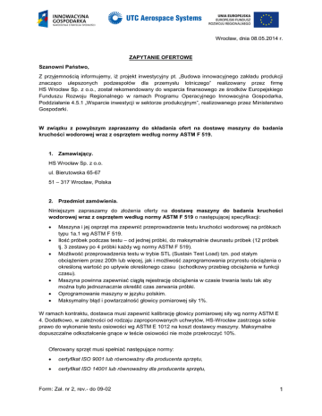 Wrocław, dnia 08.05.2014 r. ZAPYTANIE OFERTOWE Szanowni Państwo, Z przyjemnością informujemy, iż projekt inwestycyjny pt. „Budowa innowacyjnego zakładu produkcji znacząco ulepszonych podzespołów dla przemysłu lotniczego” realizowany przez firmę HS Wrocław Sp. z o.o., został rekomendowany do wsparcia finansowego ze środków Europejskiego Funduszu Rozwoju Regionalnego w ramach Programu Operacyjnego Innowacyjna Gospodarka, Poddziałanie 4.5.1 „Wsparcie inwestycji w sektorze produkcyjnym”, realizowanego przez Ministerstwo Gospodarki. W związku z powyższym zapraszamy do składania ofert na dostawę maszyny do badania kruchości wodorowej wraz z osprzętem według normy ASTM F 519. 1. Zamawiający. HS Wrocław Sp. z o.o. ul. Bierutowska 65-67 51 – 317 Wrocław, Polska 2. Przedmiot zamówienia. Niniejszym zapraszamy do złożenia oferty na dostawę maszyny do badania kruchości wodorowej wraz z osprzętem według normy ASTM F 519 o następującej specyfikacji: Maszyna i jej osprzęt ma zapewnić przeprowadzenie testu kruchości wodorowej na próbkach typu 1a.1 wg ASTM F 519. Ilość próbek podczas testu – od jednej próbki, do maksymalnie dwunastu próbek (12 próbek tj. 3 zestawy po 4 próbki każdy wg normy ASTM F 519). Możliwość przeprowadzenia testu w trybie STL (Sustain Test Load) tzn. pod stałym obciążeniem przez 200h lub więcej, jak i możliwość zaprogramowania przyrostu obciążenia o określoną wartość po upływie określonego czasu (schodkowy przebieg obciążenia w funkcji czasu). Maszyna powinna zapewniać ciągłą rejestrację obciążenia w czasie trwania testu tak aby można było jednoznacznie określić czas zerwania próbki. Oprogramowanie maszyny w języku polskim. Maksymalny błąd i powtarzalność głowicy pomiarowej siły 1%. W ramach kontraktu, dostawca musi zapewnić kalibrację głowicy pomiarowej siły wg normy ASTM E 4. Dodatkowo, w zależności od rodzaju zaproponowanych uchwytów, HS-Wrocław zastrzega sobie prawo do wykonanie testu osiowości wg ASTM E 1012 na koszt dostawcy maszyny. Maksymalne dopuszczalne odkształcenie gnące w teście osiowości nie może przekroczyć 10%. Oferowany sprzęt musi spełniać następujące normy: certyfikat ISO 9001 lub równoważny dla producenta sprzętu, certyfikat ISO 14001 lub równoważny dla producenta sprzętu, Form: Zał. nr 2, rev.- do 09-02 1 deklaracja zgodności CE, gwarancja 24 miesiące, serwis producenta lub jego autoryzowanego przedstawiciela powinien posiadać certyfikat ISO 9001:2001. 3. Kryteria oceny ofert. Oferty zostaną poddane ocenie w odniesieniu do poniższych kryteriów wyboru. W przypadku każdego kryterium ocena zostaje udzielona na podstawie pisemnej oferty przedstawionej przez oferenta. Kryteria wyboru oferty: a) cena (0 – 50 pkt.), b) warunki płatności (0 - 10 pkt.), c) doświadczenie w realizacji zamówień o takich samych lub zbliżonych parametrach (ocena będzie dokonywana na podstawie dołączonych do oferty referencji) (0 - 10 pkt.), d) sposób zapewnienia obsługi posprzedażowej (np. maksymalny czas oczekiwania na naprawę, zapewnienie dodatkowego wsparcia) (0 - 30 pkt.). 4. Sposób przygotowania oferty. Złożona oferta powinna zawierać co najmniej: a) nazwę i adres oferenta, b) być sporządzona na papierze firmowym oferenta lub opatrzona pieczątką firmową, c) posiadać datę sporządzenia, d) być podpisana przez przedstawiciela oferenta należycie upełnomocnionego do zaciągania zobowiązań w imieniu oferenta. Oferta powinna być ważna przynajmniej przez okres 3 miesięcy. Nadmienia się, iż zgodnie ze standardami Grupy Kapitałowej UTC, do której należy HS Wrocław Sp. z o.o., zakupy oraz współpraca z podwykonawcami przebiegają w oparciu o kryteria ochrony środowiska i zasady społecznej odpowiedzialności biznesu. Potencjalni kooperanci powinni zapoznać się z polityką wyboru dostawców realizowaną przez HS Wrocław (stanowiącą załącznik do zapytania ofertowego) oraz zawrzeć w ofercie poniższe oświadczenie: „Oświadczam, że zapoznałem się z zasadami „Polityki wyboru wykonawców i dostawców realizowaną przez HS Wrocław Sp. z o.o,”, która stanowi załącznik do zapytania ofertowego.” 5. Termin realizacji zamówienia. Oczekuje się realizacji zamówienia najpóźniej do dnia 29.08.2014. 6. Forma wynagrodzenia oraz termin płatności. Wynagrodzenie za dostawę wyposażenia zostanie uregulowane w formie przelewu bankowego na konto podane przez Oferenta. Minimalny oczekiwany termin płatności to 30 dni po wystawieniu faktury. Przedpłaty nie będą akceptowane. W sytuacji gdy rozliczenie zamówienia nastąpi w PLN, natomiast oferta została złożona w walucie obcej informuje się, iż przeliczenie dokonane zostanie według średniego kursu NBP z dnia wystawienia faktury. Form: Zał. nr 2, rev.- do 09-02 2 7. Koszt dostawy. Koszt dostawy urządzeń leży po stronie Dostawcy. 8. Sposób i termin składania ofert Uprasza się o dostarczenie oferty (w języku polskim lub angielskim) w terminie do dnia 20.05.2014 do godz. 12.00 w wersji elektronicznej na adresy email pracowników Zamawiającego podane poniżej, ew. listem poleconym, poprzez firmę kurierską lub osobiście w siedzibie Spółki na Sekretariacie Głównym. W przypadku braku zainteresowania z Państwa strony udziałem w postępowaniu ofertowym uprzejmie prosimy o potwierdzenie zaistniałego faktu. Informuje się nadto, iż w przypadku jakichkolwiek wątpliwości językiem rozstrzygającym jest język polski. Wyjaśnień dotyczących zapytania ofertowego udzielają: Jarosław Hoffmann, Dział Zakupów, tel. 781 500 222, [email protected] Łukasz Howaniec, Dział LPG, tel. 661923272, [email protected] Leszek Jankowiak, Dział LPG, tel. 601 480 567, [email protected] Niniejsza wiadomość jest POUFNA. Jeśli nie jesteś jej adresatem, proszę usunąć wiadomość bez kopiowania oraz powiadomić nas poprzez pocztę elektroniczną o zaistniałej pom