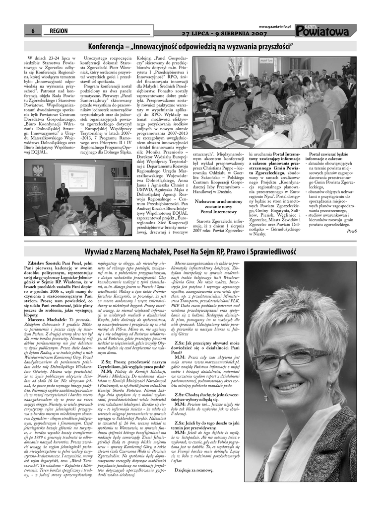 www.gazeta-info.pl 6 REGION lipca - sierpnia Konferencja – „Innowacyjność odpowiedzią na wyzwania przyszłości” W dniach 23-24 lipca w siedzibie Starostwa Powiatowego w Zgorzelcu odbyła się Konferencja Regionalna, której wiodącym tematem było: „Innowacyjność odpowiedzią na wyzwania przyszłości”. Patronat nad konferencją objęła Rada Powiatu Zgorzeleckiego i Starostwo Powiatowe. Współorganizatorami dwudniowego spotkania byli: Powiatowe Centrum Doradztwa Gospodarczego, „Biuro Koordynacji Wdrażania Dolnośląskiej Strategii Innowacyjności” z Urzędu Marszałkowskiego Województwa Dolnośląskiego oraz Biuro Inicjatywy Wspólnotowej EQUAL. Uroczystego rozpoczęcia konferencji dokonał Starosta Zgorzelecki Piotr Woroniak, który serdecznie przywitał wszystkich gości i przedstawił cel spotkania. Program konferencji został podzielony na dwa panele tematyczne. Pierwszy: „Panel Samorządowy” skierowany przede wszystkim do pracowników jednostek samorządów terytorialnych oraz do jednostek organizacyjnych powiatu zgorzeleckiego dotyczył - Europejskiej Współpracy Terytorialnej w latach 2007-2013, 7 Programu Ramowego oraz Priorytetu II i IV Regionalnego Programu Operacyjnego dla Dolnego Śląska. Kolejny, „Panel Gospodarczy” skierowany do przedsiębiorców dotyczył m.in. Priorytetu I „Przedsiębiorstwa i Innowacyjność” RPO, źródeł finansowania innowacji dla Małych i Średnich Przedsiębiorstw. Ponadto zostały zaprezentowane dobre praktyki. Przeprowadzone zostały również praktyczne warsztaty w wypełnianiu aplikacji do RPO. Wykłady na temat możliwości efektywnego pozyskiwania środków unijnych w nowym okresie programowania 2007-2013 ze szczególnym uwzględnieniem obszaru innowacyjności i źródeł finansowania wygłosili: Monika Przeniosło – Dyrektor Wydziału Europejskiej Współpracy Terytorialnej z Departamentu Rozwoju Regionalnego Urzędu Marszałkowskiego Województwa Dolnośląskiego, Anna Janus i Agnieszka Chmist z UMWD, Agnieszka Mąka z Dolnośląskiej Agencji Rozwoju Regionalnego – Centrum Przedsiębiorczości. Pan Andrzej Kozak z Biura Inicjatywy Wspólnotowej EQUAL zaprezentował projekt „ Euroregionalna Sieć Kooperacji przedsiębiorstw branży metalowej, drzewnej i tworzyw sztucznych”. Międzynarodowym akcentem konferencji był wykład przeprowadzony przez Christiana Puppe – kierownika Oddziału w Goerlitz Saksońsko – Polskiego Centrum Kooperacji Gospodarczej Izby Przemysłowo – Handlowej w Dreźnie. Niebawem uruchomiony zostanie nowy Portal Internetowy Starosta Zgorzelecki informuje, iż z dniem 1 sierpnia 2007 roku Powiat Zgorzelec- ki uruchamia Portal Internetowy zawierający informacje z zakresu planowania przestrzennego Gmin Powiatu Zgorzeleckiego, zbudowany w ramach zrealizowanego Projektu „Koordynacja regionalnego planowania przestrzennego w Euroregionie Nysa”. Portal dostępny będzie ze stron internetowych Powiatu Zgorzeleckiego, Gminy Bogatynia, Sulików, Pieńsk, Węgliniec i Zgorzelec, Miasta Zawidów i Zgorzelec oraz Powiatu Dolnośląsko – Górnołużyckiego w Niesky. Wywiad z Marzeną Machałek, Poseł Na Sejm RP, Prawo i Sprawiedliwość Zdzisław Szostek: Pani Poseł, pełni Pani pierwszą kadencję w swoim dorobku politycznym, reprezentując swój okręg wyborczy Legnicko-Jeleniogórski w Sejmie RP. Wiadomo, że w ławach poselskich zasiadła Pani dopiero w grudniu 2006 r., czyli mamy do czynienia z sześciomiesięcznym Pani stażem. Proszę nam powiedzieć, co się udało Pani zrealizować, jakie plany jeszcze do zrobienia, jakie występują kłopoty. Marzena Machałek: To prawda... Złożyłam ślubowanie 5 grudnia 2006r. w parlamencie i jeszcze czuję się świeżym Posłem. Z drugiej strony okres ten był dla mnie bardzo pracowity. Niemniej mój debiut parlamentarny nie jest debiutem w życiu publicznym. Przez dwie kadencje byłam Radną, a w trakcie jednej z nich Wiceburmistrzem Kamiennej Góry. Przed kandydowaniem do parlamentu pełniłam także rolę Dolnośląskiego Wicekuratora Oświaty. Można więc powiedzieć, że w życiu publicznym aktywnie działam od około 10 lat. Nie ukrywam jednak, że praca posła wymaga innego podejścia. Niemniej szybko zaaklimatyzowałam się w nowej rzeczywistości i bardzo mocno zaangażowałam się w prace na rzecz mojego okręgu. Niestety, w wielu sprawach turystyczny rejon jeleniogórski przegrywa z bardzo mocnym miedziowym obszarem legnickim - silnym ośrodkiem politycznym, gospodarczym i finansowym. Część jeleniogórska bazuje głównie na turystyce, a bardzo wysokie koszty transformacji po 1989 r. generują trudności w odbudowaniu naszych kurortów. Proszę zwrócić uwagę, że region jeleniogórski posiada niewykorzystane w pełni walory turystyczno-krajoznawcze. I oczywiście, mamy też rejon bogatyński, tzw. „Worek Turoszowski”. Tu wiadomo - Kopalnia i Elektrownia. Teren bardzo specyficzny i trudny, - z jednej strony uprzemysłowiony, najbogatszy w okręgu, ale niewolny niestety od różnego typu patologii, związanej m.in. z położeniem przygranicznym, o dużym wskaźniku przestępczości. Chcę konsekwentnie walczyć z tymi zjawiskami, m.in. dlatego jestem w Prawie i Sprawiedliwości. Walczy z tym także Premier Jarosław Kaczyński, co powoduje, że jest on mocno atakowany i wręcz znienawidzony w niektórych kręgach. Proszę zwrócić uwagę, że niemal większość informacji w niektórych mediach o działaniach Rządu, jakie docierają do społeczeństwa, są zmanipulowane i przejawia się w nich niechęć do PiS-u. Mimo to, nie ugniemy się i nie odstąpimy od Państwa solidarnego, od Państwa, gdzie przestępcy powinni siedzieć w więzieniach, gdzie zwykły Obywatel będzie się czuł bezpiecznie we własnym domu. Z.Sz; Proszę przedstawić naszym Czytelnikom, jak wygląda praca posła? M.M; Należę do Komisji Edukacji, Nauki i Młodzieży. Do niedawna działałam w Komisji Mniejszości Narodowych i Etnicz
