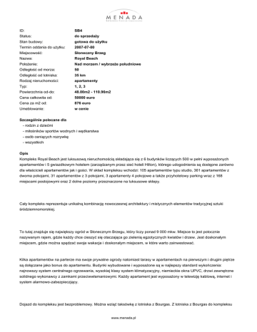 ID: SB4 Status: do sprzedaży Stan budowy: gotowa do użytku Termin oddania do użytku: 2007-07-00 Miejscowość: Słoneczny Brzeg Nazwa: Royal Beach Położenie: Nad morzem / wybrzeże południowe Odległość od morza: 50 Odległość od lotniska: 35 km Rodzaj nieruchomości: apartamenty Typ: 1, 2, 3 Powierzchnia od-do: 48.00m2 - 110.96m2 Cena całkowita od: 50000 euro Cena za m2 od: 876 euro Umeblowanie: w cenie Szczególnie polecane dla - rodzin z dziećmi - miłośników sportów wodnych i wędkarstwa - osób ceniących rozrywkę - wszystkich Opis Kompleks Royal Beach jest luksusową nieruchomością składająca się z 6 budynków liczących 500 w pełni wyposażonych apartamentów i 5 gwiazdkowym hotelem (zarządzanym przez sieć hoteli Hilton), którego udogodnienia są dostępne zarówno dla właścicieli apartamentów jak i gości. W skład kompleksu wchodzi: 105 apartamentów typu studio, 361 apartamentów z dwoma pokojami, 31 apartamentów z 3 pokojami, 3 apartamenty 4 pokojowe a także przyhotelowy parking wraz z 168 miejscami postojowymi oraz 2 dolne poziomy przeznaczone na luksusowe sklepy. Cały kompleks reprezentuje unikalną kombinację nowoczesnej architektury i mistycznych elementów tradycyjnej sztuki śródziemnomorskiej. To tutaj znajduje się największy ogród w Słonecznym Brzegu, który liczy ponad 9 000 mkw. Miejsce to jest potocznie nazywanym rajem, gdzie każdy chce cieszyć się otaczająca go zielenią egzotycznych kwiatów i drzew. Jest doskonałym miejscem, gdzie można spędzać swoje wakacje i doskonałym miejscem, w które warto zainwestować. Kilka apartamentów na parterze ma swoje prywatne ogrody natomiast tarasy w apartamentach na pierwszym i drugim piętrze są dołączane jako bonus do apartamentu. Budynki wybudowane i wyposażone są w najlepszy standard wykończenia: najnowszy system centralnego ogrzewania, wysokiej klasy system klimatyzacyjny, niemieckie okna UPVC, drzwi zewnętrzne solidnego wykonawcy z zamkami przeciwwłamaniowymi. Każdy apartament jest wyposażony w telewizję kablową, internet i system alarmowo-zabezpieczjący. Dojazd do kompleksu jest bezproblemowy. Można wziąć taksówkę z lotniska z Bourgas. Z lotniska z Bourgas do kompleksu www.menada.pl jest około 35 km, a z Warny 95 km. Atrakcje Kompleks ten znajduje się w samym centrum Słonecznego Brzegu tuż koło głównego deptaku. Oczywiście wszelkie atrakcje miasta jak i dostęp do wycieczek poza miastem jest dostępnych na terenie kompleksu. Bez wątpienia ogromną atrakcją są udogodnienia kompleksu, o których warto szerzej wspomnieć. Największy ogród w Słonecznym Brzegu - jest jedyną w swoim rodzaju kompozycją naturalnych roślin, pisaku, wody i kamieni, zaaranżowany w bardzo efektowny sposób. Ogród wpasowuje się w kompozycję całego kompleksu. Jest także doskonałym miejscem do ucieczki od codziennego zgiełku. Rozpościera się na obszarze 9 000 m2. Jest perełką w centrum Słonecznego Brzegu. Wodny bar i kafejka oferują swoim gościom rozmaite koktajle i drinki przygotowane według unikalnych przepisów z całego świata a specjalnie wyznaczone miejsca do zabawy dla dzieci gwarantuje im miło spędzony tu czas. Unikalna kombinacja palm, egzotycznych roślin i rzadkich drzew z całego świata nadaje kompleksowi wyjątkowy charakter. Baseny - Kompleks oferuje swoim gościom i właścicielom apartamentów dostęp do wszystkich basenów, które mają różne rozmiary i kształty. Całkowita powierzchnia 3 basenów obejmuje ponad 1700 m2. Jest tu także basen dla dzieci oraz basen wewnętrzny usytuowany zdala od zgielku I hałasu w centrum kompleksu. Pokoje do gry w squasha i ćwiczeń - Aby utrzymać swoje ciało w zdrowiu i kondycji kompleks proponuje grę w squasha. Pomieszczenie zostało zaprojektowane w oparciu o wymogi Światowej Federacji Squasha. Jeśli wizytujący preferują ciche gry zachęcamy do skorzystania z innych pomieszczeń gdzie można poćwiczyć zagrać w szachy, karty, triktrak. Dodatkowo kompleks może Cię zaskoczyć wieloma miejscami, gdzie są animatorzy gier i zabaw. SPA i Centrum Zdrowia - Dla tych, którzy chcą znaleźć różne formy terapii pomagających między innymi przywrócić siły witalne, kompleks oferuje SPA i Centrum Zdrowia. Znajdują się w centrum 5 gwiazdkowego hotelu. Centrum jest projektowane w śródziemnomorskim stylu i oferuje relaksującą atmosferę w luksusowym otoczeniu. Można tu znaleźć: 6 pokoi do masaży - to miejsce, gdzie można skorzystać z unikalnych masarzy, które uwalniają gromadzący się stres. Specjalną uwagę masażyści kładą na rozluźnienie mięśni. Masarze, które są tu oferowane mają relaksujący i terapeutyczny charakter; fińską i rosyjską łaźnię parową (stymuluje i orzeźwia ciało oraz aktywuje energię witalną); kąpiel turecka, sauna, jaccuzi i dwa solaria. Na ternie kompleksu znajduje się także pomoc medyczna. Jeśli cokolwiek się zdarzy, doświadczeni specjaliści będą do dyspozycji o każdej porze. 6 tematycznych restauracji - oferuje potrawy w różnych smakach, napoje oraz unikalną atmosferę. Zlokalizowane są w oddzielnych częściach kompleksu w ogrodzie i w hotelu. Każda z restauracji ma swój odrębny klimat i atmosferę. Śródziemnomorska i nowoczesna architektura wnętrz są ekskluzywną kombinacją całego projektu - są niejako dodatkiem dla osób tu przebywających. Atrakcyjna i zachwycająca atmosfera, menu restauracji z doskonałymi potrawami jest doskonałym miejscem do wypoczynku np. na koniec dnia. Znajduje się tu także niezliczona ilość kafejek, cukierni, sklepików. Piano bar - jest doskonałym miejscem do zorganizowania urodzin czy jakiekolwiek innej uroczystości. Piano bar dba o dobra atmosferę oraz dobry nastrój. W barze będzie gral utalentowany pianista. Bar będzie oferował domowe i importowane piwa oraz wina, klasyczne i nieklasyczne drinki. Jest to doskonale miejsce do relaksu przed lub po obiedzie, spotkań z