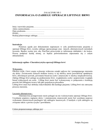 ZAŁĄCZNIK NR 2 INFORMACJA O ZABIEGU OPERACJI LIFTINGU BRWI Imię i nazwisko pacjenta……………………………………………………………… Adres zamieszkania…………………………………………………………………… Data urodzenia……………………… PESEL……………………………… Rodzaj planowanego zabiegu………………………………………………………… ………………………………………………………………………………………... Instrukcja Poniższa zgoda jest dokumentem napisanym w celu poinformowania pacjenta o operacji liftingu brwi, ryzyku zabiegu operacyjnego oraz innych, alternatywnych metodach leczenia. Bardzo ważne jest, aby Pan/Pani przeczytała te informacje dokładnie i do końca. Proszę podpisać każdą stronę, co będzie potwierdzeniem zapoznania się z całym dokumentem. Informacje ogólne- Charakterystyka operacji liftingu brwi Wskazania : Okolica czoła i brwi często wykazuje widoczne oznaki upływu lat i postępującego starzenia się skóry. Zwiotczenie różnych struktur twarzy w tej okolicy może powodować opadnięcie brwi, obwiśnięcie powiek, powstanie bruzd na czole i zmarszczki w okolicy międzybrwiowej. Zabieg liftingu brwi polega na podniesieniu brwi, wygładzeniu czoła i poprawieniu wyglądu bruzd widocznych na czole. Lifting brwi może być wykonywany w połączeniu z korekcją powiek lub liftingiem twarzy lub jako pojedyncza procedura. Lifting brwi musi być dobrany indywidualnie dla każdego pacjenta. Lifting brwi nie zatrzyma procesu starzenia. Leczenie alternatywne : Alternatywne postępowanie może polegać na nie wykonywaniu operacji liftingu brwi. Uzyskanie poprawy napięcia skóry i zmniejszenia zmarszczek może być uzyskane poprzez wykonanie chemicznych peelingów lub zabiegów laserowych. Z każdym z tych zabiegów są związane także z pewne ryzyko i powikłania. Celem proponowanego zabiegu jest :…………………………………………………………... ………………………………………………………………………………………………….. ………………………………………………………………………………………………….. Podpis Pacjenta 1 Dające się przewidzieć następstwa zabiegu : 1. Blizny – Każde postępowanie chirurgiczne powoduje powstawanie blizn, które czasami nie są ładne. Nieprawidłowe blizny mogą powstawać na skórze lub dotyczyć głębiej położonych tkanek. Blizny mogą mieć kolor różniący się od koloru otaczającej skóry. W celu korekcji tych blizn może być konieczna dodatkowa operacja. 2. Przebarwienia skóry/obrzęk – zasinienia skóry i obrzęk czasami występują po operacji liftingu brwi. Skóra w operowanej okolicy może wydawać się jaśniejsza lub ciemniejsza niż otaczająca skóra. Rzadko zdarza się jednak, że to przebarwienie skóry może utrzymywać się przez długi okres czasu lub może pozostać na zawsze. 3. Asymetria – Pewna asymetria twarzy występuje u większości kobiet. Różnice w wyglądzie twarzy, jej symetrii może także występować po operacji. Dodatkowa operacja może być konieczna w celu poprawy asymetrii. 4. Odległe wyniki – Zmiany wyglądu twarzy mogą być związane z wiekiem, odchudzaniem się lub tyciem, opalaniem się lub z innymi zmianami w organizmie zachodzącymi niezależnie od przebytej operacji. Zabieg liftingu brwi nie zatrzyma procesu starzenia się skóry i nie spowoduje, że wynik operacji zostanie na zawsze. Dalsze leczenie lub operacje mogą być konieczne w celu zatrzymania wyników tego zabiegu. 5. Nierówności skóry – Po operacji mogą być widoczne nierówności, dodatkowe zmarszczki lub zagłębienia na skórze. 6. Ból – Po operacji liftingu brwi może występować ból o różnym nasileniu. Przewlekły ból występuje rzadko i związany jest zazwyczaj z pociąganiem nerwów przez powstającą bliznę. Po lekach przeciwbólowych nie wolno prowadzić samochodu, nie wolno podejmować ważnych decyzji, nie wolno pić alkoholu. Czynniki ryzyka związane z operacją liftingu brwi Każde leczenie operacyjne obejmuje pewną ilość czynników ryzyka i jest bardzo ważne zrozumienie ryzyka związanego z zabiegiem liftingu brwi. Podjęcie decyzji o wykonaniu zabiegu jest sprawą indywidualną i polega na porównaniu ryzyka z możliwą poprawą wyglądu twarzy i szyi. Pomimo, że większość pacjentów nie ma własnych doświadczeń z niżej wymienionymi powikłaniami, powinna Pani/Pan omówić je z chirurgiem plastykiem aby uzyskać pewność co do podjęcia właściwej decyzji i w pełni zrozumieć ryzyko, potencjalne powikłania i konsekwencje operacji. 1. Krwawienie – występuje rzadko. Jest możliwe w trakcie lub po operacji. Jeżeli występuje krwawienie pooperacyjne, może wymagać natychmiastowego leczenia w celu zapobiegnięcia powstawaniu krwiaka lub transfuzji. Aby zmniejszyć ryzyko wystąpienia krwawienia nie można zażywać aspiryny i leków przeciwzapalnych co najmniej 21 dni przed planowanym zabiegiem. Nadciśnienie jeżeli nie jest leczone może powodować krwawienie podczas lub po zabiegu. Nadmierna ilość krwi zgromadzona pod skórą ( krwiak ) może spowodować opóźnione gojenie i powstanie nieprawidłowych blizn. Podpis Pacjenta 2 2. Infekcja – jest bardzo rzadkim powikłaniem po tego typu operacji. Jeśli wystąpi infekcja leczenie polega na podawaniu antybiotyków. Jeżeli infekcja nie reaguje na leczenie antybiotykami, może być konieczna dodatkowa operacja. 3. Zaburzenia czucia skóry – Pewne zaburzenia czucia na skórze są częstymi powikłaniami zaraz po operacji. Po kilku miesiącach większość pacjentów odzyskuje prawidłowe czucie. 4. Uszkodzenie głębiej położonych struktur – Podczas zabiegu operacyjnego może dojść do uszkodzenia głębiej położonych struktur takich jak nerwy, naczynia krwionośne, mięśnie, oczy . Us