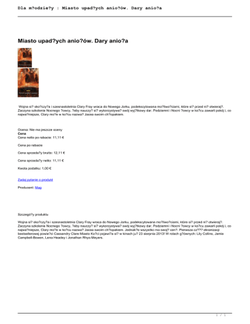 Dla m?odzie?y : Miasto upad?ych anio?ów. Dary anio?a Miasto upad?ych anio?ów. Dary anio?a Wojna si? sko?czy?a i szesnastoletnia Clary Fray wraca do Nowego Jorku, podekscytowana mo?liwo?ciami, które si? przed ni? otwieraj?. Zaczyna szkolenie Nocnego ?owcy, ?eby nauczy? si? wykorzystywa? swój wyj?tkowy dar. Podziemni i Nocni ?owcy w ko?cu zawarli pokój i, co najwa?niejsze, Clary mo?e w ko?cu nazwa? Jacea swoim ch?opakiem. Ocena: Nie ma jeszcze oceny Cena Cena netto po rabacie: 11,11 € Cena po rabacie Cena sprzeda?y brutto: 12,11 € Cena sprzeda?y netto: 11,11 € Kwota podatku: 1,00 € Zadaj pytanie o produkt Producent: Mag Szczegó?y produktu Wojna si? sko?czy?a i szesnastoletnia Clary Fray wraca do Nowego Jorku, podekscytowana mo?liwo?ciami, które si? przed ni? otwieraj?. Zaczyna szkolenie Nocnego ?owcy, ?eby nauczy? si? wykorzystywa? swój wyj?tkowy dar. Podziemni i Nocni ?owcy w ko?cu zawarli pokój i, co najwa?niejsze, Clary mo?e w ko?cu nazwa? Jacea swoim ch?opakiem. Jednak?e wszystko ma swoj? cen?. Pierwsza cz??? ekranizacji bestsellerowej powie?ci Cassandry Clare Miasto Ko?ci pojawi?a si? w kinach ju? 23 sierpnia 2013! W rolach g?ównych: Lily Collins, Jamie Campbell-Bowen, Lena Headey i Jonathan Rhys-Meyers. 1 / 1 Powered by TCPDF (www.tcpdf.org)