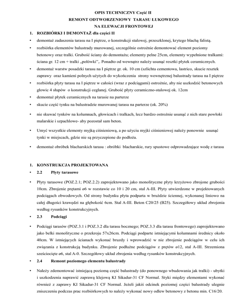 OPIS TECHNICZNY Część II REMONT ODTWORZENIOWY TARASU ŁUKOWEGO NA ELEWACJI FRONTOWEJ 1. ROZBIÓRKI I DEMONTAŻ dla części II • demontaż zadaszenia tarasu na I piętrze, o konstrukcji stalowej, przeszklonej, krytego blachą falistą. • rozbiórka elementów balustrady murowanej, szczególnie ostrożnie demontować element poziomy betonowy oraz tralki. Grubość ściany do demontażu; elementy pelne 25cm, elementy wypełnione tralkami: ściana gr. 12 cm + tralki „połówki”,. Ponadto od wewnątrz należy usunąć resztki płytek ceramicznych. • demontaż warstw posadzki tarasu na I piętrze gr. ok. 10 cm (szlichta cementowa, lastrico, skucie resztek zaprawy oraz kamieni polnych użytych do wykończenia strony wewnętrznej balustrady tarasu na I piętrze • rozbiórka płyty tarasu na I piętrze w całości (wraz z podciągami) ostrożnie, aby nie uszkodzić betonowych głowic 4 słupów o konstrukcji ceglanej. Grubość płyty ceramiczno-stalowej ok. 12cm • demontaż płytek ceramicznych na tarasie na parterze • skucie część tynku na balustradzie murowanej tarasu na parterze (ok. 20%) • nie skuwać tynków na kolumnach, głowicach i tralkach, lecz bardzo ostrożnie usunąć z nich stare powłoki malarskie i szpachlowe- aby pozostał sam beton. • Umyć wszystkie elementy myjką ciśnieniową, a po użyciu myjki ciśnieniowej należy ponownie usunąć tynki w miejscach, gdzie nie są przyczepione do podłoża. • demontaż obróbek blacharskich tarasu : obróbki blacharskie, rury spustowe odprowadzające wodę z tarasu 1. KONSTRUKCJA PROJEKTOWANA • 2.2 Płyty tarasowe • Płyty tarasowe (POZ.2.1; POZ.2.2) zaprojektowano jako monolityczne płyty krzyżowo zbrojone grubości 10cm. Zbrojenie prętami ø6 w rozstawie co 10 i 20 cm, stal A-III. Płyty utwierdzone w projektowanych podciągach obwodowych. Od strony budynku płyta podparta w bruździe ściennej, wykonanej liniowo na całej długości krawędzi na głębokość 6cm. Stal A-III. Beton C20/25 (B25). Szczegółowy układ zbrojenia według rysunków konstrukcyjnych. • 2.3 Podciągi • Podciągi tarasów (POZ.3.1 i POZ.3.2 dla tarasu bocznego; POZ.3.3 dla tarasu frontowego) zaprojektowano jako belki monolityczne o przekroju 57x26cm. Podciągi podparte istniejącymi kolumnami średnicy około 40cm. W istniejących ścianach wykonać bruzdy i wprowadzić w nie zbrojenie podciągów w celu ich związania z konstrukcją budynku. Zbrojenie podłużne podciągów z prętów ø12, stal A-III. Strzemiona sześciocięte ø6, stal A-0. Szczegółowy układ zbrojenia według rysunków konstrukcyjnych. • 2.4 Remont poziomego elementu balustrady • Należy zdemontować istniejącą poziomą część balustrady (do ponownego wbudowania jak tralki) - ubytki i uszkodzenia naprawić zaprawą klejową KI Sikadur-31 CF Normal. Styki między elementami wykonać również z zaprawy KI Sikadur-31 CF Normal. Jeżeli jakiś odcinek poziomej części balustrady ulegnie zniszczeniu podczas prac rozbiórkowych to należy wykonać nowy odlew betonowy z betonu min. C16/20. 1. WYKOŃCZENIE • Po wykonaniu nowej płyty tarasu na I piętrze należy wykonać balustradę murowaną w formie analogicznej jak balustrada obecna, tzn. wykonać z cegły ceramicznej gr. 25 cm pełne fragmenty balustrady, a w miejscach dotychczas wypełnionych tralkami wykonać ściankę z pełnej cegły gr. 12 cm i zamontować od frontu istniejące tralki betonowe, uprzednio zdemontowane. • Poziomy element balustrady zamontować ponownie , po wykonaniu naprawy wg pktu 2.4. mocować dodatkowo do elementów pionowych przy użyciu kotew wklejanych Hilti • zamontować gzymsy obiegające płytę tarasu. Gzymsy powinny mieć kształt zbliżony do gzymsów istniejących. Profile odtwarzane czyli gzymsy, w miejscach bardziej uszkodzonych, należy wykonać w technice ciągniętej bezpośrednio na elewacji . Wykonać szablon według wymiarów profili istniejących. Materiały na gzyms: Stuckprofilmortel grob – lekka szybkowiążąca zaprawa do wykonania wstępnego narzutu rdzenia , nawet do kilku cm. ( zużycie ok. 10kg/m2 na 1 cm) • Pozostałe profile istniejące wykańczać wyprawą Ispo Klasyk i malować wg projektu elewacji. Sposób wykończenia analogicznie jak ściana tj. powłoka gruntująca i powłoka końcowa • płytę tarasu wykończyć posadzką z płytek ceramicznych mrozoodpornych z warstwami wg opisu na przekroju. Spadek w kierunku projektowanego wpustów. • ścianę stanowiąca balustradę murowaną wykończyć analogicznym tynkiem jak resztę remontowanej elewacji. Tynkowanie i malowanie wykonać obustronnie. 1. ELEMENTY DODATKOWE • na balustradzie murowanej zamontować niewysoką balustradę metalową z rurek stalowych wg szczegółów na rysunku. Elementy metalowe pomalować proszkowo w kolorze elewacji • w grubości posadzki tarasu zamontować płaski wpust balkonowy z odpływem poziomym . Grubość wpustu nie może być grubsza niż 10 cm. Od wpustu wyprowadzić rurę spustową , którą podłączyć do rury z dachu. • Obróbki balustrad murowanych parteru i I piętra z blachy cynkowo-tytanowej