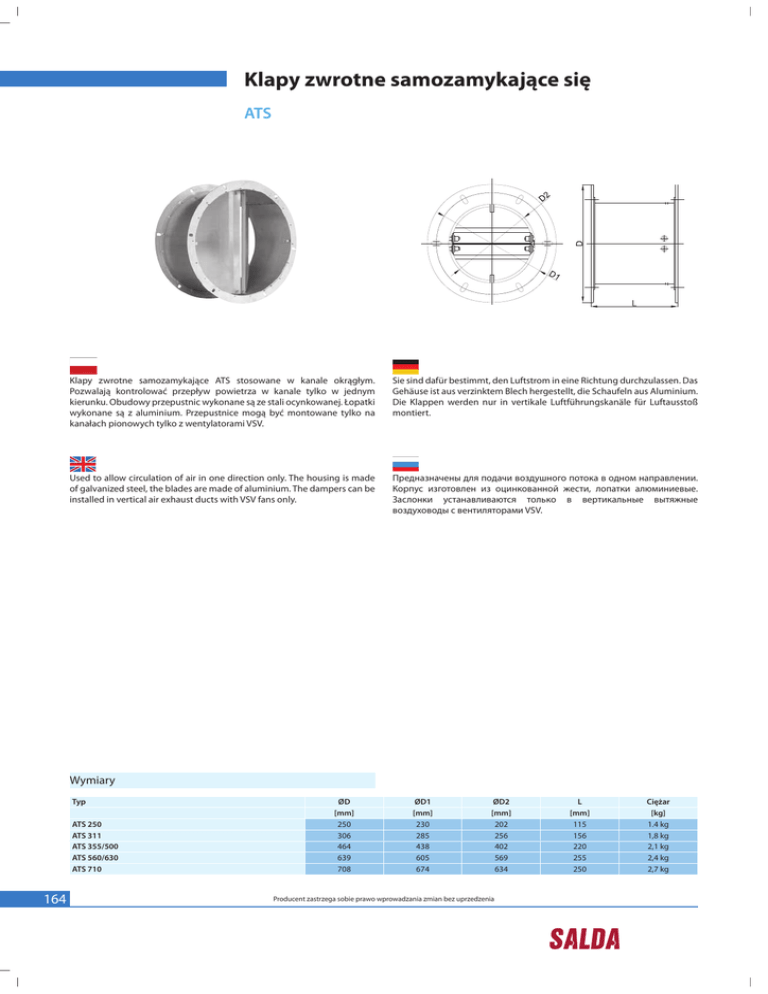 Klapy zwrotne samozamykające się ATS Klapy zwrotne samozamykające ATS stosowane w kanale okrągłym. Pozwalają kontrolować przepływ powietrza w kanale tylko w jednym kierunku. Obudowy przepustnic wykonane są ze stali ocynkowanej. Łopatki wykonane są z aluminium. Przepustnice mogą być montowane tylko na kanałach pionowych tylko z wentylatorami VSV. Sie sind dafür bestimmt, den Luftstrom in eine Richtung durchzulassen. Das Gehäuse ist aus verzinktem Blech hergestellt, die Schaufeln aus Aluminium. Die Klappen werden nur in vertikale Luftführungskanäle für Luftausstoß montiert. Used to allow circulation of air in one direction only. The housing is made of galvanized steel, the blades are made of aluminium. The dampers can be installed in vertical air exhaust ducts with VSV fans only. Предназначены для подачи воздушного потока в одном направлении. Корпус изготовлен из оцинкованной жести, лопатки алюминиевые. Заслонки устанавливаются только в вертикальные вытяжные воздуховоды с вентиляторами VSV. Wymiary Typ ATS 250 ATS 311 ATS 355/500 ATS 560/630 ATS 710 164 ØD [mm] 250 306 464 639 708 ØD1 [mm] 230 285 438 605 674 ØD2 [mm] 202 256 402 569 634 Producent zastrzega sobie prawo wprowadzania zmian bez uprzedzenia L [mm] 115 156 220 255 250 Ciężar [kg] 1.4 kg 1,8 kg 2,1 kg 2,4 kg 2,7 kg