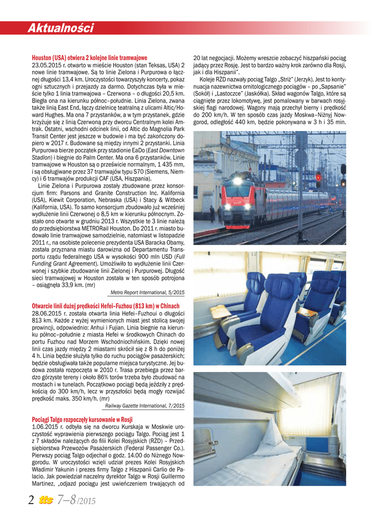 Aktualności Houston (USA) otwiera 2 kolejne linie tramwajowe 23.05.2015 r. otwarto w mieście Houston (stan Teksas, USA) 2 nowe linie tramwajowe. Są to linie Zielona i Purpurowa o łącznej długości 13,4 km. Uroczystości towarzyszyły koncerty, pokaz ogni sztucznych i przejazdy za darmo. Dotychczas była w mieście tylko 1 linia tramwajowa – Czerwona – o długości 20,5 km. Biegła ona na kierunku północ–południe. Linia Zielona, zwana także linią East End, łączy dzielnicę teatralną z ulicami Altic/Howard Hughes. Ma ona 7 przystanków, a w tym przystanek, gdzie krzyżuje się z linią Czerwoną przy dworcu Centralnym kolei Amtrak. Ostatni, wschodni odcinek linii, od Altic do Magnolia Park Transit Center jest jeszcze w budowie i ma być zakończony dopiero w 2017 r. Budowane są między innymi 2 przystanki. Linia Purpurowa bierze początek przy stadionie EaDo (East Downtown Stadion) i biegnie do Palm Center. Ma ona 6 przystanków. Linie tramwajowe w Houston są o prześwicie normalnym, 1 435 mm, i są obsługiwane przez 37 tramwajów typu S70 (Siemens, Niemcy) i 6 tramwajów produkcji CAF (USA, Hiszpania). Linie Zielona i Purpurowa zostały zbudowane przez konsorcjum firm: Parsons and Granite Construction Inc. Kalifornia (USA), Kiewit Corporation, Nebraska (USA) i Stacy & Witbeck (Kalifornia, USA). To samo konsorcjum zbudowało już wcześniej wydłużenie linii Czerwonej o 8,5 km w kierunku północnym. Zostało ono otwarte w grudniu 2013 r. Wszystkie te 3 linie należą do przedsiębiorstwa METRORail Houston. Do 2011 r. miasto budowało linie tramwajowe samodzielnie, natomiast w listopadzie 2011 r., na osobiste polecenie prezydenta USA Baracka Obamy, została przyznana miastu darowizna od Departamentu Transportu rządu federalnego USA w wysokości 900 mln USD (Full Funding Grant Agreement). Umożliwiło to wydłużenie linii Czerwonej i szybkie zbudowanie linii Zielonej i Purpurowej. Długość sieci tramwajowej w Houston została w ten sposób potrojona – osiągnęła 33,9 km. (mr) Metro Report International, 5/2015 Otwarcie linii dużej prędkości Hefei–Fuzhou (813 km) w Chinach 28.06.2015 r. została otwarta linia Hefei–Fuzhoui o długości 813 km. Każde z wyżej wymienionych miast jest stolicą swojej prowincji, odpowiednio: Anhui i Fujian. Linia biegnie na kierunku północ–południe z miasta Hefei w środkowych Chinach do portu Fuzhou nad Morzem Wschodniochińskim. Dzięki nowej linii czas jazdy między 2 miastami skrócił się z 8 h do poniżej 4 h. Linia będzie służyła tylko do ruchu pociągów pasażerskich; będzie obsługiwała także popularne miejsca turystyczne. Jej budowa została rozpoczęta w 2010 r. Trasa przebiega przez bardzo górzyste tereny i około 86% torów trzeba było zbudować na mostach i w tunelach. Początkowo pociągi będą jeździły z prędkością do 300 km/h, lecz w przyszłości będą mogły rozwijać prędkość maks. 350 km/h. (mr) Railway Gazette International, 7/2015 Pociągi Talgo rozpoczęły kursowanie w Rosji 1.06.2015 r. odbyła się na dworcu Kurskaja w Moskwie uroczystość wyprawienia pierwszego pociągu Talgo. Pociąg jest 1 z 7 składów należących do filii Kolei Rosyjskich (RŻD) – Przedsiębiorstwa Przewozów Pasażerskich (Federal Passenger Co.). Pierwszy pociąg Talgo odjechał o godz. 14.00 do Niżnego Nowgorodu. W uroczystości wzięli udział prezes Kolei Rosyjskich Władimir Yakunin i prezes firmy Talgo z Hiszpanii Carlio de Palacio. Jak powiedział naczelny dyrektor Talgo w Rosji Guillermo Martinez, „odjazd pociągu jest uwieńczeniem trwających od 2 7–8 /2015 20 lat negocjacji. Możemy wreszcie zobaczyć hiszpański pociąg jadący przez Rosję. Jest to bardzo ważny krok zarówno dla Rosji, jak i dla Hiszpanii”. Koleje RŻD nazwały pociąg Talgo „Striż” (Jerzyk). Jest to kontynuacja nazewnictwa ornitologicznego pociągów – po „Sapsanie” (Sokół) i „Lastoczce” (Jaskółka). Skład wagonów Talgo, które są ciągnięte przez lokomotywę, jest pomalowany w barwach rosyjskiej flagi narodowej. Wagony mają przechył bierny i prędkość do 200 km/h. W ten sposób czas jazdy Moskwa–Niżnyj Nowgorod, odległość 440 km, będzie pokonywana w 3 h i 35 min. Aktualności Pociąg Talgo składa się z 18 wagonów pasażerskich i 2 wagonów technicznych. Łączna liczba miejsc w pociągu wynosi 414, a składają się na to miejsca siedzące w klasie 1 i 2 pociągu, a także miejsca leżące w 2-miejscowych przedziałach sypialnych. Jak mówi firma Talgo, „pociągi Talgo oferują najwyższy poziom komfortu” przy jednoczesnym zmniejszeniu zużycia energii potrzebnej do przewozu w porównaniu z klasycznymi pociągami. Składy Talgo są wyposażone w przyłącza do Internetu. W składzie znajduje się też wagon jadalny. Przedsiębiorstwo Przewozów Pasażerskich RŻD zamówiło w czerwcu 2011 r. 7 składów Talgo, wartości 100 mln euro. Początkowo było przewidywane, że będą one kursowały na linii Moskwa–Kijów, jednak zostały zastosowane na linii Moskwa– Niżnyj Nowgorod. Pozwoli to pociągom dużej prędkości Sapsan, produkcji Siemens (Niemcy), skoncentrować się tylko na linii Moskwa–St. Petersburg. Dotychczas pociągi te obsługiwały także trasę Moskwa–Niżnyj Nowgorod. 3 pociągi Talgo zostały zamówione z urządzeniami automatycznej zmiany prześwitu toru i są przewidywane do kursowania od 2016 r. na trasie Moskwa– Mińsk–Warszawa–Berlin. Zmiana prześwitu osi z 1 520 mm na 1 435 mm i odwrotnie będzie następowała w Brześciu. (mr) Railway Gazette International, 6/2015 Trafikverket wybrał konsultantów dla szwedzkiej linii dużej prędkości Zarządca szwedzkiej infrastruktury kolejowej Trafikverket wybrał jako konsultantów dla planowanej linii dużej prędkości Sztokholm–Goeteborg, z odgałęzieniem do Malmo, konsorcjum firm Systra (Francja) i Cowi (Dania). Będą oni konsultantami dla pierwszego odcinka linii, długości 160 km
