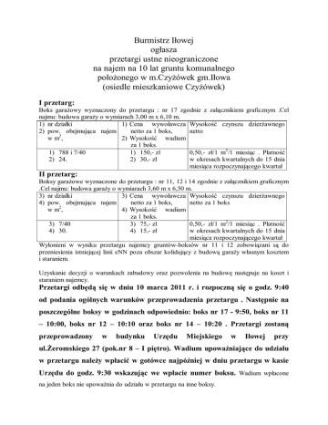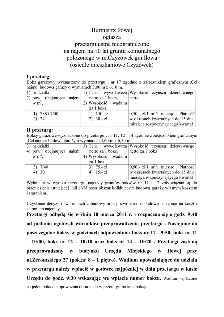 Burmistrz Iłowej ogłasza przetargi ustne nieograniczone na najem na 10 lat gruntu komunalnego położonego w m.Czyżówek gm.Iłowa (osiedle mieszkaniowe Czyżówek) I przetarg: Boks garażowy wyznaczony do przetargu : nr 17 zgodnie z załącznikiem graficznym .Cel najmu: budowa garaży o wymiarach 3,00 m x 6,10 m. 1) Cena wywoławcza Wysokość czynszu dzierżawnego 1) nr działki netto netto za 1 boks, 2) pow. obejmująca najem 2 2) Wysokość wadium wm, za 1 boks. 1) 788 i 7/40 1) 150,- zl 0,50,- zł/1 m2/1 miesiąc . Płatność 2) 24. 2) 30,- zł w okresach kwartalnych do 15 dnia miesiąca rozpoczynającego kwartał II przetarg: Boksy garażowe wyznaczone do przetargu : nr 11, 12 i 14 zgodnie z załącznikiem graficznym .Cel najmu: budowa garaży o wymiarach 3,60 m x 6,50 m. 3) Cena wywoławcza Wysokość czynszu dzierżawnego 3) nr działki netto za 1 boks netto za 1 boks, 4) pow. obejmująca najem 4) Wysokość wadium w m2, za 1 boks. 3) 7/40 3) 75,- zl 0,50,- zł/1 m2/1 miesiąc . Płatność 4) 30. 4) 15,- zł w okresach kwartalnych do 15 dnia miesiąca rozpoczynającego kwartał Wyłonieni w wyniku przetargu najemcy gruntów-boksów nr 11 i 12 zobowiązani są do przeniesienia istniejącej linii eNN poza obszar kolidujący z budową garaży własnym kosztem i staraniem. Uzyskanie decyzji o warunkach zabudowy oraz pozwolenia na budowę następuje na koszt i staraniem najemcy. Przetargi odbędą się w dniu 10 marca 2011 r. i rozpoczną się o godz. 9:40 od podania ogólnych warunków przeprowadzenia przetargu . Następnie na poszczególne boksy w godzinach odpowiednio: boks nr 17 - 9:50, boks nr 11 – 10:00, boks nr 12 – 10:10 oraz boks nr 14 – 10:20 . Przetargi zostaną przeprowadzony w budynku Urzędu Miejskiego w Iłowej przy ul.Żeromskiego 27 (pok.nr 8 – I piętro). Wadium upoważniające do udziału w przetargu należy wpłacić w gotówce najpóźniej w dniu przetargu w kasie Urzędu do godz. 9:30 wskazując we wpłacie numer boksu. Wadium wpłacone na jeden boks nie upoważnia do udziału w przetargu na inne boksy. Licytacji będzie podlegała jednorazowa kwota (netto) upoważniająca do zawarcia umowy najmu. Wylicytowana kwota podlega zapłacie w terminie 14 dni od dnia zamknięcia przetargu. Na jej poczet zaliczone zostanie wpłacone wadium. Do wylicytowanej kwoty doliczony zostanie VAT w wysokości 23 %. Wadium wpłacone przez uczestnika , który nie wygra przetargu zostanie zwrócone w terminie do 3 dni w kasie Urzędu Miejskiego w Iłowej. Wadium ulega przepadkowi na rzecz Urzędu Miejskiego w Iłowej w przypadku : - nie wpłacenia różnicy pomiędzy kwotą wylicytowaną, a wpłaconym wadium, - nie podpisania umowy w terminie 14 dni od dnia zamknięcia przetargu. Projekt umowy najmu dostępny jest do wglądu w pok. nr 2 w Urzędzie Miejskim w Iłowej przy ul.Żeromskiego 25 (wejście od podwórza w Zakładzie Gospodarki Komunalnej i Mieszkaniowej w Iłowej) . Wpłacenie wadium jest równoznaczne z zaakceptowaniem projektu umowy najmu. Osoba wygrywająca przetarg i podpisująca umowę najmu zobowiązuje się do budowy garażu zgodnie z planem realizacyjnym będącym w posiadaniu Gminy Iłowa.