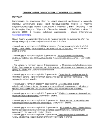 ZAWIADOMIENIE O WYBORZE NAJKORZYSTNIEJSZEJ OFERTY DOTYCZY: Zaproszenia do składania ofert na usługi integracji społecznej w ramach środków uzyskanych przez Rząd Rzeczypospolitej Polskiej z Kredytu Międzynarodowego Banku Odbudowy i Rozwoju ( Bank Światowy ) na Poakcesyjny Program Wsparcia Obszarów Wiejskich (PPWOW) z dnia 12 sierpnia 2008r. ( miejsce publikacji zaproszenie - strona internetowa www.jastrzebia.pl). Urząd Gminy w Jastrzębi informuje, że na zaproszenie do składania ofert na usługi integracji społecznej zostało złożonych 4 ofery. - Na usługę w ramach części I Zaproszenia „Propagowanie tradycji wśród dzieci i młodzieży z terenu gminy poprzez kulturę muzyczną” nie wpłynęła żadna oferta. - Na usługę w ramach części II Zaproszenia „Integracja działań szkoły, rodziców i dzieci klas zerowych poprzez twórcze zaangażowanie „ wpłynęła 1 oferta. - Na usługę w ramach części III Zaproszenia „ Organizacja Młodzieżowego Klubu Sportowego sposobem na integrację i działania wychowawcze dla grupy 30 osób” nie wpłynęła żadna ofert. - Na usługę w ramach części IV Zaproszenia „Organizacja mini przedszkola dla dzieci cztero – i pięcioletnich zapewniającego opiekę i edukację „ nie wpłynęłą żadna oferta. - Na usługę w ramach części V Zaproszenia „Likwidowanie barier międzyludzkich pomiędzy niepełnosprawnymi i pełnosprawnymi członkami społeczności gminnej dla grupy 30 osób – nie wpłynęłą żadna oferta. i - Na usługę w ramach części VI Zaproszenia” Wiejska kawiarenka internetowa edukuje i łączy pokolenia wpłynęła 1 oferta. - Na usługę w ramach części VII Zaproszenia „ Poradnictwo specjalistyczne wspierające rozwój dziecka szkolnego” wpłynęło 1 oferta. - Na usługę w ramach części VIII Zaproszenia „ Klub seniora jako alternatywna forma spędzania czasu wolnego poprzez uczestnictwo w różnorodnych zajęciach” nie wpłynęła żadna oferta. - Na usługę w ramach części IX Zaproszenia „Zajęcia wspierające dzieci w wieku szkolnym z rodzin dysfunkcyjnych” wpłynęła 1 oferta. 1 Wszystkie oferty zostały poddane procedurze oceny zgodnie z ustalonym kryteriami technicznymi zawartym w Podręczniku Operacyjnym Poakcesyjnego Programu Wsparcia Obszarów Wiejskich. „Przy ocenie ofert, ustalaniu ich rankingu i podejmowaniu decyzji o udzieleniu zamówienia Komisja będzie brała pod uwagę zapisy przedstawionej oferty, współpracę z partnerami lokalnymi , oferowaną jakość usług i innowacyjność, trwałość oraz ekonomiczność działań zaproponowanych przez Usługodawcę.” ( wypis z zaproszenia do składania ofert na usługi integracji społecznej – pkt 7). Wyniki oceny przedstawiają się następująco: 1.Na usługę w ramach części II Zaproszenia „Integracja działań szkoły, rodziców i dzieci klas zerowych poprzez twórcze zaangażowanie „ wpłynęła 1 oferta. Oferta złożona przez Stowarzyszenie Kobiet Aktywnych „ INSPIRACJA” w Jastrzębi - wymogi formalne / zastosowanie odpowiednich druków, komplet wymaganych dokumentów / oświadczeń / - spełnione, - wymogi dotyczące kwalifikowalności – spełnione, - warunki realizacji i zakres zamawianych usług - spełnione - dysponowanie kadrą z odpowiednim wykształceniem – spełnione - posiadanie odpowiedniej bazy lokalowej - spełnione Wymagania razem – spełnione Do podpisania umowy na realizację Usługi zaproszono Stowarzyszenie Kobiet Aktywnych „INSPIRACJA” w Jastrzębi. - Na usługę w ramach części VI Zaproszenia ” Wiejska kawiarenka internetowa edukuje i łączy pokolenia wpłynęła 1 oferta. Oferta złożona przez Publiczną Szkołę Podstawową w Woli Goryńskiej. - wymogi formalne / zastosowanie odpowiednich druków, wymaganych dokumentów / oświadczeń / - spełnione, - wymogi dotyczące kwalifikowalności – spełnione, - warunki realizacji i zakres zamawianych usług - spełnione - dysponowanie kadrą z odpowiednim wykształceniem – spełnione 2 komplet - posiadanie odpowiedniej bazy lokalowej - spełnione Wymagania razem – spełnione Do podpisania umowy na realizację Usługi zaproszono Publiczną Szkołę Podstawową w Woli Goryńskiej. Na usługę w ramach części VII Zaproszenia „ Poradnictwo specjalistyczne wspierające rozwój dziecka szkolnego” wpłynęło 1 oferta. Oferta złożona przez „Stowarzyszenie Dzieci Naszej Wsi „w Skaryszewie. - wymogi formalne / zastosowanie odpowiednich druków, wymaganych dokumentów / oświadczeń / - spełnione, - wymogi dotyczące kwalifikowalności – spełnione, - warunki realizacji i zakres zamawianych usług - spełnione - dysponowanie kadrą z odpowiednim wykształceniem – spełnione komplet - posiadanie odpowiedniej bazy lokalowej - spełnione Wymagania razem – spełnione Do podpisania umowy na realizację Usługi zaproszono „ Stowarzyszenie Dzieci Naszej Wsi” w Skaryszewie. Na usługę w ramach części IX Zaproszenia - „ Zajęcia wspierające dzieci w wieku szkolnym z rodzin dysfunkcyjnych” wpłynęła 1 oferta. Oferta złożona przez Publiczną Szkołę Podstawową w Woli Goryńskiej w porozumieniu z NZOZ Ośrodek Terapii i Profilaktyki Uzależnień. - wymogi formalne / zastosowanie odpowiednich druków, wymaganych dokumentów / oświadczeń / - spełnione, - wymogi dotyczące kwalifikowalności – spełnione, - warunki realizacji i zakres zamawianych usług - spełnione - dysponowanie kadrą z odpowiednim wykształceniem – spełnione komplet - posiadanie odpowiedniej bazy lokalowej - spełnione Wymagania razem – spełnione Do podpisania umowy na realizację Usługi zaproszono Publiczną Szkołę Podstawową w Woli Goryńskiej. Wszystkim biorącym udział w składaniu ofert Dziękujemy. 3 Jastrzębia dnia 08.09.2008r. 4