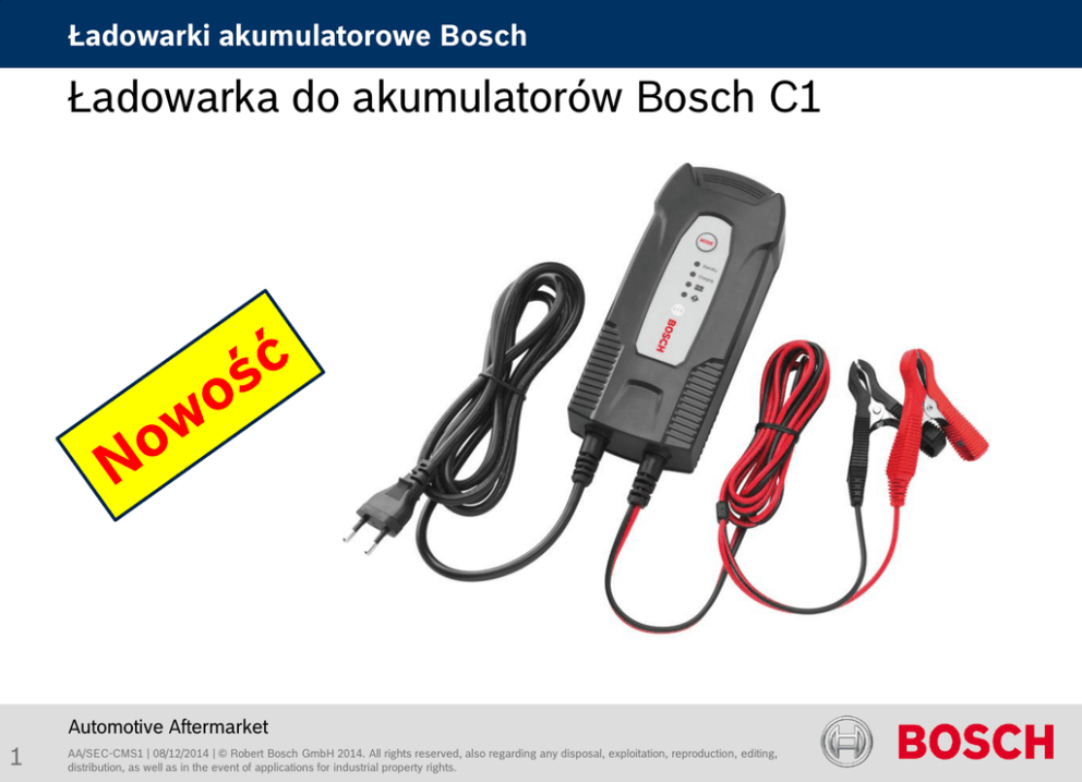 Ładowarki akumulatorowe Bosch Ładowarka do akumulatorów Bosch C1 Automotive Aftermarket 1 AA/SEC-CMS1 | 08/12/2014 | © Robert Bosch GmbH 2014. All rights reserved, also regarding any disposal, exploitation, reproduction, editing, distribution, as well as in the event of applications for industrial property rights. Ładowarki akumulatorowe Bosch Ładowarka do akumulatorów Bosch C1 Ładowarka do akumulatorów Bosch C1: • numer zamówieniowy 0 189 999 01M • najprostsza z ładowarek Bosch serii C • obsługa jednym przyciskiem • przeznaczona do ładowania 12V akumulatorów • kompaktowe rozmiary (DxSZxW) 185 x 81 x 47 mm • cena detal netto 209 PLN Automotive Aftermarket 2 AA/SEC-CMS1 | 08/12/2014 | © Robert Bosch GmbH 2014. All rights reserved, also regarding any disposal, exploitation, reproduction, editing, distribution, as well as in the event of applications for industrial property rights. Ładowarki akumulatorowe Bosch Ładowarka do akumulatorów Bosch C1 Skrócony opis funkcji ładowarki do akumulatorów Bosch C1: • napięcie ładowania: 12V • przeznaczona do akumulatorów: kwasowo- ołowiowych, żelowych, EFB, VRLA • pojemność ładowanego akumulatora 12 V: 5A h - 120 Ah • bezpiecznik wewnętrzny: 1,6A • Wybrane funkcje: • Zabezpieczenie przed przegrzaniem • Zabezpieczenie przed przeładowaniem akumulatora • Zabezpieczenie przed zwarciem w przypadku pomylenia biegunów • Ładowanie sterowane automatycznie Automotive Aftermarket 3 AA/SEC-CMS1 | 08/12/2014 | © Robert Bosch GmbH 2014. All rights reserved, also regarding any disposal, exploitation, reproduction, editing, distribution, as well as in the event of applications for industrial property rights. Ładowarki akumulatorowe Bosch Ładowarka do akumulatorów Bosch C1 Ładowanie głęboko rozładowanych akumulatorów (ładowanie impulsowe) • Jest to automatyczna funkcja ładowarki, której nie można wybrać ręcznie (uruchamia się tylko automatycznie). •Umożliwia ładowanie akumulatorów, których napięcie spadło poniżej 4,5V. • Jeśli napięcie akumulatora 12V na początku ładowania wynosi pomiędzy 4,5V 10,5V ładowarka automatycznie przełączy się w tryb ładowania impulsowego. • Po osiągnięciu napięcia akumulatora ponad 10,5V ładowarka przełączy się automatycznie w standardowy tryb ładowania. Automotive Aftermarket 4 AA/SEC-CMS1 | 08/12/2014 | © Robert Bosch GmbH 2014. All rights reserved, also regarding any disposal, exploitation, reproduction, editing, distribution, as well as in the event of applications for industrial property rights. Ładowarki akumulatorowe Bosch Ładowarka do akumulatorów Bosch C1 Automotive Aftermarket 5 AA/SEC-CMS1 | 08/12/2014 | © Robert Bosch GmbH 2014. All rights reserved, also regarding any disposal, exploitation, reproduction, editing, distribution, as well as in the event of applications for industrial property rights.