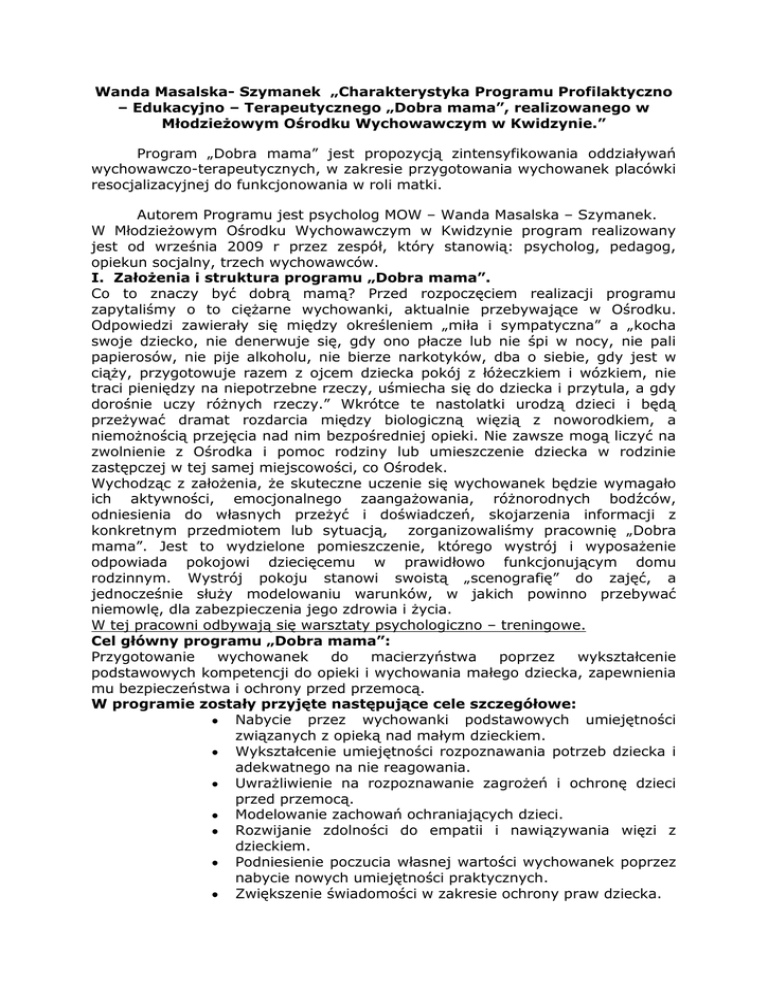 Wanda Masalska- Szymanek „Charakterystyka Programu Profilaktyczno – Edukacyjno – Terapeutycznego „Dobra mama”, realizowanego w Młodzieżowym Ośrodku Wychowawczym w Kwidzynie.” Program „Dobra mama” jest propozycją zintensyfikowania oddziaływań wychowawczo-terapeutycznych, w zakresie przygotowania wychowanek placówki resocjalizacyjnej do funkcjonowania w roli matki. Autorem Programu jest psycholog MOW – Wanda Masalska – Szymanek. W Młodzieżowym Ośrodku Wychowawczym w Kwidzynie program realizowany jest od września 2009 r przez zespół, który stanowią: psycholog, pedagog, opiekun socjalny, trzech wychowawców. I. Założenia i struktura programu „Dobra mama”. Co to znaczy być dobrą mamą? Przed rozpoczęciem realizacji programu zapytaliśmy o to ciężarne wychowanki, aktualnie przebywające w Ośrodku. Odpowiedzi zawierały się między określeniem „miła i sympatyczna” a „kocha swoje dziecko, nie denerwuje się, gdy ono płacze lub nie śpi w nocy, nie pali papierosów, nie pije alkoholu, nie bierze narkotyków, dba o siebie, gdy jest w ciąży, przygotowuje razem z ojcem dziecka pokój z łóżeczkiem i wózkiem, nie traci pieniędzy na niepotrzebne rzeczy, uśmiecha się do dziecka i przytula, a gdy dorośnie uczy różnych rzeczy.” Wkrótce te nastolatki urodzą dzieci i będą przeżywać dramat rozdarcia między biologiczną więzią z noworodkiem, a niemożnością przejęcia nad nim bezpośredniej opieki. Nie zawsze mogą liczyć na zwolnienie z Ośrodka i pomoc rodziny lub umieszczenie dziecka w rodzinie zastępczej w tej samej miejscowości, co Ośrodek. Wychodząc z założenia, że skuteczne uczenie się wychowanek będzie wymagało ich aktywności, emocjonalnego zaangażowania, różnorodnych bodźców, odniesienia do własnych przeżyć i doświadczeń, skojarzenia informacji z konkretnym przedmiotem lub sytuacją, zorganizowaliśmy pracownię „Dobra mama”. Jest to wydzielone pomieszczenie, którego wystrój i wyposażenie odpowiada pokojowi dziecięcemu w prawidłowo funkcjonującym domu rodzinnym. Wystrój pokoju stanowi swoistą „scenografię” do zajęć, a jednocześnie służy modelowaniu warunków, w jakich powinno przebywać niemowlę, dla zabezpieczenia jego zdrowia i życia. W tej pracowni odbywają się warsztaty psychologiczno – treningowe. Cel główny programu „Dobra mama”: Przygotowanie wychowanek do macierzyństwa poprzez wykształcenie podstawowych kompetencji do opieki i wychowania małego dziecka, zapewnienia mu bezpieczeństwa i ochrony przed przemocą. W programie zostały przyjęte następujące cele szczegółowe: Nabycie przez wychowanki podstawowych umiejętności związanych z opieką nad małym dzieckiem. Wykształcenie umiejętności rozpoznawania potrzeb dziecka i adekwatnego na nie reagowania. Uwrażliwienie na rozpoznawanie zagrożeń i ochronę dzieci przed przemocą. Modelowanie zachowań ochraniających dzieci. Rozwijanie zdolności do empatii i nawiązywania więzi z dzieckiem. Podniesienie poczucia własnej wartości wychowanek poprzez nabycie nowych umiejętności praktycznych. Zwiększenie świadomości w zakresie ochrony praw dziecka. 2. Struktura programu „Dobra mama”. Program składa się z dwóch modułów: Warsztaty psychologiczno - treningowe Zajęcia z małymi dziećmi (forma wolontariatu) Warsztaty psychologiczno - treningowe odbywają się w Ośrodku w specjalnie przygotowanej pracowni, urządzonej na wzór pokoju małego dziecka. Prowadzone są przez psychologa oraz osobę wspomagającą (pedagog, wychowawca, opiekun socjalny), według scenariuszy uwzględniających własną aktywność wychowanek i ich bezpośrednie doświadczenia. Zajęcia warsztatowe odbywają się raz w tygodniu przez okres dwóch miesięcy dla jednej grupy ćwiczącej. Zajęcia z małymi dziećmi ( w formie wolontariatu) mają miejsce W Domu im. J. Korczaka Regionalnej Placówce Opiekuńczo – Wychowawczej w Gdańsku. Na terenie tej placówki wychowanki uczestniczą w zabawach z dziećmi w salach i w ogrodzie, pomagają w zajęciach terapeutycznych oraz w pracach porządkowych w salach dzieci i pomieszczeniach rehabilitacyjnych. Wyjazdy do Domu im. J. Korczaka odbywają się w czasie realizacji Programu zwykle raz w miesiącu. Uwaga! Szczególnym elementem Programu, mającym na celu rozwijanie empatii i uczuciowości wyższej jest objęcie przez wychowanki tzw. adopcją wychowawczą , wybranych małych dzieci z Regionalnej Placówki Opiekuńczo – Wychowawczej im. J. Korczaka w Gdańsku. Są to dzieci znacznie niepełnosprawne, z którymi nikt z rodziny nie utrzymuje kontaktów. Wychowanki w czasie wizyt w domu dziecka szczególnie zajmują się tym dzieckiem, pamiętają o jego urodzinach, imieninach, szczególnie dla niego przygotowują drobne upominki i pomoce do rehabilitacji, rozmawiają z opiekunami o jego zdrowiu itp. Adresaci Programu: Wychowanki ciężarne. Wychowanki w wieku 17 – 18 lat, które w danym roku szkolnym opuszczą placówkę. Wychowanki po przebytych porodach, jeżeli utrzymują kontakt z dzieckiem i będą miały możliwość opieki nad dzieckiem po uzyskaniu pełnoletniości. Liczebność grupy: Grupa wychowanek zaangażowanych w Program liczy od 5 do 8 osób, ze względu na intensywność ćwiczeń praktycznych. Czas trwania zajęć warsztatowych: Jedno spotkanie trwa od 1,5 do 2 godzin. Metody pracy: Psycho-aktywne formy pracy z grupą – ćwiczenia interaktywne, scenki psychodramatyczne, wyobrażenia sterowane, wizualizacje, organizowane doświadczenia, ćwiczenia oddechowe, elementy ćwiczeń V. Sherborne, dyskusja. Wyjazdy do Domu Dziecka im. J. Korczaka w Gdańsku – zabawy z dziećmi, spacery z dziećmi w wózkach, pomoc w ćwiczeniach rehabilitacyjnych, drobne prace porządkowe w salach dzieci, przygotowywanie pomocy do zajęć rehabilitacyjnych oraz okolicznościowych dekoracji. II. Warsztaty psychologiczno – treningowe obejmują 8 spotkań o następują