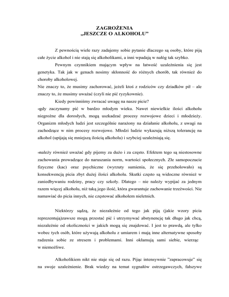ZAGROŻENIA „JESZCZE O ALKOHOLU” Z pewnością wiele razy zadajemy sobie pytanie dlaczego są osoby, które piją całe życie alkohol i nie stają się alkoholikami, a inni wpadają w nałóg tak szybko. Pewnym czynnikiem mającym wpływ na łatwość uzależnienia się jest genetyka. Tak jak w genach nosimy skłonność do różnych chorób, tak również do choroby alkoholowej. Nie znaczy to, że musimy zachorować, jeżeli ktoś z rodziców czy dziadków pił – ale znaczy to, że musimy uważać (czyli nie pić ryzykownie). Kiedy powinniśmy zwracać uwagę na nasze picie? •gdy zaczynamy pić w bardzo młodym wieku. Nawet niewielkie ilości alkoholu niegroźne dla dorosłych, mogą uszkadzać procesy rozwojowe dzieci i młodzieży. Organizm młodych ludzi jest szczególnie narażony na działanie alkoholu, z uwagi na zachodzące w nim procesy rozwojowe. Młodzi ludzie wykazują niższą tolerancję na alkohol (upijają się mniejszą ilością alkoholu) i szybciej uzależniają się. •należy również uważać gdy pijemy za dużo i za często. Efektem tego są niestosowne zachowania prowadzące do naruszania norm, wartości społecznych. Złe samopoczucie fizyczne (kac) oraz psychiczne (wyrzuty sumienia, że się przeholowało) są konsekwencją picia zbyt dużej ilości alkoholu. Skutki często są widoczne również w zaniedbywaniu rodziny, pracy czy szkoły. Dlatego – nie należy wypijać za jednym razem więcej alkoholu, niż taką jego ilość, która gwarantuje zachowanie trzeźwości. Nie namawiać do picia innych, nie częstować alkoholem nieletnich. Niektórzy sądzą, że niezależnie od tego jak piją (jakie wzory picia reprezentują)zawsze mogą przestać pić i utrzymywać abstynencję tak długo jak chcą, niezależnie od okoliczności w jakich mogą się znajdować. I jest to prawdą, ale tylko wobec tych osób, które używają alkoholu z umiarem i mają inne alternatywne sposoby radzenia sobie ze stresem i problemami. Inni okłamują sami siebie, wierząc w niemożliwe. Alkoholikiem nikt nie staje się od razu. Pijąc intensywnie ”zapracowuje” się na swoje uzależnienie. Brak wiedzy na temat sygnałów ostrzegawczych, fałszywe przekonanie związane z wizerunkiem alkoholika (stereotyp rynsztokowy) powoduje, że wchodzimy w chorobę nie wiedząc o tym, wspomniane sygnały ostrzegawcze to: •picie w samotności; •zwiększenie tolerancji na alkohol (coraz więcej trzeba wypić, żeby się upić czyli tzw. objaw „mocnej głowy”); •koncentracja życia wokół picia (szukanie okazji); •odreagowywanie stresów (tzw. chemiczny mechanizm regulacji nastroju czyli dobry humor, towarzyskość, odwagę społeczną, wyższą samoocenę zyskuje się po alkoholu); •konflikty w domu – szczególnie gdy rodzina porusza temat ilości wypijanego alkoholu; •luki pamięciowe (tzw. urwany film); •utrata kontroli picia (picie ile organizm pozwoli, brak umiejętności mówienia STOP). Piszę o tym gdyż choroba alkoholowa zbiera swoje żniwo – pomimo faktu przechodzenia na tzw. trunki niskoprocentowe. W ostatnich latach spadło spożycie napojów wysokoprocentowych, ale jednocześnie zwiększyło się grono młodych konsumentów – szczególnie wśród młodzieży i kobiet. Pamiętajmy więc, że od picia ryzykownego do choroby alkoholowej droga jest bardzo krótka.