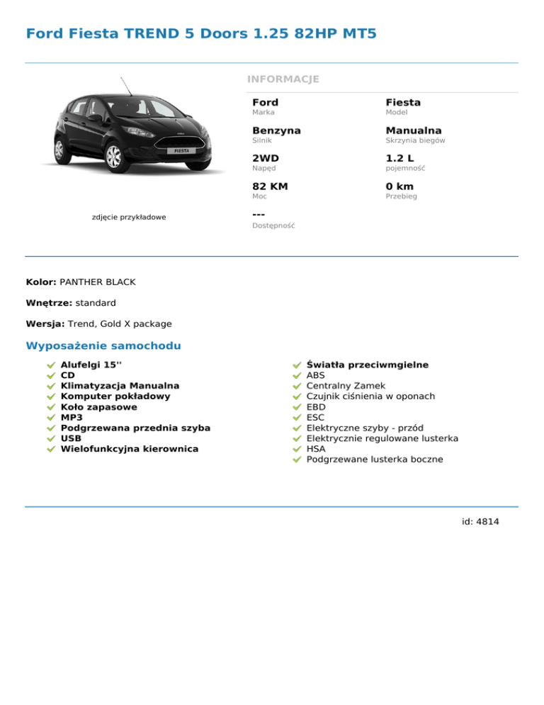 Ford Fiesta TREND 5 Doors 1.25 82HP MT5 INFORMACJE zdjęcie przykładowe Ford Fiesta Marka Model Benzyna Manualna Silnik Skrzynia biegów 2WD 1.2 L Napęd pojemność 82 KM 0 km Moc Przebieg --Dostępność Kolor: PANTHER BLACK Wnętrze: standard Wersja: Trend, Gold X package Wyposażenie samochodu Alufelgi 15'' CD Klimatyzacja Manualna Komputer pokładowy Koło zapasowe MP3 Podgrzewana przednia szyba USB Wielofunkcyjna kierownica Światła przeciwmgielne ABS Centralny Zamek Czujnik ciśnienia w oponach EBD ESC Elektryczne szyby - przód Elektrycznie regulowane lusterka HSA Podgrzewane lusterka boczne id: 4814 Powered by TCPDF (www.tcpdf.org)