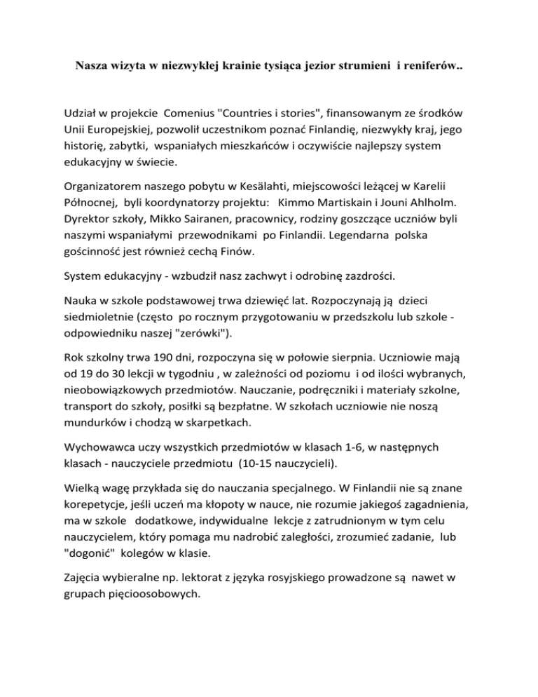 Nasza wizyta w niezwykłej krainie tysiąca jezior strumieni i reniferów.. Udział w projekcie Comenius "Countries i stories", finansowanym ze środków Unii Europejskiej, pozwolił uczestnikom poznać Finlandię, niezwykły kraj, jego historię, zabytki, wspaniałych mieszkańców i oczywiście najlepszy system edukacyjny w świecie. Organizatorem naszego pobytu w Kesälahti, miejscowości leżącej w Karelii Północnej, byli koordynatorzy projektu: Kimmo Martiskain i Jouni Ahlholm. Dyrektor szkoły, Mikko Sairanen, pracownicy, rodziny goszczące uczniów byli naszymi wspaniałymi przewodnikami po Finlandii. Legendarna polska gościnność jest również cechą Finów. System edukacyjny - wzbudził nasz zachwyt i odrobinę zazdrości. Nauka w szkole podstawowej trwa dziewięć lat. Rozpoczynają ją dzieci siedmioletnie (często po rocznym przygotowaniu w przedszkolu lub szkole odpowiedniku naszej "zerówki"). Rok szkolny trwa 190 dni, rozpoczyna się w połowie sierpnia. Uczniowie mają od 19 do 30 lekcji w tygodniu , w zależności od poziomu i od ilości wybranych, nieobowiązkowych przedmiotów. Nauczanie, podręczniki i materiały szkolne, transport do szkoły, posiłki są bezpłatne. W szkołach uczniowie nie noszą mundurków i chodzą w skarpetkach. Wychowawca uczy wszystkich przedmiotów w klasach 1-6, w następnych klasach - nauczyciele przedmiotu (10-15 nauczycieli). Wielką wagę przykłada się do nauczania specjalnego. W Finlandii nie są znane korepetycje, jeśli uczeń ma kłopoty w nauce, nie rozumie jakiegoś zagadnienia, ma w szkole dodatkowe, indywidualne lekcje z zatrudnionym w tym celu nauczycielem, który pomaga mu nadrobić zaległości, zrozumieć zadanie, lub "dogonić" kolegów w klasie. Zajęcia wybieralne np. lektorat z języka rosyjskiego prowadzone są nawet w grupach pięcioosobowych. Do szkoły średniej: ogólnokształcącej lub zawodowej , kwalifikują się uczniowie w zależności od wyników uzyskanych w szkole podstawowej. Wynik egzaminu maturalnego decyduje o możliwości podjęcia studiów. Wyposażenie szkół jest znakomite: komputery, tablice multimedialne w każdej sali, dostęp do internetu, instrumenty muzyczne, bogato wyposażona biblioteka szkolna, miejsca rekreacyjne ze sprzętem sportowym i wypoczynkowym. Wszystko to sprawia, że nauka jest dla uczniów przyjemnością, umożliwia rozwijanie zainteresowań dzieci. Wizyta w szkole średniej w Kitee, a zwłaszcza wspaniały koncert uczniów na instrumentach zwanych "Steel drum", pozostawiła w nas niezatarte wspomnienia. Każdy nauczyciel w szkole posiada, w pokojach 2-3 osobowych, własne "stanowisko pracy": biurko, komputer z dostępem do internetu, drukarkę ... Wspólny pokój nauczycielski integruje zespół pracowników, umożliwia wymianę doświadczeń, przy kawie i ciastku. Dla uczniów szkół zawodowych organizowane są w Joensuu, corocznie zawody o nazwie "Taitaja", które maja na celu sprawdzenie podstawowych umiejętności zawodowych uczestników oraz pomagają w wyborze szkoły młodym widzom przybywającym na tę imprezę z całej Finlandii. Mogliśmy podziwiać sprawność uczniów m.in. w przygotowywaniu posiłków, szyciu, budownictwie, fryzjerstwie, a nawet operowaniu dźwigami do załadunku drewna. Organizatorzy pobytu pokazali nam również zabytki regionu Karelii, piętnastowieczny zamek w Savonlinnie, najdalej na północ wysuniętą murowaną twierdzę największy na świecie drewniany kościół w Kerimäki, mogący pomieścić 5 tysięcy osób, wybudowany w latach w latach 1844 - 1847. 69 % powierzchni Finlandii stanowią lasy, przemysł drzewny jest najważniejszą gałęzią przemysłu , wizyta w muzeum leśnym utworzonym w 1994 roku w Lusto była zatem obowiązkowym punktem pobytu. Wystawy czasowe i stałe prezentują tradycje leśne, florę i faunę kraju. "Sala ciszy" pozwala zachwycić się bogactwem i pięknem natury, poczuć, usłyszeć to, co towarzyszyło człowiekowi u zarania dziejów. Finlandia kojarzy się wszystkim z saniami ciągniętymi przez renifery. W Kesälahti, miejscu naszego pobytu, można było pogłaskać prawdziwego renifera, dotknąć jego delikatnego poroża. Nauczyciele również starali się zrobić sobie zdjęcie z tym zwierzątkiem. Czym byłaby Finlandia bez Muminków? Były wszędzie: książki o ich przygodach, maskotki, kubeczki, ubrania - kolejna podróż, to obowiązkowo, wyprawa do "Doliny Muminków". Powiedzenie: "Podróże kształcą" i tym razem znalazło potwierdzenie. Uczniowie, oprócz wrażeń związanych z poznaniem nowego kraju, jego historii, tradycji, emocjami pierwszego lotu samolotem, pierwszego wyjazdu za granicę, mieli okazję do poznania swoich rówieśników z innych siedmiu państw. Okazało się, że nauka języka angielskiego jest ważna, że warto włożyć trochę wysiłku, by móc, bez potrzeby używania rąk, porozmawiać, bo w Finlandii tego języka (oprócz ojczystego, szwedzkiego i wybranego dodatkowego) uczą się w szkołach wszystkie dzieci. Wymiana adresów mailowych, powiększenie grona znajomych na portalach społecznościowych zachęci do nauki języków obcych, poznania wzajemnego, nawiązania przyjaźni. Nauczyciele stawiają sobie pytanie, co możemy zrobić, ja i moi koledzy w pracy, żeby uczniowie chcieli chodzić do szkoły, byli weseli, zaangażowani, zdyscyplinowani, samodzielni. Jak pracować, żeby w szkole nie było hałasu? W jaki sposób zachęcić rodziców do współpracy (chętnych do przyjęcia dzieci było więcej niż uczestników i rodziny "wyrywały " sobie uczniów). Czy pomimo naszych braków finansowych, udałoby się pozyskać środki na dokształcanie językowe nauczycieli - w każdej odwiedzanej klasie nauczyciel swobodnie rozmawiać z uczestnikami, dzielił się swoją wiedzą, opowiadał o swojej pracy, metodach. Maria Stelmachowska