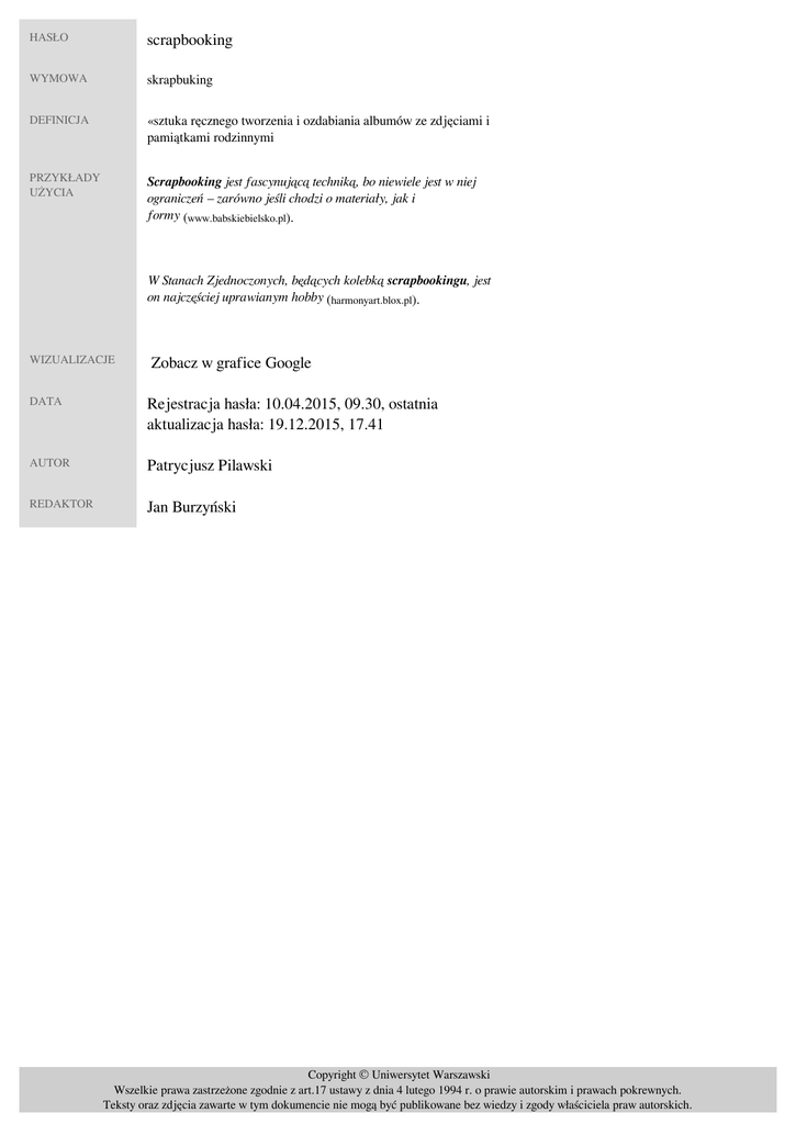 HASŁO scrapbooking WYMOWA skrapbuking DEFINICJA «sztuka ręcznego tworzenia i ozdabiania albumów ze zdjęciami i pamiątkami rodzinnymi» PRZYKŁADY UŻYCIA Scrapbooking jest fascynującą techniką, bo niewiele jest w niej ograniczeń – zarówno jeśli chodzi o materiały, jak i formy (www.babskiebielsko.pl). W Stanach Zjednoczonych, będących kolebką scrapbookingu, jest on najczęściej uprawianym hobby (harmonyart.blox.pl). WIZUALIZACJE Zobacz w grafice Google DATA Rejestracja hasła: 10.04.2015, 09.30, ostatnia aktualizacja hasła: 19.12.2015, 17.41 AUTOR Patrycjusz Pilawski REDAKTOR Jan Burzyński Copyright © Uniwersytet Warszawski Wszelkie prawa zastrzeżone zgodnie z art.17 ustawy z dnia 4 lutego 1994 r. o prawie autorskim i prawach pokrewnych. Teksty oraz zdjęcia zawarte w tym dokumencie nie mogą być publikowane bez wiedzy i zgody właściciela praw autorskich. Powered by TCPDF (www.tcpdf.org)