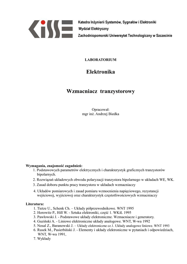 LABORATORIUM Elektronika Wzmacniacz tranzystorowy Opracował: mgr inż. Andrzej Biedka Wymagania, znajomość zagadnień: 1. Podstawowych parametrów elektrycznych i charakterystyk graficznych tranzystorów bipolarnych. 2. Rozwiązań układowych obwodu polaryzacji tranzystora bipolarnego w układach WE, WK. 3. Zasad doboru punktu pracy tranzystora w układach wzmacniaczy 4. Układów pomiarowych i zasad pomiaru wzmocnienia napięciowego, rezystancji wejściowej, wyjściowej oraz charakterystyk częstotliwościowych wzmacniaczy Literatura: 1. Tietze U., Schenk Ch. – Układy półprzewodnikowe. WNT 1995 2. Horowitz P., Hill W. - Sztuka elektroniki, część 1. WKiŁ 1995 3. Pawłowski J. - Podstawowe układy elektroniczne. Wzmacniacze i generatory. 4. Guziński A. - Liniowe elektroniczne układy analogowe. WNT, W-wa 1992 5. Nosal Z., Baranowski J. – Układy elektroniczne cz.1. Układy analogowe liniowe. WNT 1993 6. Rusek M., Pasierbiński J. - Elementy i układy elektroniczne w pytaniach i odpowiedziach, WNT, W-wa 1991, 7. Wykłady 1. Badanie wzmacniacza tranzystorowego w układzie wspólnego emitera 1.1 Korzystając z elementów znajdujących się w obszarze block a zestawu laboratoryjnego KL23003 (p. ZAŁĄCZNIK), połączyć układ wzmacniacza ze sprzężeniem kolektorowym: +12V R6 (R5, R4) R4 OUT C6 Q1 IN C1 R7 C2 Rys. 1. Schemat ideowy wzmacniacza tranzystorowego w układzie wspólnego emitera, ze sprzężeniem kolektorowym 1.2. Określić punkt pracy tranzystora w połączonym układzie. 1.3. Narysować układ pomiaru wzmocnienia napięciowego wzmacniacza. Zmierzyć wzmocnienie dla różnych rezystancji kolektorowych oraz przy załączonym i wyłączonym kondensatorze C2. 1.4. W układzie pomiarowym według poniższego schematu zmierzyć rezystancję wejściową badanych wzmacniaczy. rwy IN G Rd rwe OUT k · uwe V Rys. 2. Układ pomiaru rezystancji wejściowej wzmacniacza 1.5. W układzie pomiarowym według poniższego schematu zmierzyć rezystancję wyjściową badanych wzmacniaczy. rwy IN rwe G OUT V k · uwe Rd Rys. 3. Układ pomiaru rezystancji wyjściowej wzmacniacza 1.6. Dla wybranej wartości rezystancji kolektorowej zmierzyć charakterystykę częstotliwościową wzmacniacza dla załączonego i wyłączonego kondensatora C2. Charakterystykę należy mierzyć w skali logarytmicznej przyjmując wartości częstotliwości równe 1, 2, 4, 6, 8 w każdej dekadzie. 1.7. Korzystając z elementów znajdujących się o w obszarze block a zestawu laboratoryjnego KL23003 (p. ZAŁĄCZNIK), połączyć układ wzmacniacza z potencjometrycznym zasilaniem obwodu bazy: +12V R1 R6 (R5, R4) OUT C6 Q1 IN C1 VR2 R7 C2 R2 Rys. 4. Schemat ideowy wzmacniacza tranzystorowego w układzie wspólnego emitera, z potencjometrycznym zasilaniem bazy. 1.8. W połączonym układzie regulując wartość rezystancji VR2 (zewnętrzny moduł potencjometru o rezystancji 10kom) dobrać punkt pracy, w którym napięcie stałe mierzone między kolektorem tranzystora Q1 a masą będzie wynosić ok. ½ Vcc. Wykonać pomiary według punktów 1.3, 1.4, 1.5, 1.6. 2. Badanie wzmacniacza tranzystorowego w układzie wspólnego kolektora 2.1. Korzystając z elementów znajdujących się w obszarze block c zestawu laboratoryjnego KL23003 (p. ZAŁĄCZNIK) połączyć wzmacniacz w układzie wspólnego kolektora: +12V +5V R15 Q3 IN C5 OUT R16 Rys. 5. Schemat ideowy wzmacniacza tranzystorowego w układzie wspólnego kolektora (wtórnika emiterowego). 2.1. Zmierzyć wzmocnienie napięciowe, rezystancję wejściową, charakterystykę częstotliwościową w układzie wtórnika emiterowego. Sprawozdanie powinno zawierać: schematy układów pomiarowych, spis przyrządów, wyniki pomiarów w tabelach, obliczenia, wykresy charakterystyk, porównanie wartości pomierzonych z wartościami obliczonymi teoretycznie, wnioski. ZAŁĄCZNIK Wykaz elementów: R1 R2 R3 R4 R5 R6 R7 47 kom ± 5%/0,25W 1 kom ± 5%/0,25W 100 kom ± 5%/0,25W 4,7 kom ± 5%/0,25W 3,3 kom ± 5%/0,25W 2,2 kom ± 5%/0,25W 1 kom ± 5%/0,25W C1 C2 C6 22μF/25V 22μF/25V 47μF/25V Q1 2N3904 Fot. 1. Obszar block a zestawu KL23003 Wykaz elementów: Fot. 1. Obszar block c zestawu KL23003 R13 R14 R15 R16 10 kom ± 5% 47 kom ± 5% 22 kom ± 5% 2,2kom ± 5% C1 10μF/25V Q1 2N3904