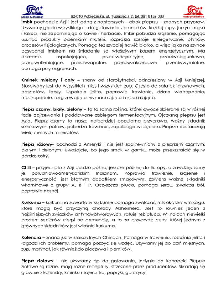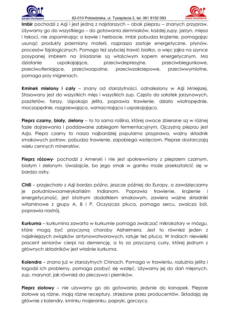 62-010 Pobiedziska, ul. Tysiąclecia 2, tel. 061 8152 083 Imbir pochodzi z Azji i jest jedną z najstarszych – obok pieprzu – znanych przypraw. Używamy go do wszystkiego – do gotowania ziemniaków, każdej zupy, jarzyn, mięsa i łakoci, nie zapominając o kawie i herbacie. Imbir pobudza krążenie, pomagając usunąć produkty przemiany materii, rozprasza zastoje energetyczne, płynów, procesów fizjologicznych. Pomaga też szybciej trawić białko, a więc jajka na szynce posypanej imbirem na śniadanie są właściwym kopem energetycznym. Ma działanie uspokajające, przeciwdepresyjne, przeciwbiegunkowe, przeciwutleniające, przeciwzapalne, przeciwzakrzepowe, przeciwwymiotne, pomaga przy migrenach. Kminek mielony i cały – znany od starożytności, odnaleziony w Azji Mniejszej. Stosowany jest do wszystkich mięs i wszystkich zup. Często do sałatek jarzynowych, pasztetów, farszy. Uspokaja jelita, poprawia trawienie, działa wiatropędnie, moczopędnie, rozgrzewająco, wzmacniająco i uspokajająco. Pieprz czarny, biały, zielony – to ta sama roślina, której owoce zbierane są w różnej fazie dojrzewania i poddawane zabiegom fermentacyjnym. Ojczyzną pieprzu jest Azja. Pieprz czarny to nasza najbardziej popularna przyprawa, ważny składnik smakowych potraw, pobudza trawienie, zapobiega wzdęciom. Pieprze dostarczają wielu cennych minerałów. Pieprz różowy- pochodzi z Ameryki i nie jest spokrewniony z pieprzem czarnym, białym i zielonym. Uważajcie, bo jego smak w garnku może przekształcić się w bardzo ostry. Chili – przyjechało z Azji bardzo późno, jeszcze później do Europy, a zawdzięczamy je południowoamerykańskim Indianom. Poprawia trawienie, krążenie i energetyczność, jest istotnym dodatkiem smakowym, zawiera ważne składniki witaminowe z grupy A, B i P. Oczyszcza płuca, pomaga sercu, zwalcza ból, poprawia nastrój. Kurkuma – kurkumina zawarta w kurkumie pomaga zwalczać mikrokatory w mózgu, które mogą być przyczyną choroby Alzheimera. Jest to również jeden z najsilniejszych związków antynowotworowych, ratuje też płuca. W Indiach niewielki procent seniorów cierpi na demencję, a to za przyczyną curry, której jednym z głównych składników jest właśnie kurkuma. Kolendra – znana już w starożytnych Chinach. Pomaga w trawieniu, rozluźnia jelita i łagodzi ich problemy, pomaga pozbyć się wzdęć. Używamy jej do dań mięsnych, zup, marynat, jak również do pieczywa i pierników. Pieprz ziołowy – nie używamy go do gotowania, jedynie do kanapek. Pieprze ziołowe są różne, mają różne receptury, strzeżone przez producentów. Składają się głównie z kolendry, kminku majeranku, papryki, gorczycy. 62-010 Pobiedziska, ul. Tysiąclecia 2, tel. 061 8152 083 Cynamon – zaliczany do najstarszych przypraw świata. Stosujemy go do aromatyzowania wypieków, ciast, deserów i napojów, ale również do potraw mięsnych, pikantnych sosów, do kawy i herbaty. Przyprawa o smaku słodko – ostrym. Kardamon – pochodzi z Dalekiego Wschodu. Związku antyoksydacyjne w nim zawarte pomagają przywrócić właściwy poziom glutationu, który chroni komórki przed toksynami. Znakomicie podkreśla smak kawy. Napój z imbiru i kardamonu zwalcza skutki wczorajszego szaleństwa. Anyż – używamy do herbaty, zup, mięs, ciast, pierników. W połączeniu z lukrecją oczyszcza płuca Bazylia – znana jest od starożytności, a w Polsce od XVI w. Stosujemy suszoną jako smak kwaśny do mięs i zup. Ten składnik pozwala nam przejść w obiegu przez smaki, służy do aromatyzowania i dosmakowywania, ale nie zrównoważy potrawy. Bazylia ułatwia trawienie i działa pobudzająco. Czarnuszka – ułatwia trawienie i pomaga na wzdęcie, razem z koprem, kminkiem i anyżkiem wspomaga laktację i jest skuteczna przy odrobaczaniu. Działa antyseptycznie i antynowotworowo. W Polsce w piekarniach używano czarnuszki do posypywania chleba, najczęściej białego, a my posypujemy nią kanapki. Cząber – wchodzi w skład bułgarskiej czubricy. Służy do przyprawiania potraw z roślin strączkowych, głównie zupy fasolowej. Poprawia apetyt, działa rozkurczowo, wiatropędnie, zabija pasożyty. Estragon (bylica, draganek) – pochodzi ze wschodniej Azji. Jako ziółko w smaku gorzkim ma bardzo szerokie zastosowanie, zarówno w kuchni południowoeuropejskiej, ale również na wschodnich terenach rosyjskich. Przyprawia się nim sałatki, zupy rybne, drób. Ma działanie przeciwzapalne i bakteriobójcze. Goździki – goździkowiec dojrzewa 20 lat, dopiero po tym czasie można zebrać pierwsze plony. Goździki są to pąki kwiatowe zebrane w odpowiednim momencie, gdy jeszcze nie są otwarte, a potem suszone. Stosuje się je do potraw słodkich (szarlotka, piernik) i pikantnych. Doprawiamy nimi pasztety, duszone mięsa, likiery, grzane wina, no i oczywiście naszą kawę. Goździki mają właściwości lecznicze, antyseptyczne i przeciwbólowe. Kozieradka – ma specyficzny zapach, ale jest super, bez niej Hindusi nie daliby sobie rady. Pochodzi z Azji i jest obok kurkumy ważnym składnikiem curry. Skuteczna w chorobie wrzodowej żołądka, w stanach zapalnych skóry, obniża poziom cholesterolu, działa antyseptycznie, rozkurczowo, żółciopędnie. Pobudza regenerację wszystkich tkanek. Aktywizuje proces krwiotwórczy, działa przeciwalergicznie i mlekopędnie. Podaje się ją dzieciom przy problemach ze 62-010 Pobiedziska, ul. Tysiąclecia 2, tel. 061 8152 083 wzrostem, z przybieraniem na wadze. Skutkiem ubocznym stosowania kozieradki jest specyficzny zapach. Można jej używać do zaprawiania mięs, do sosów, zup, traktując jako smak ostry. Można też dodawać szczyptę do herbaty. Lukrecja – pochodzi z Chin, w medycynie stosowana jest od czasu starożytnego Egiptu. Działa wykrztuśnie, leczy żołądek, wątrobę, nerki i pęcherz moczowy. Współcześnie stwierdzono, że działa przeciwnowotworowo, przeciwwrzodowo i przeciwzapalni