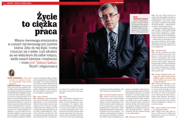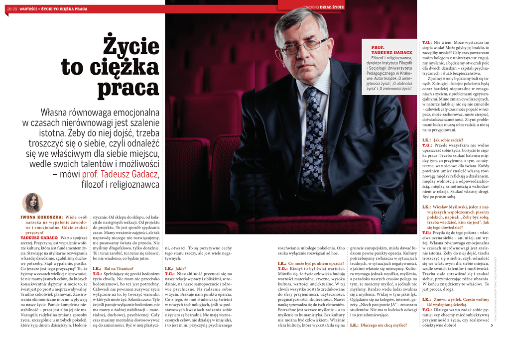 28-29 WARTOŚCI » Ż COACHING Ż Ż Życie to ciężka praca PROF. TADEUSZ GADACZ Filozof i religioznawca, dyrektor Instytutu Filozofii i Socjologii Uniwersytetu Pedagogicznego w Krakowie. Autor książek „O umiejętności życia”, „O ulotności życia” i „O zmienności życia”. Własna równowaga emocjonalna w czasach nierównowagi jest szalenie istotna. Żeby do niej dojść, trzeba troszczyć się o siebie, czyli odnaleźć się we właściwym dla siebie miejscu, wedle swoich talentów i możliwości – mówi prof. Tadeusz Gadacz, filozof i religioznawca T.G.: Nie wiem. Może wystarcza im ciepła woda? Może gdyby jej brakło, to zaczęliby myśleć? Cały czas powtarzam moim kolegom z uniwersytetu: rugujmy myślenie, a będziemy otwierali pole dla dwóch dziedzin – szpitali psychiatrycznych i służb bezpieczeństwa. Z jednej strony będziemy bali się innych. Z drugiej – kolejne pokolenia będą coraz bardziej nieporadne w zmaganiach z życiem, z problemami egzystencjalnymi. Mimo zmian cywilizacyjnych, w naturze ludzkiej nic się nie zmieniło – człowiek cały czas może popaść w rozpacz, może zachorować, może cierpieć, doświadczać samotności. Z tymi problemami ludzie muszą sobie radzić, a nie są na to przygotowani. I.K.: Jak sobie radzić? T.G.: Przede wszystkim nie wolno upraszczać sobie życia, bo życie to ciężka praca. Trzeba szukać balansu między tym, co przyjemne, a tym, co użyteczne, wartościowe dla świata. Każdy powinien umieć znaleźć własną równowagę między refleksją a działaniem, między wolnością a odpowiedzialnością, między samotnością a wchodzeniem w relacje. Szukać własnej drogi. Być po prostu sobą. IWONA KOKOSZK A: Wiele osób narzeka na w ypalenie zawodowe i emocjonalne. Gdzie szukać przyczyn? TADEUSZ GADACZ: Warto spojrzeć szerzej. Przyczyną jest wypalenie w sferze kultury, która jest fundamentem życia. Stawiając na utylitarne rozwiązania w każdej dziedzinie, zgubiliśmy duchowe potrzeby. Stąd wypalenie, pustka. Co jeszcze jest tego przyczyną? To, że żyjemy w czasach wielkiej niepewności, że nie mamy jasnych celów, do których konsekwentnie dążymy. A może to, że świat jest po prostu nieprzewidywalny. Trudno cokolwiek planować. Zawirowania ekonomiczne mocno wpływają na nasze życie. Panuje kompletna niestabilność – praca jest albo jej nie ma. Nastąpiła radykalna zmiana sposobu życia, szczególnie u młodych pokoleń, które żyją dniem dzisiejszym. Hedoni- stycznie. Od sklepu do sklepu, od kolacji do następnych wakacji. Od projektu do projektu. To jest sposób spędzania czasu. Mamy wrażenie zajętości, ale tak naprawdę niczego nie rozwiązujemy, nie posuwamy świata do przodu. Nie myślimy długofalowo, tylko doraźnie. Tu i teraz zarobić, tu i teraz się zabawić, bo nie wiadomo, co będzie jutro. ni, otwarci. To są pozytywne cechy tego stanu rzeczy, ale jest wiele negatywnych. I.K.: Bal na Titanicu? T.G.: Spełniający się grecki hedonizm I.K.: Jakie? T.G.: Niestabilność przenosi się na życia chwilą. Nie mam nic przeciwko hedonizmowi, bo też jest potrzebny. Człowiek nie powinien zużywać życia wyłącznie na to, by tworzyć warunki, w których może żyć. Szkoda czasu. Tyle że jeśli panuje wyłącznie hedonizm, nie ma mowy o żadnej stabilizacji – materialnej, duchowej, psychicznej. Cały czas musimy mentalnie dostosowywać się do zmienności. Być w niej plastycz- nasze relacje w pracy i z bliskimi, w rodzinie, na nasze samopoczucie i zdrowie psychiczne. Na radzenie sobie w życiu. Brakuje nam punktu oparcia. Co z tego, że moi studenci są świetni w nowych technologiach, jeśli w podstawowych kwestiach radzenia sobie z życiem są bezradni. Nie mają wyznaczonych celów, nie działają w imię idei, i to jest m.in. przyczyną psychicznego rozchwiania młodego pokolenia. Ono szuka wyłącznie rozwiązań ad hoc. I.K.: Co może być punktem oparcia? T.G.: Kiedyś to był świat wartości. Mówiło się, że życie człowieka budują wartości materialne, etyczne, wysoka kultura, wartości intelektualne. W tej chwili wszystko zostało zredukowane do sfery przyjemności, użyteczności, pragmatyczności, skuteczności. Nawet naukę sprowadza się do tych elementów. Potrzebne jest szersze myślenie – a to myślenie to humanistyka. Bez kultury nie można być człowiekiem. Właśnie sfera kultury, która wykształciła się na gruncie europejskim, miała dawać ludziom pewne punkty oparcia. Kultury potrzebujemy zwłaszcza w sytuacjach trudnych, w sytuacjach negatywności, z jakimi właśnie się mierzymy. Kultura wymaga jednak wysiłku, myślenia, a paradoks naszych czasów polega na tym, że możemy myśleć, a jednak nie myślimy. Bardzo wielu ludzi zwalnia się z myślenia. Widzę w tym jakiś lęk. Oglądanie się na kolegów, internet, gazety. „Niech pan powie JA” – zmuszam studentów. Nie ma w ludziach odwagi i to jest zdumiewające. I.K.: Dlaczego nie chcą myśleć? większych współczesnych pisarzy polskich, napisał: „Żeby być sobą, trzeba wiedzieć, kim się jest”. Jak się tego dowiedzieć? T.G.: Przyda się do tego pokora – właściwa ocena siebie – ani niżej, ani wyżej. Własna równowaga emocjonalna w czasach nierównowagi jest szalenie istotna. Żeby do niej dojść, trzeba troszczyć się o siebie, czyli odnaleźć się we właściwym dla siebie miejscu, wedle swoich talentów i możliwości. Trzeba stale sprawdzać się i szukać siebie, przymierzając różne ubrania. W końcu znajdziemy to właściwe. To jest proces, droga. I.K.: Znowu wysiłek. Często wolimy iść wydeptaną ścieżką. T.G.: Dlatego warto zadać sobie py- tanie: czy chcemy mieć subiektywną przyjemność z życia, czy realizować obiektywne dobro? MICHAL ŁEPECKI/AGENCJA GAZETA, TOMASZ WIECH/AGENCJA GAZETA I.K.: Wiesław Myśliwski, jeden z naj- 30-31 WARTOŚCI » Ż COACHING Ż Odpowiedzialne podejście do życia wymaga refleksji. Tylko d