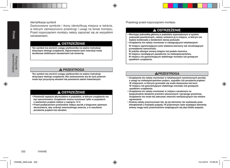 Polski Identyfikacja symboli Zastosowane symbole i ikony identyfikują miejsca w tekście, w których zamieszczono przestrogi i uwagi na temat montażu. Przed rozpoczęciem montażu należy zapoznać się ze wszystkimi ostrzeżeniami. OSTRZEŻENIE Podręcznik wprowadzający Ten symbol ma zwrócić uwagę użytkownika na ważne instrukcje dotyczące obsługi urządzenia. Zignorowanie tych instrukcji może skutkować dotkliwymi obrażeniami lub śmiercią. PRZESTROGA Ten symbol ma zwrócić uwagę użytkownika na ważne instrukcje dotyczące obsługi urządzenia. Nie zastosowanie się do tych poleceń może być przyczyną obrażeń lub powstania szkód materialnych. OSTRZEŻENIE •P otwierdź napięcie akumulatora w pojeździe, w którym urządzenie ma być zamontowane. Urządzenie można montować tylko w pojazdach z zasilaniem prądem stałym o napięciu 12 V. •P rzed podłączeniem przewodów odłącz zacisk z biegunem ujemnym akumulatora, aby uniknąć ewentualnego zwarcia, a w rezultacie porażenia prądem lub obrażeń. 252 VX404E_QSG.indb 252 Przestrogi przed rozpoczęciem montażu OSTRZEŻENIE •M ontując jednostkę główną w pojeździe wyposażonym w system poduszek powietrznych, należy umieścić ją w miejscu, w którym nie będzie kolidowała z działaniem danej poduszki. • Urządzenia nie należy montować w następujących lokalizacjach: W miejscu ograniczającym pole widzenia kierowcy lub utrudniającym prowadzenie samochodu. W pobliżu dźwigni zmiany biegów lub pedału hamulca. W miejscu narażającym pasażerów na niebezpieczeństwo. W miejscu nie gwarantującym stabilnego montażu lub grożącym upadkiem urządzenia. PRZESTROGA •U rządzenia nie należy montować w lokalizacjach wymienionych poniżej z uwagi na niebezpieczeństwo pożaru, wypadku lub porażenia prądem: W miejscach, w których gromadzi się woda deszczowa lub kurz. W miejscu nie gwarantującym stabilnego montażu lub grożącym upadkiem urządzenia. •U rządzenia nie należy montować w miejscu narażonym na bezpośrednie działanie promieni słonecznych i gorącego powietrza. Urządzenie nie może też zakrywać otworów wentylacyjnych lub wlotów ogrzewania. •A ntenę należy przymocować tak, by jej elementy nie wystawały poza którąkolwiek z krawędzi pojazdu. W przeciwnym razie wystające elementy anteny mogą ranić przechodniów znajdujących się zbyt blisko pojazdu. VX404E 14.4.2014 14:49:34 Notatki dotyczące montażu Polski •P rzed podłączeniem przewodów należy je sprawdzić za pomocą multimetru. W wielu nowych pojazdach stosowane są obwody multipleksowe i/lub obwody z niskim napięciem, które mogą zostać uszkodzone w przypadku użycia próbówki świetlnej lub analizatora logicznego. •P rzewody należy podłączyć poprawnie. Nieprawidłowe podłączenie przewodów może być przyczyną pożaru lub wypadku. •U kładając przewody w karoserii pojazdu, należy korzystać z przelotek nieprzewodzących prądu. Zniszczenie powłoki kabli na skutek ocierania może doprowadzić do wypadku, pożaru lub zwarcia. • Po ułożeniu kabli należy je przymocować za pomocą taśmy izolacyjnej. •N ależy pamiętać, iż pozostawienie włączonego silnika pojazdu podczas podłączania przewodów do urządzenia lub ich odłączania grozi porażeniem prądem, obrażeniami lub wypadkiem. Podręcznik wprowadzający PRZESTROGA •N ależy używać wyłącznie części znajdujących się w zestawie. Zastosowanie części pochodzących z nieznanego źródła może być przyczyną uszkodzeń. • Wszystkie otwory wycięte w karoserii należy zakleić przy użyciu kleju silikonowego. Jeśli woda lub spaliny dostaną się do pojazdu, mogą być przyczyną wypadku. •P odczas montażu urządzenia należy pamiętać o mocnym dokręceniu śrub. Poluzowane śruby grożą wypadkiem lub nieprawidłowym działaniem urządzenia. PRZESTROGA Polski OSTRZEŻENIE •P rzed zamontowaniem urządzenia w pojeździe należy zwrócić uwagę na położenie rur, zbiorników na płyny oraz przewodów elektrycznych, ponieważ kontakt urządzenia z tymi częściami może być przyczyną pożaru lub awarii. Notatki dotyczące podłączenia OSTRZEŻENIE •P rzewody nie mogą przeszkadzać w obsłudze, dlatego należy je ułożyć zgodnie ze schematem zamieszczonym w podręczniku użytkownika. •P rzewody/kable należy układać z dala od miejsc, w których panują wysokie temperatury. Stopienie się powłoki kabli może doprowadzić do wypadku lub pożaru na skutek zwarcia. Szczególna ostrożność wymagana jest przy układaniu przewodów w komorze silnika. •U kładając przewody w pojeździe wyposażonym w system poduszek powietrznych, pod żadnym pozorem nie należy umieszczać przewodów w miejscach, które mogą mieć wpływ na działanie danej poduszki powietrznej. W razie wypadku niewłaściwie działająca poduszka powietrzna może zwiększyć ewentualne obrażenia pasażera. VX404E VX404E_QSG.indb 253 253 14.4.2014 14:49:34 Polski MONTAŻ Złącze na kabel HDMI.....................................................................................................1 Kabel z wyjściem RCA....................................................................................................1 Uchwyt kabli....................................................................................................................2 SPIS TREŚCI 1. Zanim rozpoczniesz.................................................................................................28 2. Zawartość opakowania.............................................................................................28 Śruby do montażu równo z powierzchnią .......................................................................8 Wkręt z łbem sześciokątnym..........................................................................................8 3. Ogólne środki ostrożności...................................................................