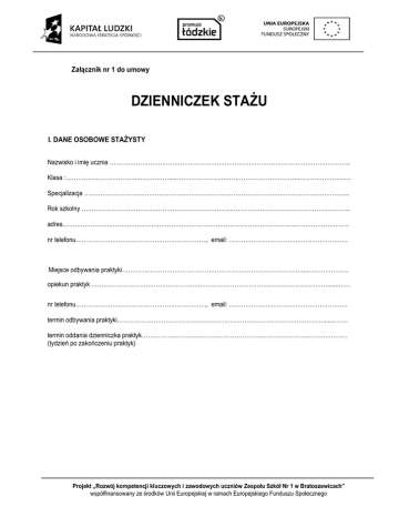 Załącznik nr 1 do umowy DZIENNICZEK STAŻU I. DANE OSOBOWE STAŻYSTY Nazwisko i imię ucznia ………………………………………………………………………………………………………... Klasa :……………………………………………....………….………………………………………………………………... Specjalizacja …………………………………………………………………………………………………………………... Rok szkolny ………………………………………………………………...………………………………………...………... adres……………………………………………………………………………………………………...…………………….. nr telefonu……………………………………………………….., email: ………………………………………………….. Miejsce odbywania praktyki………………………………………………………………………………..………………… opiekun praktyk ……………………………………………………………………………………………………….......…… nr telefonu……………………………………………………….., email: ………………………………………………….. termin odbywania praktyki………………………………………………………………………………………….......……. termin oddania dzienniczka praktyk………………………………………………………………………………………… (tydzień po zakończeniu praktyk) Projekt „Rozwój kompetencji kluczowych i zawodowych uczniów Zespołu Szkół Nr 1 w Bratoszewicach” współfinansowany ze środków Unii Europejskiej w ramach Europejskiego Funduszu Społecznego II. ZAŚWIADCZENIE O ODBYCIU STAŻU …….……………….dnia ………………………………… ………………………………………………. ………………………………………………... (nazwa i adres zakładu ) Zaświadcza się, że …………………………………………………………………………………………………. odbył(a) staż w terminie od…………………………do………………………… w łącznym wymiarze 150 h, zgodnie z programem stażu. Z powierzonych obowiązków stażyst(k)a wywiązywał(a) się: celująco, bardzo dobrze, dobrze, dostatecznie, dopuszczająco, niedostatecznie */. …………………………………………. Pieczęć i podpis ----------------------------------------------*/ właściwe podkreślić Projekt „Rozwój kompetencji kluczowych i zawodowych uczniów Zespołu Szkół Nr 1 w Bratoszewicach” współfinansowany ze środków Unii Europejskiej w ramach Europejskiego Funduszu Społecznego III. ZASADY PROWADZENIA DZIENNICZKA STAŻU l. Każdy stażysta zobowiązany jest do prowadzenia dzienniczka stażu. 2. Planowanie, prowadzenie i kontrolowanie prac w gospodarstwie, jest szczególnie ważne w procesie kształcenia zawodowego, dlatego stażysta powinien interesować się i zajmować tymi wszystkimi pracami. 3. Stażysta musi umieć objaśnić co zapisał w dzienniczku. 4. Tygodniowe sprawozdania zapisane w dzienniczku stażu uczeń przedstawia opiekunowi do zatwierdzenia. 5. Dzienniczek podlega ocenie. Prawidłowe jego prowadzenie jest warunkiem zaliczenia stażu i wypłacenia stypendium stażowego. 6. Dzienniczek należy prowadzić na bieżąco. Wgląd do dzienniczka stażu mają przedstawiciele Organizatora stażu oraz Realizatora stażu. Projekt „Rozwój kompetencji kluczowych i zawodowych uczniów Zespołu Szkół Nr 1 w Bratoszewicach” współfinansowany ze środków Unii Europejskiej w ramach Europejskiego Funduszu Społecznego III. PROGRAM STAŻU ZAWODOWEGO DLA UCZNIÓW TECHNIKUM ŻYWIENIA I USŁUG GASTRONOMICZNYCH czas trwania 150 godzin 1. Kształtowanie bezpiecznych i higienicznych warunków pracy w zakładzie gastronomicznym. Uczeń powinien: wymienić przepisy bhp obowiązujące w zakładzie gastronomicznym, zastosować środki ochrony przeciwpożarowej i ochrony środowiska, ocenić stan bezpieczeństwa i higieny pracy w zakładzie, rozróżniać sposoby oznakowania instalacji technicznych występujących w zakładzie gastronomicznym oraz zastosować zasady bezpiecznego użytkowania instalacji technicznych. 2. Wypadki przy pracy, zagrożenia wypadkowe i choroby zawodowe w gastronomii. Uczeń powinien: wskazać zagrożenia wypadkowe i choroby zawodowe w gastronomii omówić procedury udzielania pierwszej pomocy. 3. Zasady organizacji stanowisk pracy kucharza, technika żywienia i gastronomicznych. Instruktaż pracy na różnych stanowiskach. Uczeń powinien: zorganizować stanowiska pracy do poszczególnych etapów sporządzania potraw lub napojów organizować pracę w zmywalni naczyń kuchennych i stołowych 4. Działalność usługowa zakładów gastronomicznych. Uczeń powinien: omówić zakres świadczonych usług przez zakład gastronomiczny, przestrzegać przepisów prawa dotyczących prowadzenia działalności gospodarczej, określić możliwości funkcjonowania zakładu gastronomicznego w otoczeniu, ustalić jakie czynniki wpływają na popyt na usługi gastronomiczne, określić możliwości współpracy z innymi przedsiębiorstwami gastronomicznymi. 5. Zasady racjonalnego żywienia. Uczeń powinien: wskazać i zastosować w praktyce zasady racjonalnego żywienia. Projekt „Rozwój kompetencji kluczowych i zawodowych uczniów Zespołu Szkół Nr 1 w Bratoszewicach” współfinansowany ze środków Unii Europejskiej w ramach Europejskiego Funduszu Społecznego 6. Metody i systemy zapewnienia właściwej jakości zdrowotnej żywności – regulacje prawne branżowe i procedury zakładowe. Zasady bezpiecznej i higienicznej pracy w gastronomii. Uczeń powinien: wskazać cechy żywno