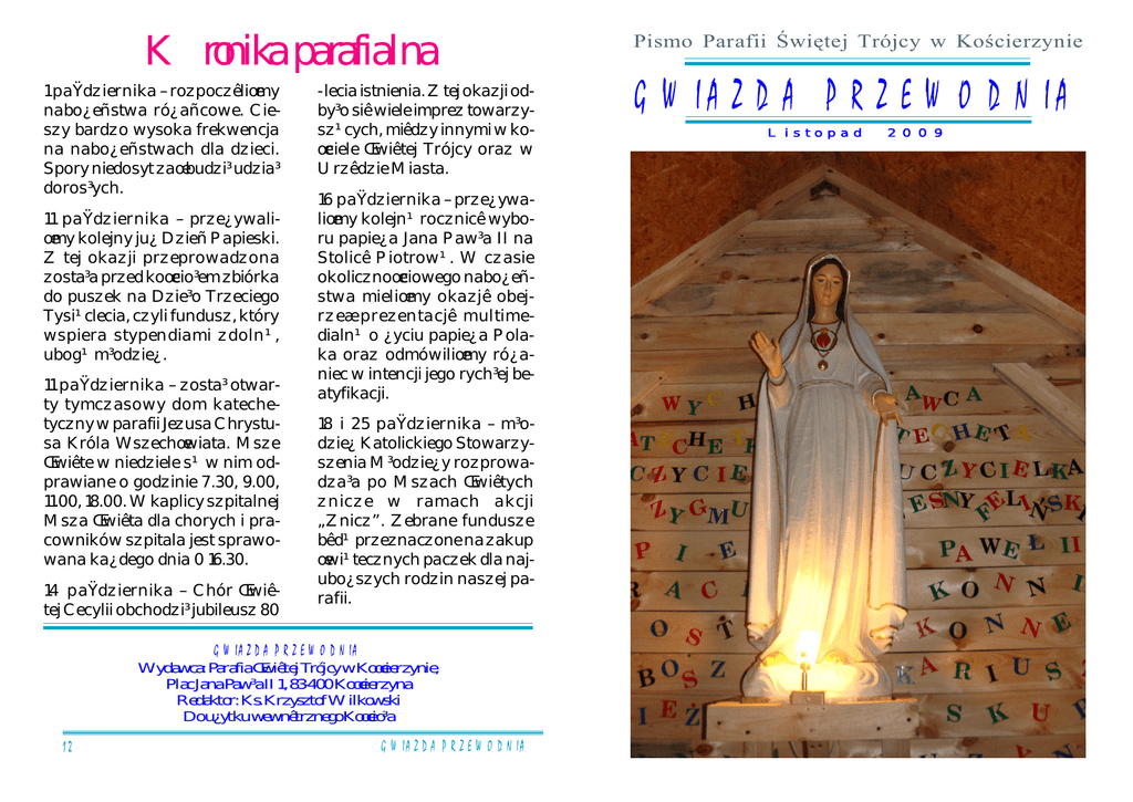 Kronika parafialna 1 paŸdziernika – rozpoczêliœmy nabo¿eñstwa ró¿añcowe. Cieszy bardzo wysoka frekwencja na nabo¿eñstwach dla dzieci. Spory niedosyt zaœ budzi³ udzia³ doros³ych. 11 paŸdziernika – prze¿ywaliœmy kolejny ju¿ Dzieñ Papieski. Z tej okazji przeprowadzona zosta³a przed koœcio³em zbiórka do puszek na Dzie³o Trzeciego Tysi¹clecia, czyli fundusz, który wspiera stypendiami zdoln¹, ubog¹ m³odzie¿. 11 paŸdziernika – zosta³ otwarty tymczasowy dom katechetyczny w parafii Jezusa Chrystusa Króla Wszechœwiata. Msze Œwiête w niedziele s¹ w nim odprawiane o godzinie 7.30, 9.00, 11.00, 18.00. W kaplicy szpitalnej Msza Œwiêta dla chorych i pracowników szpitala jest sprawowana ka¿dego dnia 0 16.30. 14 paŸdziernika – Chór Œwiêtej Cecylii obchodzi³ jubileusz 80 - lecia istnienia. Z tej okazji odby³o siê wiele imprez towarzysz¹cych, miêdzy innymi w koœciele Œwiêtej Trójcy oraz w Urzêdzie Miasta. 16 paŸdziernika – prze¿ywaliœmy kolejn¹ rocznicê wyboru papie¿a Jana Paw³a II na Stolicê Piotrow¹. W czasie okolicznoœciowego nabo¿eñstwa mieliœmy okazjê obejrzeæ prezentacjê multimedialn¹ o ¿yciu papie¿a Polaka oraz odmówiliœmy ró¿aniec w intencji jego rych³ej beatyfikacji. 18 i 25 paŸdziernika – m³odzie¿ Katolickiego Stowarzyszenia M³odzie¿y rozprowadza³a po Mszach Œwiêtych znicze w ramach akcji „Znicz”. Zebrane fundusze bêd¹ przeznaczone na zakup œwi¹tecznych paczek dla najubo¿szych rodzin naszej parafii. GWIAZDA PRZEWODNIA Wydawca: Parafia Œwiêtej Trójcy w Koœcierzynie, Plac Jana Paw³a II 1, 83-400 Koœcierzyna Redaktor: Ks. Krzysztof Wilkowski Do u¿ytku wewnêtrznego Koœcio³a 12 GWIAZDA PRZEWODNIA Pismo Parafii wi tej Trójcy w Ko cierzynie GWIAZDA PRZEWODNIA Listopad 2009 Chwila wspomnieñ Ledwie zd yli my zako czy nabo stwa ró cowe w miesi cu pa dzierniku, a ju przygotowujemy si do kolejnego w naszym yciu adwentu. Miniony czas obfitowa w liczne w yd ar z en ia , st d te czas tak szybko up ywa . Obchodzili my mi dzy innymi kolejny Dzie Papieski, 80 – lecie naszego parafialnego Chóru wi tej Cecylii, urodziny Ksi dza Pra ata Mariana Szczepi skiego. 80 lat temu organista Jan Soro ski zaw Kocierzynie Chór wi tej Cecylii. Od tamtej pory chór nieustannie krzewi kultur muzyczn i upi ksza swoim piewem 2 ró ne wydarzenia ko cielne i pa stwowe. Z tej okazji odby a si uroczysta sesja Rady Miasta Ko cierzyna w Sali im. Ludomira Szopi skiego. W czasie sesji chór zosta wyró niony medalem Tomasza Rogali – drugim co do wa noci odznaczeniem przyz n a wa n y m przez Rad Miasta. Po odebraniu medalu przez dyrygenta, pana organist Leszka Borowicza uczes tnicy sesji wys uchali pi tnastominutowego koncertu chóru, cego zwie czeniem pierwszej ods ony wi towania. Druga ods ona uroczysto ci mia a miejsce w ko ciele parafialGWIAZDA PRZEWODNIA Sakrament Chrztu œw. przyjêli... Alicja Kupper, córka Marka i Marty Aleksander Chmielarz, syn Adama i Anny Zuzanna Kaczmarek, córka Micha³a i Magdaleny Tomasz Stoltmann, syn Adama i Ewy Sandra Kulas, córka Rados³awa i Katarzyny Paulina Bielawa, córka Mariusza i Ma³gorzaty Agata Kalinowska, córka Roberta i Agnieszki Kornelia Maszk, córka Kamila i Anny Maksymilian Kulaszewicz, syn Dominika i Anity Alicja Zwolakiewicz, córka Leszka i Barbary Dawid Muc, syn Adama i Kamili Nela Tuszkowska, córka Marcina i Katarzyny Nataniel Czapiewski, syn Janusza i Katarzyny Konrad Brzoskowski, syn Tomasza i Iwony Cezary Zaborowski, syn Daniela i Emilii Oliwia Potrac, córka Marcina i Justyny Urszula Flisikowska, córka Rados³awa i Anny Roksana Kulas, córka B³a¿eja i Joanny Wiktoria Szmagliñska, córka Rados³awa i Agnieszki Aleksandra Damaszk, córka Marka i Ró¿y Maciej Kuszowski, syn Krzysztofa i Anny Piotr Broskowski, syn Przemys³awa i Anny Wiktoria Okrój, córka Rafa³a i Marii Odeszli do Pana... Jadwiga Knitter, ul. Dworcowa, l. 80. Zofia Skirzewska, Nowe Polaszki, l. 86. Stanis³aw Zaborowski, Koœcierska Huta, l. 81. Maria Zabrocka, ul. Kasztanowa, l. 59. Zbigniew Bia³k, ul. Konopnickiej, l. 48. GWIAZDA PRZEWODNIA Wanda Jastak, Gdañsk, l. 92. Agnieszka Kutela, Koœcierska Huta, l. 84. Waldemar Grobelny, ul. M³yñska, l. 29. Zofia Bednarek, Kaliska, l. 76. 11 REKOLEKCJE ADWENTOWE 29 listopada – 4 grudnia 2009 r. Niedziela – 29 listopada Msze œw.: 6.30, 8.00, 9.30, 11.00 dla dzieci, 12.30 – suma parafialna, 14.00, 15.30 – z b³ogos³awieñstwem ma³ych dzieci i matek oczekuj¹cych potomstwa, 18.00 Poniedzia³ek – 30 listopada; Wtorek – 1 grudnia; Œroda – 2 grudnia; Czwartek – 3 grudnia 6.15 – Msza œw. z homili¹ – Roraty 7.30 – Msza œw. z homili¹ 8.30 – Msza œw. z nauk¹ rekolekcyjn¹ 15.15 – Msza œw. z nauk¹ rekolekcyjn¹ dla m³odzie¿y 16.30 – Msza œw. z nauk¹ rekolekcyjn¹ dla dzieci (szczególnie dzieci pierwszokomunijnych i ich rodziców) 18.00 – Msza œw. z nauk¹ rekolekcyjn¹ Pi¹tek – 4 grudnia – Odpust œw. Barbary 6.15 – Msza œw. z homili¹ – Roraty 8.00 – Msza œw. z homili¹ 9.00 – Msza œw. z homili¹ 11.00 – Msza œw. w koœciele œw. Barbary 15.15 – Msza œw. z homili¹ 16.30 – Msza œw. z homili¹ 18.00 – Suma odpustowa pod przewodnictwem J.E. Ksiêdza Biskupa Piotra Krupy SpowiedŸ œw. z udzia³em kap³anów z s¹siednich parafii œroda – 2 grudnia – od godz. 8.00 do 11.00 i 14.30 do 19.00 czwartek – 3 grudnia – od godz. 8.00 do 11.00 i 14.30 do 18.15 Przygotuj swoje serce na przyjœcie Pana! Serdecznie zapraszmy do udzia³u w rekolekcjach 10 GWIAZDA PRZEWODNIA nym wi tej Trójcy. Najpierw odby si koncert w ho dzie Janowi Pawowi II, po czym zosta y wr czone ogos awie stwa Ksi dza Biskupa – udzielone na pro duchowego opiekuna chóru – ksi dza pra ata Mariana Szczepi skiego. ogos awie stwa otrzymali dyrygent oraz siedmiu chórzystów z najd szym sta em. Dodatkowo ksi dz pra at wspólnie z ksi dzem kanonikiem Tomaszem Rakowskim oraz przewodnicz cym Rady Miasta Stani