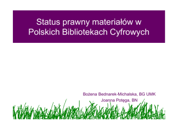 Status prawny materiałów w Polskich Bibliotekach Cyfrowych Bożena Bednarek-Michalska, BG UMK Joanna Potęga, BN Czy musimy oznaczać status prawny materiałów w PBC? Do tej pory tego nie robiliśmy, ale coraz częściej dostawaliśmy pytania od naszych użytkowników: • Czy wolno pobrać z BC całą książkę, czasopismo, pocztówkę? • Czy wolno je wykorzystać w wydaniu jakiejś nowej pozycji? • Czy wolno je wykorzystać do celów edukacyjnych, w jakim zakresie? • Czy wolno kopiować fragmenty, całości - ile? • i inne trudne pytania… Bardzo często nie potrafiliśmy na nie odpowiedzieć, bo nie znaliśmy prawa autorskiego. Pytania te uświadomiły nam, że musimy znać prawo i zacząć je stosować w praktyce bibliotecznej. Poza tym w schemacie Dublin Core jest pole RIGHTS – PRAWA, którego w MARC-u nie było. Pole RIGHTS w DC Wczoraj: Term Name: rights URI: http://purl.org/dc/elements/1.1/rights Label: Rights Definition: Information about rights held in and over the resource. Comment: Typically, rights information includes a statement about various property rights associated with the resource, including intellectual property rights. Dziś: Nazwa terminu: Rights URI: http://purl.org/dc/terms/rights Etykieta: Prawa Definicja: Informacje o prawach zawartych w zasobie lub o prawach do zasobu. Komentarz: Zazwyczaj informacje o prawach zawierają klauzule dotyczące praw własności związanych z zasobem, w tym praw własności intelektualnej. Rodzaj terminu: Property Uszczegóławia: http://purl.org/dc/elements/1.1/rights Należy do zakresu: http://purl.org/dc/terms/RightsStatement Wersja: http://dublincore.org/usage/terms/history/#rightsT-001 Nowy termin –Właściciel praw Nazwa terminu: rightsHolder URI: http://purl.org/dc/terms/rightsHolder Etykieta: Właściciel praw Definicja: Osoba lub instytucja mająca prawa do zasobu lub nimi zarządzająca. Rodzaj terminu: Property Należy do zakresu: http://purl.org/dc/terms/Agent Wersja: http://dublincore.org/usage/terms/history/#rightsHolder-002 Nowy termin: Licencja Nazwa Terminu: License URI: http://purl.org/dc/terms/license Etykieta: Licencja Definicja: Dokument prawny oficjalnie pozwalający na dysponowanie danym Rodzaj Terminu: Property Uszczegóławia: http://purl.org/dc/elements/1.1/rights Uszczegóławia: http://purl.org/dc/terms/rights Należy do zakresu: http://purl.org/dc/terms/LicenseDocument Wersja: http://dublincore.org/usage/terms/history/#license-002 Nowy termin: Prawa dostępu Nazwa terminu: accessRights URI: http://purl.org/dc/terms/accessRights Etykieta: Prawa dostępu Definicja: Informacje o tym, kto ma dostęp do zasobu lub wskazanie statusu bezpieczeństwa. Komentarz: Prawa dostępu mogą zawierać informacje o dostępie lub jego ograniczeniach ze względu na ochronę prywatności, bezpieczeństwo lub inne reguły. Rodzaj terminu: Property Uszczegóławia: http://purl.org/dc/elements/1.1/rights Uszczegóławia: http://purl.org/dc/terms/rights Należy do zakresu: http://purl.org/dc/terms/RightsStatement Wersja: http://dublincore.org/usage/terms/history/#accessRights-002 ŚWIAT a Polska Zobaczmy jak to wygląda na świecie! Czy inni także uważają, że oznaczenia prawne są potrzebne i jak to robią? „Rights” w zagranicznych bibliotekach cyfrowych (projekty digitalizacyjne) Wykorzystanie elementu „Rights”: • informacje o właścicielu praw; • zasadach, trybach dostępu (np. ograniczeniach); • odesłania do podstron informujących o polityce copyrightowej danego projektu (instytucji, przepisów prawa danego kraju) dla kolekcji. Element „Rights”: • powtarzalny – dla rozróżnienia poszczególnych informacji; • wykorzystanie doprecyzowań (DCTerms); • „etykietowanie” (nazywanie) bywa całkowicie dowolne. The Library of Congress American Memory „Kolekcyjne” podejście: Informacje o restrykacjach prawa autorskiego oraz możliwości kopiowania i prywatnego wykorzystywania znajdują się przy każdej z kolekcji (na oddzielnej podstronie). Np.: The Carl Van Vechten Photographs Collection. The University of Washington Libraries' Digital Initiatives Program Metadata Implementation Group: • Metadata Guidelines: for people who want to mount digital collections using CONTENTdm software. • Data Dictionaries (a.k.a. schemas, metadata application profiles or MAPS): metadata elements, mappings to external schema, CONTENTdm database configuration properties, and data formatting instructions for various digital projects.) Metadata Guidelines : DC RIGHTS • Oświadczenie o prawach autorskich lub innych, informacja o ograniczeniach związanych z zasobami (lub odnośnik do tego oświadczenia). • W niektórych projektach UW informacje o PA na stronie kolekcji bez powtarzania tej informacji w metadanych dla każdego obiektu: (Restrictions: http://content.lib.washington.edu/aipnw/copyrights.html - i link do podstrony: Copyrights and Permissions Statements). • Stosowanie znaków wodnych z informacją o prawach autorskich. The University of Washington Libraries' Digital Initiatives Program DC Element: Prawa Przykładowe nazwy pól: * Rights * Restrictions („Copying, printing, or distributing this image without the permission of the copyright holder is expressly prohibited” „Used with permission”) * Copyright * Copyright Holder („public domain”, „Rogers, Millard B.; Art Image Library, University of Washington”) Zalecenia: - forma zapisu: Nazwisko, Imię - używanie kontrolowanych słowników: - Library of Congress/National Authority File (LCAF) Union List of Artist Names (ULAN) The Carolina Digital Library and Archives North Carolina Maps Metadata Schema: Copyright Information: „Information on the copyright holder, or a public domain statement” Rights and Permissions: „This could be either a general statement about reproducing or publishing the map image, a specific statement about rights for an individual map, or simply a link to a general statement about rights