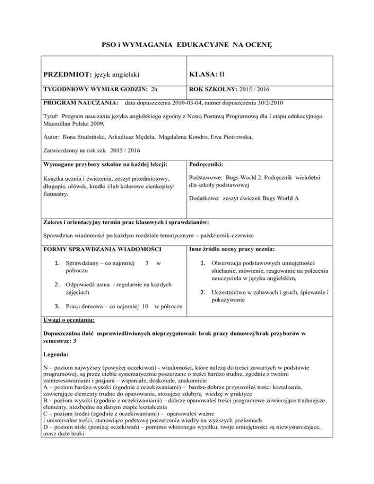 PSO i WYMAGANIA EDUKACYJNE NA OCENĘ PRZEDMIOT: język angielski KLASA: II TYGODNIOWY WYMIAR GODZIN: 2h ROK SZKOLNY: 2015 / 2016 PROGRAM NAUCZANIA: data dopuszczenia 2010-03-04, numer dopuszczenia 30/2/2010 Tytuł: Program nauczania języka angielskiego zgodny z Nową Postawą Programową dla I etapu edukacyjnego. Macmillan Polska 2009, Autor: Ilona Studzińska, Arkadiusz Mędela, Magdalena Kondro, Ewa Piotrowska, Zatwierdzony na rok szk. 2015 / 2016 Wymagane przybory szkolne na każdej lekcji: Podręczniki: Książka ucznia i ćwiczenia, zeszyt przedmiotowy, długopis, ołówek, kredki i/lub kolorowe cienkopisy/ flamastry. Podstawowe: Bugs World 2. Podręcznik wieloletni dla szkoły podstawowej Dodatkowe: zeszyt ćwiczeń Bugs World A Zakres i orientacyjny termin prac klasowych i sprawdzianów: Sprawdzian wiadomości po każdym rozdziale tematycznym – październik-czerwiec FORMY SPRAWDZANIA WIADOMOŚCI 1. Sprawdziany – co najmniej 3 w półroczu Inne źródła oceny pracy ucznia:. 1. Obserwacja podstawowych umiejętności: słuchanie, mówienie, reagowanie na polecenia nauczyciela w języku angielskim, 2. Odpowiedź ustna - regularnie na każdych zajęciach 2. Uczestnictwo w zabawach i grach, śpiewanie i pokazywanie 3. Praca domowa – co najmniej 10 w półroczu Uwagi o ocenianiu: Dopuszczalna ilość usprawiedliwionych nieprzygotowań: brak pracy domowej/brak przyborów w semestrze: 3 Legenda: N – poziom najwyższy (powyżej oczekiwań) - wiadomości, które należą do treści zawartych w podstawie programowej, są przez ciebie systematycznie poszerzane o treści bardzo trudne, zgodnie z twoimi zainteresowaniami i pasjami – wspaniale, doskonale, znakomicie A – poziom bardzo wysoki (zgodnie z oczekiwaniami) – bardzo dobrze przyswoiłeś treści kształcenia, zawierające elementy trudne do opanowania, stosujesz zdobytą wiedzę w praktyce B – poziom wysoki (zgodnie z oczekiwaniami) – dobrze opanowałeś treści programowe zawierające trudniejsze elementy, niezbędne na danym etapie kształcenia C – poziom średni (zgodnie z oczekiwaniami) – opanowałeś ważne i uniwersalne treści, stanowiące podstawę poszerzania wiedzy na wyższych poziomach D – poziom niski (poniżej oczekiwań) – pomimo włożonego wysiłku, twoje umiejętności są niewystarczające, masz duże braki E – poziom najniższy (poniżej oczekiwań) – nie opanowałeś podstawowych treści i umiejętności programowych, nie podejmowałeś wysiłku i odmawiałeś wykonania zadania N otrzymuje uczeń, który: Potrafi się przywitać i pożegnać, zapytać o imię i przedstawić się Potrafi przedstawić inne osoby Pyta i określa samopoczucie Wyraża posiadanie Zna, pamięta, potrafi zapisać i powiedzieć słowa (kolory, przybory szkolne, słownictwo komputerowe, zwierzęta, ubrania, pomieszczenia domowe, życie na wsi, zwierzęta domowe, rodzina, części ciała, dni tygodnia, jedzenie, posiłki, życie żaby, święta i wydarzenia) Rozumie pytania charakterystyczne dla każdego rozdziału i odpowiada na nie Rozumie sens historyjek, rozumie pytania n-la i odpowiada na nie Rozumie polecenia i wykonuje je Stosuje tryb rozkazujący Wyraża umiejętności Samodzielnie śpiewa piosenki Potrafi wyrażać życzenia Udziela pełnych odpowiedzi na pytania ogólne i szczegółowe Potrafi przedstawić członków rodziny Używa przymiotników przy opisywaniu Określa dni tygodnia Odrabia zadania domowe Aktywnie uczestniczy w zajęciach Jest przygotowany do zajęć Wykonuje zadania na podstawie informacji usłyszanych Chętnie bierze udział w zabawach i grach A otrzymuje uczeń, który: Potrafi się przywitać i pożegnać, zapytać o imię i przedstawić się Potrafi przedstawić inne osoby Pyta i określa samopoczucie Wyraża posiadanie Zna, pamięta, potrafi zapisać (z małą ilością błędów) i powiedzieć słowa (kolory, przybory szkolne, słownictwo komputerowe, zwierzęta, ubrania, pomieszczenia domowe, życie na wsi, zwierzęta domowe, rodzina, części ciała, dni tygodnia, jedzenie, posiłki, życie żaby, święta i wydarzenia) Rozumie pytania charakterystyczne dla każdego rozdziału i odpowiada na nie Rozumie sens historyjek, rozumie pytania n-la i odpowiada na nie Rozumie polecenia i wykonuje je Stosuje tryb rozkazujący Wyraża umiejętności Samodzielnie śpiewa piosenki Potrafi wyrażać życzenia Udziela pełnych odpowiedzi na pytania ogólne i szczegółowe ( z pomocą nauczyciela) Potrafi przedstawić członków rodziny Używa przymiotników przy opisywaniu Odrabia zadania domowe Aktywnie uczestniczy w zajęciach Jest przygotowany do zajęć Wykonuje zadania na podstawie informacji usłyszanych Chętnie bierze udział w zabawach i grach Śpiewa poznane piosenki B otrzymuje uczeń, który: Potrafi się przywitać i pożegnać, zapytać o imię i przedstawić się Potrafi przedstawić inne osoby Pyta i określa samopoczucie Zna, pamięta , zapisuje z pomocą nauczyciela i dosyć poprawnie wypowiada słowa (kolory, przybory szkolne, słownictwo komputerowe, zwierzęta, ubrania, pomieszczenia domowe, życie na wsi, zwierzęta domowe, rodzina, części ciała, dni tygodnia, jedzenie, posiłki, życie żaby, święta i wydarzenia) Rozumie pytania charakterystyczne dla każdego rozdziału Rozumie sens historyjek, rozumie pytania n-la i odpowiada na nie (z pomocą) Rozumie polecenia i wykonuje je Wyraża umiejętności z pomocą n-la Śpiewa piosenki Udziela pełnych odpowiedzi na pytania ogólne Potrafi przedstawić członków rodziny (z pomocą n-la) Dosyć aktywnie uczestniczy w zajęciach Wykonuje zadania na podstawie informacji usłyszanych (z pomocą n-la) Chętnie bierze udział w zabawach i grach C otrzymuje uczeń, który: Potrafi się przywitać i pożegnać, zapytać o imię i przedstawić się Pyta i określa samopoczucie Z trudnością pamięta , zapisuje z błędami i słabo wypowiada słowa (kolory, przybory szkolne, słownictwo komputerowe, zwierzęta, ubrania, pomiesz