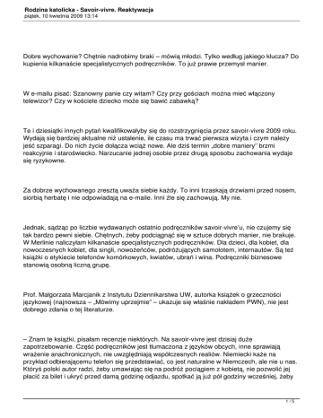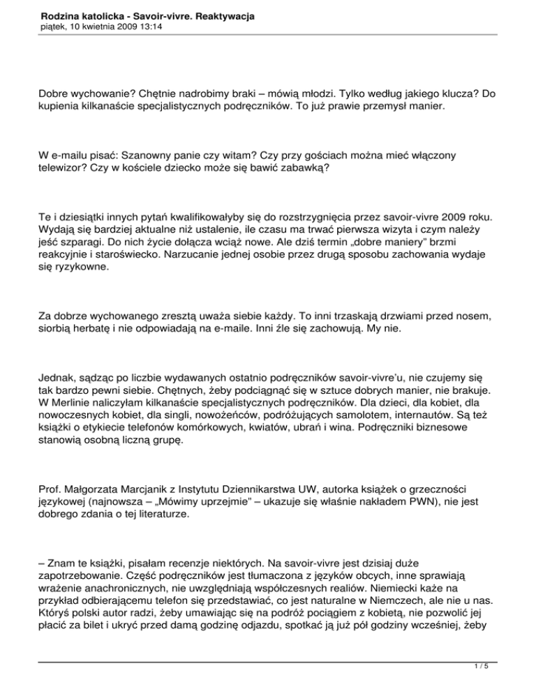 Rodzina katolicka - Savoir-vivre. Reaktywacja piątek, 10 kwietnia 2009 13:14 Dobre wychowanie? Chętnie nadrobimy braki – mówią młodzi. Tylko według jakiego klucza? Do kupienia kilkanaście specjalistycznych podręczników. To już prawie przemysł manier. W e-mailu pisać: Szanowny panie czy witam? Czy przy gościach można mieć włączony telewizor? Czy w kościele dziecko może się bawić zabawką? Te i dziesiątki innych pytań kwalifikowałyby się do rozstrzygnięcia przez savoir-vivre 2009 roku. Wydają się bardziej aktualne niż ustalenie, ile czasu ma trwać pierwsza wizyta i czym należy jeść szparagi. Do nich życie dołącza wciąż nowe. Ale dziś termin „dobre maniery” brzmi reakcyjnie i staroświecko. Narzucanie jednej osobie przez drugą sposobu zachowania wydaje się ryzykowne. Za dobrze wychowanego zresztą uważa siebie każdy. To inni trzaskają drzwiami przed nosem, siorbią herbatę i nie odpowiadają na e-maile. Inni źle się zachowują. My nie. Jednak, sądząc po liczbie wydawanych ostatnio podręczników savoir-vivre’u, nie czujemy się tak bardzo pewni siebie. Chętnych, żeby podciągnąć się w sztuce dobrych manier, nie brakuje. W Merlinie naliczyłam kilkanaście specjalistycznych podręczników. Dla dzieci, dla kobiet, dla nowoczesnych kobiet, dla singli, nowożeńców, podróżujących samolotem, internautów. Są też książki o etykiecie telefonów komórkowych, kwiatów, ubrań i wina. Podręczniki biznesowe stanowią osobną liczną grupę. Prof. Małgorzata Marcjanik z Instytutu Dziennikarstwa UW, autorka książek o grzeczności językowej (najnowsza – „Mówimy uprzejmie” – ukazuje się właśnie nakładem PWN), nie jest dobrego zdania o tej literaturze. – Znam te książki, pisałam recenzje niektórych. Na savoir-vivre jest dzisiaj duże zapotrzebowanie. Część podręczników jest tłumaczona z języków obcych, inne sprawiają wrażenie anachronicznych, nie uwzględniają współczesnych realiów. Niemiecki każe na przykład odbierającemu telefon się przedstawiać, co jest naturalne w Niemczech, ale nie u nas. Któryś polski autor radzi, żeby umawiając się na podróż pociągiem z kobietą, nie pozwolić jej płacić za bilet i ukryć przed damą godzinę odjazdu, spotkać ją już pół godziny wcześniej, żeby 1/5 Rodzina katolicka - Savoir-vivre. Reaktywacja piątek, 10 kwietnia 2009 13:14 się nie spóźniła i – co damy uwielbiają – nie zatrzymywała odjeżdżającego już pociągu. Rzeczywiście, trzeba nie znać polskiej rzeczywistości, żeby namawiać kogoś na randkę na Dworcu Centralnym. Literatura służąca sztuce życia nie powstaje dzisiaj w salonach arystokracji. Rolę wychowawcy od elit przejęły osoby publiczne. Ich sposób ubierania, zachowania, mówienia stanowi wytyczne dla mas. Zdawałoby się, że media pilnują standardów, przynajmniej się starają. Prowadzący wiadomości dziennikarze zwracają się do nas grzecznie, mówią dziękuję i proszę. Ale wystarczy jedno czy dwa nagrania puszczone na dziko w Internecie, żeby prysł czar ich kultury słownej. Czy spotyka się to z dezaprobatą? Sądząc po wpisach w Internecie, słysząc, co mówi prowadzący, kiedy nie jest na fonii, ludzie oddychają z ulgą. – Facet naprawdę nie jest takim sztywniakiem, na jakiego wygląda. Bluzga jak każdy z nas. W podobnej postawie utwierdzają wypowiedzi showmanów i polityków, z których niektórzy także są showmanami. Powiedzieć o kimś cham, idiota czy kretyn – nie ma sprawy. Zapewni to popularność, jest swojskie i bezpośrednie. Jak zachowanie Kuby Wojewódzkiego, który rozwala się na kanapie, wrzeszczy na gości i robi z nich niewybredne żarty. Widownia czuje, że to swój chłop. Nie będą nas pouczać żadne hrabiny – myślą ludzie. Zrobiło się trochę jak za PRL – precz z elitami, niech żyje lud. Tylko dzisiaj lud nie jest z fabryk i hut, ale z kanapy w telewizyjnym studio. Demokracja bez sfer Czy dawniej maniery były lepsze, nie wiadomo. Podręczniki i kodeksy istniały także, jak słynny kodeks Boziewicza, ale było ich mniej. Savoir-vivre był nie po to, żeby narzucać puste reguły, ale ułatwiać życie. Trzymać łokcie przy sobie oznaczało zrobić więcej miejsca dla sąsiada, porządek sztućców na stole wynikał z kolejności jedzenia potraw. Ale paradoksalnie ludzie, których savoir-vivre dotyczył, mniej go potrzebowali. Z pewnym zestawem zachowań człowiek się rodził. Potem wzrastał otoczony ludźmi, którzy te sprawy rozumieli podobnie. Granice własnej klasy społecznej przekraczało się nie w sytuacjach towarzyskich, lecz po to, by wydać polecenia służbie. W demokracji nie ma już sfer. Każdy obcuje z każdym, chce czy nie chce. Mijam w parku 2/5 Rodzina katolicka - Savoir-vivre. Reaktywacja piątek, 10 kwietnia 2009 13:14 grupkę młodzieży, która pije piwo, siedząc na oparciach ławek, nogi trzymając na siedzeniu i zaznaczając strefę wokół pustymi butelkami i opakowaniami po chipsach. Zwrócić uwagę? Nie zwracam, bo wiem, że mogę liczyć tylko na parę bluzgów. Profesor Marcjanik tłumaczy: – W starciu z grupą pojedyncza osoba nie ma szans. I dodaje: – W polskim savoir-vivrze pouczanie jest źle widziane. Traktuje się je jako wywyższanie, a to przeczy zasadzie skromności. Czy zachowanie tych nastolatków należy rozpatrywać jeszcze w kategoriach savoir-vivre’u czy już patologii społecznej? A może to tylko przekroczenie norm? Nikomu krzywda się nie dzieje od tego, że ktoś trzyma nogi na ławce. Najwyżej ktoś inny będzie musiał oddać płaszcz do pralni. Czy za przysłowiowych naszych czasów było lepiej? – Nic podobnego – odpowiada prof. Marcjanik, która niedawno przeprowadziła w warszawskich liceach anonimową ankietę na temat savoir-vivre’u. Pytała, czy grzeczność młodych ludzi różni się od grzeczności starszych. Jeśli tak, to czym? Padło także pytanie o wzory: są nimi r