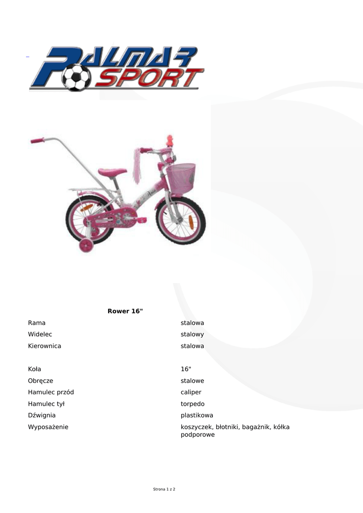 Rower 16" Rama stalowa Widelec stalowy Kierownica stalowa Koła 16" Obręcze stalowe Hamulec przód caliper Hamulec tył torpedo Dźwignia plastikowa Wyposażenie koszyczek, błotniki, bagażnik, kółka podporowe Strona 1 z 2 Strona 2 z 2