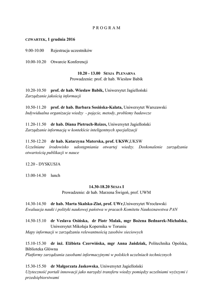 P R O G R A M CZWARTEK, 1 grudnia 2016 9.00