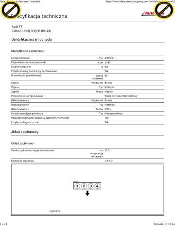 Specyfikacja techniczna | Autodata X Cha ng https://workshop.autodata-group.com/vehicle/component/td X Cha PD e F- ng N .c .d o m o m w o c u -tr a c k C lic k to bu y N y bu to k lic C 1 z 13 Specy kacja techniczna w w .d o w w w e O W ! F- O W ! PD c u -tr a c k .c Audi TT CDAA/1.8 (8J3/8J9) (06-14) Identy kacja samochodu Identy kacja samochodu Liczba cylindrów Pojemno Typ 4/DOHC skokowa (podatek) Stopie spr ccm 1789 ania :1 9,6 Przystosowany do benzyny bezo owiowej Tak Minimalna liczba oktanowa Liczba 95 oktanowa Zap on Producent Bosch Zap on Typ Motronic Zap on Rodzaj Map-DI Po o enie ko a impulsowego Wa ek rozrz du/Wa korbowy Uk ad paliwowy Producent Bosch Uk ad paliwowy Typ Motronic Uk ad paliwowy Rodzaj MFI-s Pomiar przep ywu powietrza Typ Masa powietrza Po czony komputer steruj cy zap onem/wtryskiem Tak Przy cze diagnostyczne Tak Uk ad zap onowy Uk ad zap onowy Cewka zap onowa, napi cie minimalne Kolejno zap onów + z 12,0 rezystancj wst pn V 1-3-4-2 Fig75573 2016-09-16 13:16 Specyfikacja techniczna | Autodata X Cha ng https://workshop.autodata-group.com/vehicle/component/td X Cha PD e F- ng N bu y N y bu to k lic .c .d o m o m w o c u -tr a c k C to k lic C 2 z 13 Ustawienie zap onu i test spalin w w .d o w w w e O W ! F- O W ! PD c u -tr a c k .c Ustawienie zap onu i test spalin Warunki ustawiania Warunki regulacji Sprawdzi nastawy podstawowe odpowiednim przyrz dem diagnostycznym. Nastawy podstawowe - przed GMP °KW/1/min Nie podlega regulacji Zmiana k ta wyprzedzenia zap onu °KW/1/min Regulowany przez komputer steruj cy Liczba obrotów biegu ja owego 1/min 720±80 Nie podlega regulacji °C 80 Temperatura oleju silnikowego podczas testu CO Zawarto CO na biegu ja owym - rura uk adu wydechowego Obj to % 0,2 Max Nie podlega regulacji CO Zawarto CO na biegu ja owym - na rurze pomiarowej CO Obj to % Nie podlega regulacji CO Wska nik HC na obrotach biegu ja owego ppm 100 Wska nik CO2 na obrotach biegu ja owego Obj to % 14,5-16 CO2 Wska nik O2 na obrotach biegu ja owego Obj to % 0,1-0,3 O2 Podwy szona liczba obrotów biegu ja owego Zawarto Warto CO przy podwy szonej liczbie obrotów biegu ja owego lambda przy podwy szonej liczbie obrotów biegu ja owego 1/min 2500-3000 Obj to % 0,2 0,97-1,03 wiece zap onowe wiece zap onowe wiece zap onowe wiece zap onowe wiece zap onowe wiece zap onowe Wyposa enie Bosch fabryczne Typ FR6KPP332S Producent Bosch Typ FR6KPP332S Uk ad paliwowy Uk ad paliwowy Ci nienie t oczenia pompy paliwa bar 3,0-7,0 Obs uga - sprawdzanie i ustawianie Obs uga - sprawdzanie i ustawianie Luz zaworowy - strona ss ca mm Hydrauliczny 2016-09-16 13:16 Specyfikacja techniczna | Autodata X Cha ng https://workshop.autodata-group.com/vehicle/component/td X Cha PD e F- ng 3 z 13 N ania Ci nienie oleju bar 7,0-14,0 w .d o o m o .c Ci nienie spr c u -tr a c k m C lic k to mm Hydrauliczny w w .d o bu y N y bu to k lic C Luz zaworowy - strona wydechowa w w w e O W ! F- O W ! PD c u -tr a c k .c bar/1/min Ci nienie oleju Obroty biegu ja owego = 1,2-2,0 bar 2000 obr./min. = 1,6-2,2 bar 3700 obr./min. = 3,0-4,0 bar Podczas docierania = 3,0-4,0 bar Zamkni cie ch odnicy bar 1,40-1,60 Smary i ilo ci nape niania Oleje silnikowe Temperatura otoczenia Klasa lepko ci oleju silnikowego Wszystkie temperatury SAE 0W-30, 0W-40 Klasa lepko ci oleju silnikowego Olej LongLife Klasy kacja oleju silnikowego Temperatura otoczenia Klasa lepko ci oleju silnikowego Klasy kacja oleju silnikowego Temperatura otoczenia Klasa lepko ci oleju silnikowego Klasy kacja oleju silnikowego Temperatura otoczenia Klasa lepko ci oleju silnikowego Klasy kacja oleju silnikowego Temperatura otoczenia Klasa lepko ci oleju silnikowego OEM VW 503.01 Wszystkie temperatury SAE 0W-30, 0W-40 OEM VW 502.00 Wszystkie temperatury SAE 5W-30, 5W-40 OEM VW 502.00 15°C SAE 5W-30, 5W-40 OEM VW 501.01 Wszystkie temperatury SAE 5W-30 Klasa lepko ci oleju silnikowego Olej LongLife Klasy kacja oleju silnikowego Temperatura otoczenia Klasa lepko ci oleju silnikowego Klasy kacja oleju silnikowego Temperatura otoczenia Klasa lepko ci oleju silnikowego Klasy kacja oleju silnikowego Temperatura otoczenia Klasa lepko ci oleju silnikowego OEM VW 504.00 -20°C 15°C SAE 10W-30, 10W-40 OEM VW 501.01 Wszystkie temperatury SAE 10W-40 OEM VW 502.00 Wszystkie temperatury SAE 10W-50, 10W-60 2016-09-16 13:16 Specyfikacja techniczna | Autodata X Cha ng e https://workshop.autodata-group.com/vehicle/component/td X Cha PD F- ng 4 z 13 N Klasa lepko ci oleju silnikowego Klasy kacja oleju silnikowego Temperatura otoczenia Klasa lepko ci oleju silnikowego -15°C w .d o o m o .c Temperatura otoczenia c u -tr a c k m C lic k to OEM VW 501.01 w w .d o bu y N y bu to k lic C Klasy kacja oleju silnikowego w w w e O W ! F- O W ! PD c u -tr a c k .c SAE 15W-40, 15W-50 OEM VW 501.01 -15°C SAE 20W-40, 20W-50 Klasy kacja oleju silnikowego OEM VW 501.01 Olej silnikowy z ltrem(ami) Litry 4,6 Inne smary i ilo ci nape nienia Olej przek adniowy do r cznej skrzyni biegów SAE G 052 512 Specy kacja oleju przek adni r cznej Lub: Olej przek adni o wysokiej skuteczno ci = G 052 527 R czna skrzynia biegów Litry 1,9 R czna skrzynia biegów (nowe nape nienie) Litry 2,1 Specy kacja oleju sekwencyjnej przek adni r cznej SAE G 052 512 Sekwencyjna przek adnia r czna (spuszczanie i nape nianie) Litry 1,7 Sekwencyjna przek adnia r czna Przek adni nape nia si tylko raz, na ca y okres eksploatacji. Nie mo na sprawdzi poziomu oleju. W celu potwierdzenia obj to ci oleju w przek adni po naprawie nale y spu ci olej i nape ni przek adni w nast puj cy sposób: Nape ni powoli podan ilo ci oleju przez otwór odpowietrzaj cy przek adni. Oleju, który wycieka z modu u Mechatronic nie mo na uzupe ni i nie da si sprawdzi poziomu. Olej w mechanizmie ró nicowym z ty u SAE 75W-90 Syntetyczne Mechanizm ró nicowy z ty u Haldex = G 055 175 Mechanizm ró nicowy z ty u Litry 1,0 Mechanizm ró nicowy z ty u Haldex = 0,85 l Olej w skrzyni rozdzielczej SAE 75W-90 Syntetyczne Skrzynia rozdzielcza Litry 0,9 P yn 