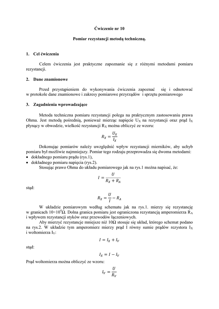 Ćwiczenie nr 10 Pomiar rezystancji metodą techniczną. 1. Cel