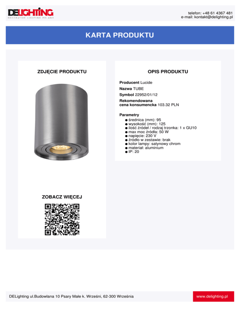 telefon: +48 61 4367 481 e-mail: [email protected] KARTA PRODUKTU ZDJĘCIE PRODUKTU OPIS PRODUKTU Producent Lucide Nazwa TUBE Symbol 22952/01/12 Rekomendowana cena konsumencka 103.32 PLN Parametry ● średnica (mm): 95 ● wysokość (mm): 125 ● ilość źródeł / rodzaj trzonka: 1 x GU10 ● max moc źródła: 50 W ● napięcie: 230 V ● źródło w zestawie: brak ● kolor lampy: satynowy chrom ● materiał: aluminium ● IP: 20 ZOBACZ WIĘCEJ DELighting ul.Budowlana 10 Psary Małe k. Wrześni, 62-300 Września www.delighting.pl