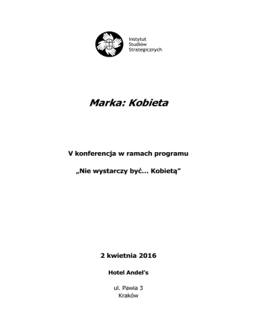 Marka: Kobieta V konferencja w ramach programu „Nie wystarczy być… Kobietą” 2 kwietnia 2016 Hotel Andel’s ul. Pawia 3 Kraków Program konferencji: 10.30 – 11.00 Rejestracja 11.00 – 11.10 Powitanie gości. Wprowadzenie 11.10 – 12.30 Panel ekspercki: „Silna kobieta – silny biznes, czyli jak być liderką dla siebie i innych?” Panelistki: Joanna Bensz, Country Manager Firmy CH2M HILL w Polsce Dorota Czekaj, Współzałożycielka i Wiceprezeska Zarządu Fundacji Przedsiębiorczości Kobiet, Współzałożycielka Klubu Inwestorek Indywidualnych Black Swan Beata Pawłowska, Dyrektor Zarządzająca Oriflame Poland Dorota Raben, Prezes Zarządu, Zarząd Morskiego Portu Gdańsk S.A. Joanna Malinowska-Parzydło, Założycielka Personal Brand Institute, Twórczyni procesu BrandYourName© Moderatorka: Anna Szymańska-Klich, Prezes Zarządu Fundacji Instytut Studiów Strategicznych 12.30 – 13.15 Dyskusja 13.15 – 13.30 Przerwa kawowa I. 13.30 – 15.00 Warsztat 1: „Sztuka dialogu. Budowanie relacji z partnerami w biznesie” Prowadzące: Joanna Bensz, Dorota Raben, II. Country Manager Firmy CH2M HILL w Polsce Prezes Zarządu, Zarząd Morskiego Portu Gdańsk S.A. 13.30 – 15.00 Warsztat 2: „Marka: Kobieta. Jak przekuć osobisty kapitał na zawodowy sukces?” Prowadząca: Ewa Krupnik, 15.00 – 15.30 PARTNER Wiceprezeska Fundacji Laboratorium Inicjatyw Społecznych Lunch PATRONAT MEDIALNY Projekt realizowany przy wsparciu finansowym Województwa Małopolskiego
