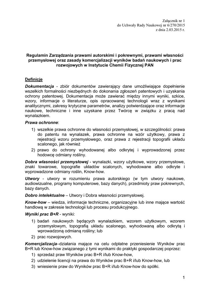 Załącznik nr 1 do Uchwały Rady Naukowej nr 6/270/2015 z dnia 2.03.2015 r. Regulamin Zarządzania prawami autorskimi i pokrewnymi, prawami własności przemysłowej oraz zasady komercjalizacji wyników badań naukowych i prac rozwojowych w Instytucie Chemii Fizycznej PAN Definicje Dokumentacja - zbiór dokumentów zawierający dane umożliwiające dopełnienie wszelkich formalności niezbędnych do dokonania zgłoszeń patentowych i uzyskania ochrony patentowej. Dokumentacja może zawierać między innymi wyniki, szkice, wzory, informacje o literaturze, opis opracowanej technologii wraz z wynikami analitycznymi, zakresy krytyczne parametrów, analizy potwierdzające oraz informacje naukowe, techniczne i inne uzyskane przez Twórcę w związku z pracą nad wynalazkiem. Prawa ochronne: 1) wszelkie prawa ochronne do własności przemysłowej, w szczególności: prawa do patentu na wynalazek, prawa ochronne na wzór użytkowy, prawa z rejestracji wzoru przemysłowego, oraz prawa z rejestracji topografii układu scalonego, jak również 2) prawo do ochrony wyhodowanej albo odkrytej i wyprowadzonej przez hodowcę odmiany rośliny. Dobra własności przemysłowej - wynalazki, wzory użytkowe, wzory przemysłowe, znaki towarowe, topografie układów scalonych, wyhodowane albo odkryte i wyprowadzone odmiany roślin, Know-how. Utwory - utwory w rozumieniu prawa autorskiego (w tym utwory naukowe, audiowizualne, programy komputerowe, bazy danych), przedmioty praw pokrewnych, bazy danych. Dobro intelektualne – Utwory i Dobra własności przemysłowej. Know-how – wiedza, informacje techniczne, organizacyjne lub inne mające wartość handlową w zakresie technologii lub procesu produkcyjnego. Wyniki prac B+R - wyniki: 1) badań naukowych będących wynalazkiem, wzorem użytkowym, wzorem przemysłowym, topografią układu scalonego, wyhodowaną albo odkrytą i wprowadzoną odmianą rośliny; lub 2) prac rozwojowych. Komercjalizacja–działania mające na celu odpłatne przeniesienie Wyników prac B+R lub Know-how związanego z tymi wynikami do praktyki gospodarczej poprzez: 1) sprzedaż praw Wyników prac B+R i/lub Know-how, 2) udzielenie licencji na prawa do Wyników prac B+R i/lub Know-how, lub 3) wniesienie praw do Wyników prac B+R i/lub Know-how do spółki. 1 Decyzja o ochronie - decyzja Instytutu o objęciu Dobra intelektualnego ochroną prawną lub rezygnacji z takiej ochrony. Decyzja o Komercjalizacji – decyzja podejmowana przez dyrektora Instytutu lub osobę upoważnioną, dotycząca podjęcia Komercjalizacji Wyników prac B+R i/lub związanego z nimi Know-how przez Instytut (pozytywna Decyzja o komercjalizacji) lub niekomercjalizowaniu tych wyników lub Know-how (negatywna Decyzja o komercjalizacji). Spółka celowa – spółka prawa handlowego utworzona przez Instytut samodzielnie bądź we współpracy z innym podmiotem w celu przekazania części bądź całości zadań Instytutu w zakresie Komercjalizacji oraz zarządzania Prawami własności intelektualnej. Samodzielna komercjalizacja – Komercjalizacja dokonywana przez Instytut w efekcie podjęcia pozytywnej Decyzji o Komercjalizacji. Samodzielna komercjalizacja bezpośrednia – Komercjalizacja dokonywana przez Instytut w efekcie podjęcia pozytywnej Decyzji o Komercjalizacji, bez udziału Spółki celowej. Samodzielna komercjalizacja pośrednia – Komercjalizacja dokonywana przez Instytut w efekcie podjęcia pozytywnej Decyzji o Komercjalizacji z udziałem Spółki celowej. Komercjalizacja przez Twórcę – Komercjalizacja dokonywana przez Twórcę w efekcie podjęcia negatywnej Decyzji o Komercjalizacji. Prawa własności przemysłowej – prawa do wynalazku, wzoru użytkowego, wzoru przemysłowego, topografii układu scalonego, wyhodowanych albo odkrytych i wyprowadzonych odmian roślin. Prawa własności intelektualnej – prawa własności przemysłowej, autorskie prawa majątkowe i prawa pokrewne i prawa do Know-how. Spółka spin-off – spółka prawa handlowego utworzona przez Instytut lub z udziałem Instytutu w celu wdrożenia w jej działalności Wyników prac B+R i/lub związanego z nimi Know-how, bądź prowadzenia dalszych prac B+R na tych wynikach/Know-how w celu ich gospodarczego zastosowania. Twórca – osoba, która wytworzyła Dobro intelektualne. Instytut Chemii Fizycznej PAN (dalej: „IChF PAN” lub „Instytut”), sprzyja tworzeniu innowacyjnych rozwiązań, a w szczególności wspiera aktywność zmierzającą do tworzenia Dóbr intelektualnych w celu ich gospodarczego stosowania. W celu ochrony praw Twórców oraz zabezpieczenia interesów IChF PAN, działając w oparciu o art. 94a ustawy z dnia 30 kwietnia 2010 r. o Polskiej Akademii Nauk(Dz. U. nr 96 poz. 619 ze zm.), wprowadza się następujący regulamin: Postanowienia ogólne § 1 Podmiotowy zakres obowiązywania 1. Niniejszy Regulamin reguluje zarządzanie prawami autorskimi i prawami pokrewnymi, prawami własności przemysłowej oraz wprowadza zasady 2 komercjalizacji Wyników prac B+R oraz Know-how związanego z tymi wynikami w IChF PAN. 2. Postanowienia niniejszego regulaminu stosuje się do wszystkich pracowników IChF PAN. 3. Do doktorantów, studentów oraz innych osób nie pozostających z IChF PAN w stosunku pracy, postanowienia mają zastosowanie, o ile wynika to z odrębnych klauzul w umowach zawartych z tymi osobami lub osoby te zaakceptowały niniejszy regulamin (dalej: „Współpracownicy”). W takim przypadku postanowienia Regulaminu dotyczące pracowników mają odpowiednie zastosowanie do Współpracowników. 4. Postanowienia Regulaminu zastosowanie do współtwórców. dotyczące Twórcy mają odpowiednie § 2 Przedmiotowy zakres obowiązywania 1. Prawa do Dóbr intelektualnych przysługują IChF PAN z zastrzeżeniem ust. 2, jeżeli: 1) Dobra intelektualne, których dotyczą, powstały w trakcie realizacji prac naukowych i rozwojowych w Instytucie, w szczególności prowadzonych przez pracowników w związku z wykonywa