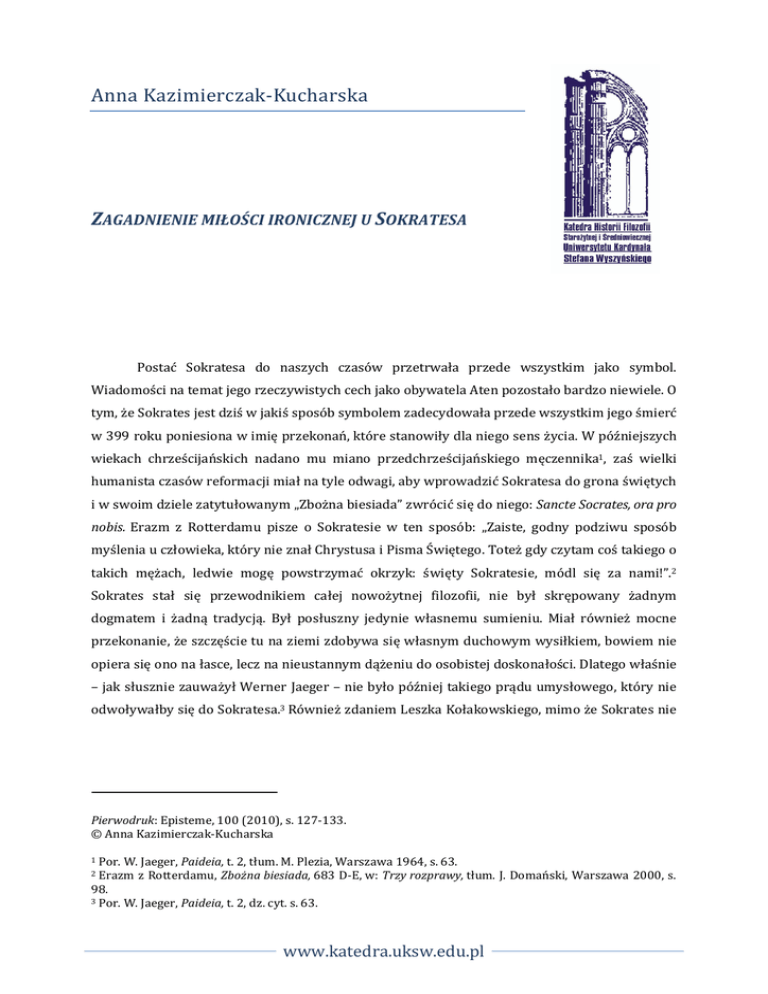Anna Kazimierczak-Kucharska ZAGADNIENIE MIŁOŚCI IRONICZNEJ U SOKRATESA Postać Sokratesa do naszych czasów przetrwała przede wszystkim jako symbol. Wiadomości na temat jego rzeczywistych cech jako obywatela Aten pozostało bardzo niewiele. O tym, że Sokrates jest dziś w jakiś sposób symbolem zadecydowała przede wszystkim jego śmierć w 399 roku poniesiona w imię przekonań, które stanowiły dla niego sens życia. W późniejszych wiekach chrześcijańskich nadano mu miano przedchrześcijańskiego męczennika1, zaś wielki humanista czasów reformacji miał na tyle odwagi, aby wprowadzić Sokratesa do grona świętych i w swoim dziele zatytułowanym „Zbożna biesiada” zwrócić się do niego: Sancte Socrates, ora pro nobis. Erazm z Rotterdamu pisze o Sokratesie w ten sposób: „Zaiste, godny podziwu sposób myślenia u człowieka, który nie znał Chrystusa i Pisma Świętego. Toteż gdy czytam coś takiego o takich mężach, ledwie mogę powstrzymać okrzyk: święty Sokratesie, módl się za nami!”.2 Sokrates stał się przewodnikiem całej nowożytnej filozofii, nie był skrępowany żadnym dogmatem i żadną tradycją. Był posłuszny jedynie własnemu sumieniu. Miał również mocne przekonanie, że szczęście tu na ziemi zdobywa się własnym duchowym wysiłkiem, bowiem nie opiera się ono na łasce, lecz na nieustannym dążeniu do osobistej doskonałości. Dlatego właśnie – jak słusznie zauważył Werner Jaeger – nie było później takiego prądu umysłowego, który nie odwoływałby się do Sokratesa.3 Również zdaniem Leszka Kołakowskiego, mimo że Sokrates nie Pierwodruk: Episteme, 100 (2010), s. 127-133. © Anna Kazimierczak-Kucharska 1 Por. W. Jaeger, Paideia, t. 2, tłum. M. Plezia, Warszawa 1964, s. 63. Erazm z Rotterdamu, Zbożna biesiada, 683 D-E, w: Trzy rozprawy, tłum. J. Domański, Warszawa 2000, s. 98. 3 Por. W. Jaeger, Paideia, t. 2, dz. cyt. s. 63. 2 www.katedra.uksw.edu.pl 2 pozostawił po sobie żadnych pism, to jego wpływ na filozofię grecką był ogromny, a nie bez echa odbiło się to również na moralności i kulturze europejskiej.4 Zagadnienie ironicznej miłości u Sokratesa jest dla nas istotne przede wszystkim z tego powodu, że Sokrates jest pierwszym filozofem, który w zupełnie nowym świetle przedstawia problematykę miłości. Wyraźnie widać to w Uczcie Platona, gdzie nietrudno dostrzec różnice pomiędzy wypowiedziami poprzedników Sokratesa podczas biesiady, a wypowiedzią samego mistrza filozofii. Zanim jednak przejdziemy do rozpatrzenia przedstawionego problemu, należy zwrócić uwagę na greckie słowo „atopotatos”. Za jego pomocą opisywany jest w dialogach Platona charakter Sokratesa. Na przykład w Teajtecie (149 A) czytamy: „Ludzie o mnie mówią, żem skończone dziwadło i ludzi w kłopot wprowadzam”. Etymologicznie słowo „atopotatos” oznacza „nie na miejscu”, zatem – dziwny, absurdalny, nie dający się zaklasyfikować, zbijający z tropu.5 Alcybiades w Uczcie, gdy wyraża swoją słynną pochwałę Sokratesa, kładzie nacisk właśnie na tę osobliwość. Twierdzi bowiem, że Sokratesa nie można porównać z żadnym człowiekiem, jedynie z sylenami i satyrami. Tak Platon przedstawia słowa Alcybiadesa: „Można by na pochwałę Sokratesa powiedzieć wiele jeszcze innych, niebywałych rzeczy. Ale jeżeli chodzi o te lub inne czyny, łatwo by można podobne znaleźć i u innego człowieka, a u niego to jest najdziwniejsze, że on nie jest podobny do nikogo z ludzi, ani dawnych, ani dzisiejszych. Bo tak jak Achilles, mógłby ktoś powiedzieć, był i Brazidas, i inni, a Perykles znowu był jak Nestor i Antenor, a są i inni także; każdego można by do kogoś przyrównać. Ale takiego oryginała, jak ten człowiek i jego mowy, ze światłem nikt nie znajdzie ani pośród współczesnych, ani dawnych postaci, chyba że go kto zechce porównać tak jak ja: do nikogo z ludzi, tylko do sylenów i satyrów; jego i jego słowa tak samo.”6 Takie spojrzenie kojarzy się niewątpliwie z ideałem mędrca, który próbowały wypracować wszystkie szkoły filozoficzne w starożytności i którego wizerunek byłby jak najbardziej zbliżony do ludzkiej natury. Nie chodzi tu jednak o żadnego konkretnego filozofa, lecz o pewien ideał, który byłby ważnym wzorcem nawet wówczas, gdyby nikt go nie urzeczywistnił. W wyobrażeniach wszystkich szkół filozoficznych mędrzec posiadał najwyższą sumę dóbr, jakie tylko mogą być dostępne człowiekowi. Musiał on zatem być absolutnie dobry 4 Por. L. Kołakowski, O co nas pytają wielcy filozofowie, Kraków 2005, s. 9. Por. P. Hadot, Filozofia jako ćwiczenie duchowe, tłum. P. Domański, Warszawa 2003, s. 118. 6 Platon, Uczta, 221 C-D. 5 www.katedra.uksw.edu.pl 3 oraz posiadać pełną wiedzę o tym, co każda ze szkół uważała za istotę rzeczywistości. Mędrzec to swego rodzaju pośrednik pomiędzy bogami a ludźmi.7 Jedynym mędrcem powszechnie uznanym przez wszystkie szkoły filozoficzne w starożytności był Sokrates – ten, który sam nie wiedział, że jest mędrcem. Posiadał on bowiem wszystkie cechy, jakie stanowią podstawę spokoju duszy i wolności od zmartwień – stałość duszy, brak potrzeb, obojętność na rzeczy, za którymi inni niestrudzenie podążają.8 Według Uczty Platona istnieją różne kategorie ludzi, jednak sam Sokrates nie zalicza się do żadnej z nich, do żadnej kategorii bowiem nie da się go przyporządkować. Sokrates jest Jednostką, Jedynym.9 Pomimo owego nieporównywalnego charakteru Sokratesa, można zaobserwować, że przybiera on pewne mityczne rysy Erosa. W wypowiedziach Sokratesa odnajdujemy ironię miłości, która jest ściśle związana z ironią dialogu. Przypomnijmy, że Sokratejska ironia polega przede wszystkim na celowym wprowadzeniu rozmówcy w błąd. Nie stanowiła ona celu samego w sobie, lecz służyła zwalczaniu próżności ludzkiej. Sokrates stosując tę metodę gra