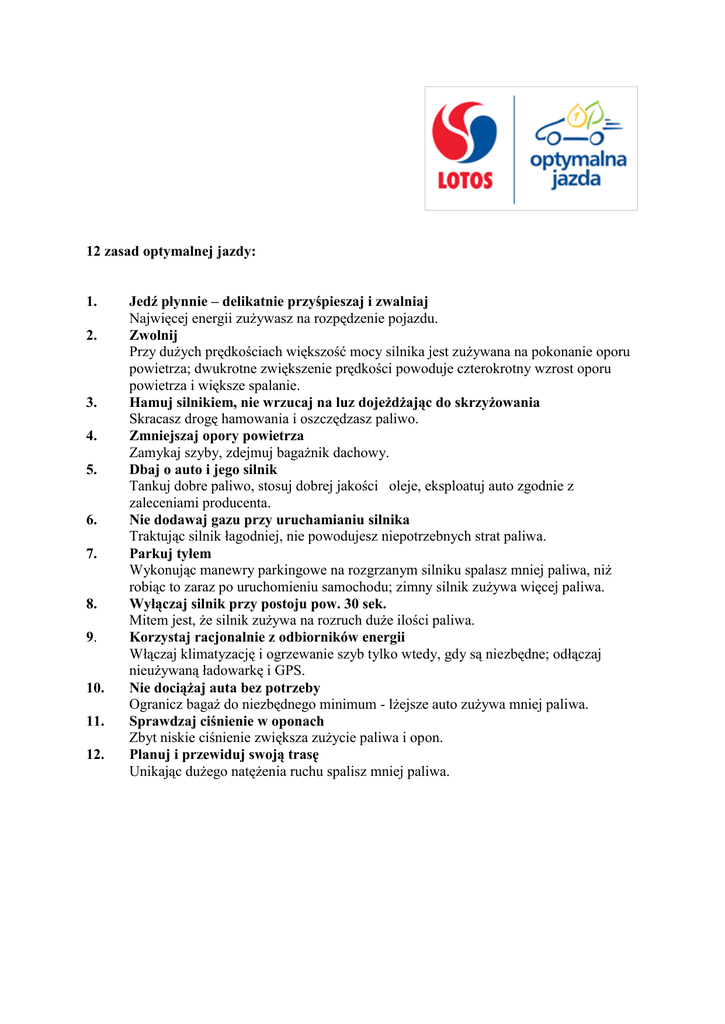 12 zasad optymalnej jazdy: 1. 2. 3. 4. 5. 6. 7. 8. 9. 10. 11. 12. Jedź płynnie – delikatnie przyśpieszaj i zwalniaj Najwięcej energii zużywasz na rozpędzenie pojazdu. Zwolnij Przy dużych prędkościach większość mocy silnika jest zużywana na pokonanie oporu powietrza; dwukrotne zwiększenie prędkości powoduje czterokrotny wzrost oporu powietrza i większe spalanie. Hamuj silnikiem, nie wrzucaj na luz dojeżdżając do skrzyżowania Skracasz drogę hamowania i oszczędzasz paliwo. Zmniejszaj opory powietrza Zamykaj szyby, zdejmuj bagażnik dachowy. Dbaj o auto i jego silnik Tankuj dobre paliwo, stosuj dobrej jakości oleje, eksploatuj auto zgodnie z zaleceniami producenta. Nie dodawaj gazu przy uruchamianiu silnika Traktując silnik łagodniej, nie powodujesz niepotrzebnych strat paliwa. Parkuj tyłem Wykonując manewry parkingowe na rozgrzanym silniku spalasz mniej paliwa, niż robiąc to zaraz po uruchomieniu samochodu; zimny silnik zużywa więcej paliwa. Wyłączaj silnik przy postoju pow. 30 sek. Mitem jest, że silnik zużywa na rozruch duże ilości paliwa. Korzystaj racjonalnie z odbiorników energii Włączaj klimatyzację i ogrzewanie szyb tylko wtedy, gdy są niezbędne; odłączaj nieużywaną ładowarkę i GPS. Nie dociążaj auta bez potrzeby Ogranicz bagaż do niezbędnego minimum - lżejsze auto zużywa mniej paliwa. Sprawdzaj ciśnienie w oponach Zbyt niskie ciśnienie zwiększa zużycie paliwa i opon. Planuj i przewiduj swoją trasę Unikając dużego natężenia ruchu spalisz mniej paliwa.