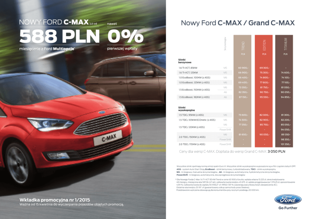 TREND EDITION TITANIUM Skrzynia biegów 588 PLN Nowy Ford C-MAX / Grand C-MAX PLN PLN PLN M5 60 900,- 69 300,- - 1.6 Ti-VCT, 125KM M5 66 900,- 75 300,- 74 600,- 1.0 EcoBoost, 100KM (z ASS) M6 66 400,- 74 800,- 74 100,- 1.0 EcoBoost, 125KM (z ASS) M6 69 400,- 77 800,- 77 100,- Silniki benzynowe 1.6 Ti-VCT, 85KM M6 73 350,- 81 750,- 81 050,- A6 82 350,- 90 750,- 90 050,- A6 87 150,- 95 550,- 94 850,- 1.5 TDCi, 95KM (z ASS) M6 73 600,- 82 000,- 81 300,- 1.5 TDCi, 105KM ECOnetic (z ASS) M6 74 500,- 82 900,- 82 200,- M6 77 350,- 85 750,- 85 050,- PowerShift - - 94 050,- 1.5 EcoBoost, 150KM (z ASS) 1.5 EcoBoost, 182KM (z ASS) Silniki wysokoprężne 1.5 TDCi, 120KM (z ASS) 2.0 TDCi, 150KM (z ASS) 2.0 TDCi, 170KM (z ASS) M6 81 650,- 90 050,- 89 350- PowerShift - - 98 350,- PowerShift - - 101 350,- Ceny dla wersji C-MAX. Dopłata do wersji Grand C-MAX: 3 050 PLN Wszystkie silniki spełniają normę emisji spalin Euro VI. Wszystkie silniki wysokoprężne wyposażone są w filtr cząstek stałych DPF. ASS - system Auto Start Stop, EcoBoost - silnik benzynowy, turbodoładowany, TDCi - silnik wysokoprężny M6 - 6-biegowa, manualna skrzynia biegów, , A6 - 6-biegowa, automatyczna, hydrokinetyczna skrzynia biegów, PowerShift - 6-biegowa, automatyczna, dwusprzęgłowa skrzynia biegów * Dla Nowego Forda C-Max 1.6 Ti-VCT 85 KM Trend w cenie 60 900 zł brutto, wpłata własna 15 225 zł, okres kredytowania 48 miesięcy, miesięczna rata 587,36 (47 rat), całkowita kwota kredytu 45 675 zł, opłata przygotowawcza 1 370,25 zł, oprocentowanie 4,99 %. Całkowita kwota do zapłaty 55 998,27 zł i RRSO 7,81 % (zawierają szacunkowy koszt ubezpieczenia AC). Ostatnia rata kredytu 25 197 zł (gwarantowany odkup samochodu przez Dealera). Przedstawione wyliczenia obowiązują dla konsumentów przy rocznym przebiegu 20 000 km. Wkładka promocyjna nr 1/2015 Ważna od 15 kwietnia do wyczerpania pojazdów objętych promocją. Nowy Ford C-MAX / Grand C-MAX Wyposażenie standardowe bez kompromisów. C-MAX / Grand C-MAX Trend Nadwozie •16” stalowe obręcze kół z kołpakami o wzorze 14 ramienym •Elektroniczny układ stabilizacji toru jazdy (ESC) •Inteligentny system bezpieczeństwa (IPS) •Układ ułatwiający ruszanie na wzniesieniach (HSA) •Górna przednia krata wlotu powietrza z chromowanym obramowaniem •Elektrycznie podgrzewane i sterowane lusterka boczne w kolorze nadwozia ze zintegrowanymi kierunkowskazami •Klamki drzwi lakierowane w kolorze nadwozia •Tylne drzwi przesuwane (Tylko Grand C-MAX) •Ford Easy Fuel - system bezkorkowego wlewu paliwa Wnętrze •Klimatyzacja •Radioodtwarzacz CD/MP3 z Ford Sync i AppLink zawiera: kolorowy wyświetlacz 4.2”, zestaw głośnomówiący z Bluetooth® i rozbudowaną funkcją sterowania głosem (bez języka polskiego) oraz funkcją wzywania pomocy, 6 głośników, zdalne sterowanie na kierownicy, gniazda: AUX-IN i USB/iPod® (ICFAC) Elektrycznie sterowane szyby przednich drzwi • •6 poduszek powietrznych •Kierownica oraz dźwignia zmiany biegów wykończone skórą •Kierownica z regulacją odległości i kąta pochylenia •Fotel kierowcy z ręczną regulacją w 4. kierunkach i regulacją podparcia odcinka lędźwiowego •Punkty mocowania fotelika dziecięcego ISOFIX •Dodatkowe gniazdko 12V w bagażniku •Ford MyKey® C-MAX / Grand C-MAX Edition Dodatkowe elementy wyposażenia w porównaniu do wersji Trend Nadwozie •16” obręcze kół ze stopów lekkich, •Tempomat z regulowanym ogranicznikiem •Przednie światła przeciwmgielne •Lusterka boczne składane elektrycznie •Elektrycznie sterowane szyby wzór 5x2-ramienny (D2XBT) Wnętrze •System nawigacji satelitarnej z Ford SYNC 2 zawiera: kolorowy wyświetlacz dotykowy 8”, TMC, zestaw głośnomówiący z Bluetooth®, 6 głośników, gniazda: 2xUSB, SD, AUX-IN, zdalne sterowanie na kierownicy, mapy Europy z widokiem 3D (ICFAL) prędkości (ASLD) przednich i tylnych drzwi •Konsola centralna rozbudowana z podłokietnikiem •Czujniki parkowania z tyłu •Rolety przeciwsłoneczne zintegrowane w tylnych drzwiach C-MAX / Grand C-MAX Titanium Dodatkowe elementy wyposażenia w porównaniu do wersji Trend Nadwozie •16” obręcze kół ze stopów lekkich, wzór 10-ramienny (nie dotyczy wersji ECOnetic)(D2XDC) •Przednie światła przeciwmgielne z chromowanym wykończeniem •Górna krata wlotu powietrza w kolorze czarnym, z listwami z chromowanym wykończeniem oraz chromowanym obramowaniem Wnętrze •Klimatyzacja dwustrefowa z automatyczną regulacją temeratury (DEATC) •Radioodtwarzacz CD/MP3 z Ford SYNC 2 zawiera: kolorowy wyświetlacz dotykowy 8”, zestaw głośnomówiący z Bluetooth®, 6 głośników, gniazda: 2xUSB, SD, AUX-IN, zdalne sterowanie na kierownicy (ICFAF) Przycisk rozrusznika Ford Power •Listwa wzdłuż dolnej linii szyb bocznych w kolorze • •Konsola centralna Premium z przesuwanym •Reflektory automatyczne •Światła do jazdy dzienej w technologii LED •Wycieraczki przedniej szyby sterowane •Fotel pasażera z ręczną regulacją podparcia odcinka polerowanego aluminium automatycznie z czujnikiem deszczu podłokietnikiem •Fotel pasażera z przodu z ręczną regulacją położenia w 4. kierunkach lędźwiowego •Samoczynnie ściemniające się lusterko wsteczne •Lampki sufitowe LED ze ściemniaczem i opóźnionym wyłączaniem •Nakładki na progi z przodu z tworzywa sztucznego z logo ‚Ford’