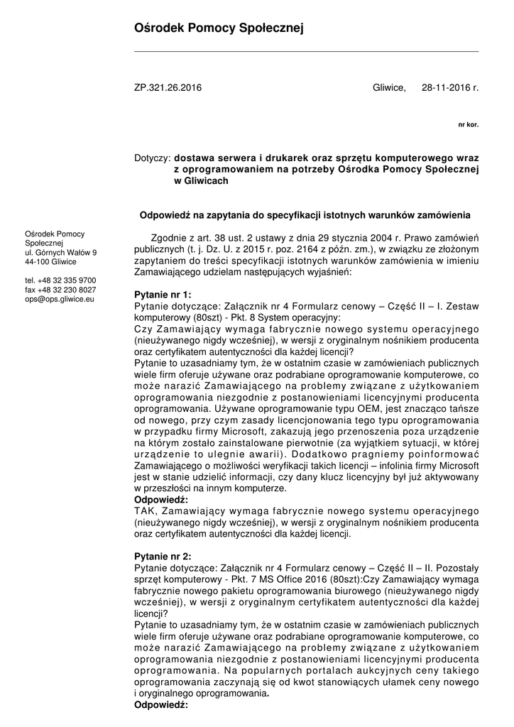 Ośrodek Pomocy Społecznej ZP.321.26.2016 Gliwice, 28-11-2016 r. nr kor. Dotyczy: dostawa serwera i drukarek oraz sprzętu komputerowego wraz z oprogramowaniem na potrzeby Ośrodka Pomocy Społecznej w Gliwicach Odpowiedź na zapytania do specyfikacji istotnych warunków zamówienia Ośrodek Pomocy Społecznej ul. Górnych Wałów 9 44-100 Gliwice tel. +48 32 335 9700 fax +48 32 230 8027 [email protected] Zgodnie z art. 38 ust. 2 ustawy z dnia 29 stycznia 2004 r. Prawo zamówień publicznych (t. j. Dz. U. z 2015 r. poz. 2164 z późn. zm.), w związku ze złożonym zapytaniem do treści specyfikacji istotnych warunków zamówienia w imieniu Zamawiającego udzielam następujących wyjaśnień: Pytanie nr 1: Pytanie dotyczące: Załącznik nr 4 Formularz cenowy – Część II – I. Zestaw komputerowy (80szt) - Pkt. 8 System operacyjny: Czy Zamawiający wymaga fabrycznie nowego systemu operacyjnego (nieużywanego nigdy wcześniej), w wersji z oryginalnym nośnikiem producenta oraz certyfikatem autentyczności dla każdej licencji? Pytanie to uzasadniamy tym, że w ostatnim czasie w zamówieniach publicznych wiele firm oferuje używane oraz podrabiane oprogramowanie komputerowe, co może narazić Zamawiającego na problemy związane z użytkowaniem oprogramowania niezgodnie z postanowieniami licencyjnymi producenta oprogramowania. Używane oprogramowanie typu OEM, jest znacząco tańsze od nowego, przy czym zasady licencjonowania tego typu oprogramowania w przypadku firmy Microsoft, zakazują jego przenoszenia poza urządzenie na którym zostało zainstalowane pierwotnie (za wyjątkiem sytuacji, w której urządzenie to ulegnie awarii). Dodatkowo pragniemy poinformować Zamawiającego o możliwości weryfikacji takich licencji – infolinia firmy Microsoft jest w stanie udzielić informacji, czy dany klucz licencyjny był już aktywowany w przeszłości na innym komputerze. Odpowiedź: TAK, Zamawiający wymaga fabrycznie nowego systemu operacyjnego (nieużywanego nigdy wcześniej), w wersji z oryginalnym nośnikiem producenta oraz certyfikatem autentyczności dla każdej licencji. Pytanie nr 2: Pytanie dotyczące: Załącznik nr 4 Formularz cenowy – Część II – II. Pozostały sprzęt komputerowy - Pkt. 7 MS Office 2016 (80szt):Czy Zamawiający wymaga fabrycznie nowego pakietu oprogramowania biurowego (nieużywanego nigdy wcześniej), w wersji z oryginalnym certyfikatem autentyczności dla każdej licencji? Pytanie to uzasadniamy tym, że w ostatnim czasie w zamówieniach publicznych wiele firm oferuje używane oraz podrabiane oprogramowanie komputerowe, co może narazić Zamawiającego na problemy związane z użytkowaniem oprogramowania niezgodnie z postanowieniami licencyjnymi producenta oprogramowania. Na popularnych portalach aukcyjnych ceny takiego oprogramowania zaczynają się od kwot stanowiących ułamek ceny nowego i oryginalnego oprogramowania. Odpowiedź: TAK, Zamawiający wymaga fabrycznie nowego pakietu oprogramowania biurowego (nieużywanego nigdy wcześniej), w wersji z oryginalnym certyfikatem autentyczności dla każdej licencji. Pytanie nr 3: Pytanie dotyczące: Załącznik nr 4 Formularz cenowy – Część II – II. Pozostały sprzęt komputerowy - Pkt. 7 MS Office 2016 (80szt): Czy Zamawiający, w celu zabezpieczenia swojego interesu (zarówno finansowego, jak i prawnego) skorzysta z przysługującego mu prawa do weryfikacji dostarczonego sprzętu na etapie dostawy pod kątem legalności oprogramowania? Pragniemy zauważyć, że według ostrożnych szacunków firmy Microsoft ok. połowa oprogramowania obecnie sprzedawanego w Polsce w sektorze zamówień publicznych może być podrabiana, szczególnie zaś problem ten dotyczy oprogramowania Microsoft Office (aby zobaczyć jak bardzo poważny jest to problem, wystarczy wpisać w popularnym serwisie aukcyjnym frazę: „office 2016” i zobaczyć jak duża jest rozpiętość cenowa oferowanego tam rzekomo oryginalnego oprogramowania). Dodatkowo chcemy poinformować Zamawiającego, że taka weryfikacja legalności oprogramowania na etapie dostawy jest całkowicie bezpłatna oraz, że nasza firma może udostępnić Zamawiającemu bezpośredni kontakt z osobą zajmującą się problemem podrabianego oprogramowania ze strony Microsoft Polska, celem przeprowadzenia takiej weryfikacji na etapie dostawy. Odpowiedź: TAK, Zamawiający, w celu zabezpieczenia swojego interesu (zarówno finansowego, jak i prawnego) może skorzystać z przysługującego mu prawa do weryfikacji dostarczonego sprzętu na etapie dostawy pod kątem legalności oprogramowania. Pytanie nr 4: Pytanie dotyczące: Załącznik nr 4 Formularz cenowy – Część II – I. Zestaw komputerowy (80szt) - Pkt. 8 System operacyjny, Część II – II. Pozostały sprzęt komputerowy - Pkt. 7 MS Office 2016 (80szt): Czy Zamawiający wymaga, aby dostarczony pakiet oprogramowania biurowego oraz oprogramowanie systemowe uprawniało do pomocy technicznej producenta oprogramowania na zasadach EULA? Odpowiedź: TAK, Zamawiający wymaga, aby dostarczony pakiet oprogramowania biurowego oraz oprogramowanie systemowe uprawniało do pomocy technicznej producenta oprogramowania na zasadach EULA. Pytanie nr 5: Pytanie dotyczące: Załącznik nr 4 Formularz cenowy – Część II – I. Zestaw komputerowy (80szt) - Pkt. 8 System operacyjny, Część II – II. Pozostały sprzęt komputerowy - Pkt. 7 MS Office 2016 (80szt): Czy Zamawiający wymaga, aby dostarczony pakiet oprogramowania biurowego oraz oprogramowanie systemowe zostało objęte gwarancją producenta oprogramowania na zasadach EULA? Odpowiedź: TAK, Zamawiający wymaga, aby dostarczony pakiet oprogramowania biurowego oraz oprogramowanie systemowe zostało objęte gwarancją producenta oprogramowania na zasadach EULA. Pytanie nr 6: Pytanie dotyczące: Załącznik nr 4 Formularz cenowy – Część II – I. Zestaw komputerowy (80szt) - Pkt. 8 System operacyjny, Część II – II. Pozostały sprzęt komputerowy -