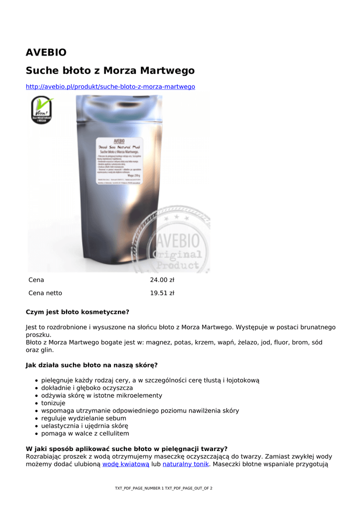 AVEBIO Suche błoto z Morza Martwego http://avebio.pl/produkt/suche-bloto-z-morza-martwego Cena 24.00 zł Cena netto 19.51 zł Czym jest błoto kosmetyczne? Jest to rozdrobnione i wysuszone na słońcu błoto z Morza Martwego. Występuje w postaci brunatnego proszku. Błoto z Morza Martwego bogate jest w: magnez, potas, krzem, wapń, żelazo, jod, fluor, brom, sód oraz glin. Jak działa suche błoto na naszą skórę? pielęgnuje każdy rodzaj cery, a w szczególności cerę tłustą i łojotokową dokładnie i głęboko oczyszcza odżywia skórę w istotne mikroelementy tonizuje wspomaga utrzymanie odpowiedniego poziomu nawilżenia skóry reguluje wydzielanie sebum uelastycznia i ujędrnia skórę pomaga w walce z cellulitem W jaki sposób aplikować suche błoto w pielęgnacji twarzy? Rozrabiając proszek z wodą otrzymujemy maseczkę oczyszczającą do twarzy. Zamiast zwykłej wody możemy dodać ulubioną wodę kwiatową lub naturalny tonik. Maseczki błotne wspaniale przygotują TXT_PDF_PAGE_NUMBER 1 TXT_PDF_PAGE_OUT_OF 2 Twoją skórę na wyjątkowy wieczór. Błoto z Morza Martwego świetnie pochłania nadmiar sebum nie wysuszając skóry i nie powodując podrażnień. Delikatnie napina i matuje skórę. Uwaga! Błoto zmywamy przed całkowitym zaschnięciem. Czy błoto można stosować w pielęgnacji ciała? Tak. Suszone błoto możemy stosować w formie okładów i masek miejscowo jak i na całe ciało. Po ciepłym prysznicu możemy taką papkę nałożyć na całe ciało w celu odżywienia i ujędrnienia skóry. Błoto można mieszać z naturalnymi olejami. W przypadku roztępów lub cellulitu do błota można dodać olej makadamia. W przypadku skóry łuszczycowej do błota możemy dodać olej z awokado lub olej perilla. Czy błoto można wykorzystać w maskach do włosów? Maski z błota świetnie sprawdzają się w walce z łojotokiem skóry głowy i łupieżem. Sól i błoto z Morza Martwego można spotkać w szamponach i odżywkach do włosów. Co wchodzi w skład błota z Morza Martwego? Składniki/INCI: Maris Limus, czyli 100% naturalne, suche błoto z Morza Martwego. Produkt nie zawiera konserwantów, polepszaczy i wypełniaczy. Dlaczego produkty z Morza Martwego są wyjątkowe? Morze Martwe jest najpopularniejszym uzdrowiskiem na świecie. Ściągają tutaj kuracjusze z całego świata. Ciepłe i gorące okłady i kąpiele wspomagają leczenie reumatyzmu i artretyzmu. Błoto poprawia ukrwienie skóry poprzez pobudzenie krążenia. Naukowcy podkreślaja, iż bardzo wysokie stężenie minerałów wykazuje właściwości lecznicze w przypadku łuszczycy i zapalenia skóry. W czasie kąpieli w solance czy stosowania okładów solnych i błotnych niektóre pierwiastki są wchłaniane przez pory skóry do krwi (np. magnez). W czasie kąpieli w solach z Morza Martwego organizm w naturalny sposób może uzupełniać ewentualne niedobory magnezu. W jakiej pojemności dostępne jest błoto? Suche błoto dostępne jest w opakowaniu saszetkowym o pojemności 250 gram. TXT_PDF_PAGE_NUMBER 2 TXT_PDF_PAGE_OUT_OF 2