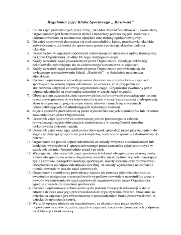 Regulamin zajęć Klubu Sportowego „ Rusiń-ski” 1. Celem zajęć prowadzonych przez Frmę „Ski-Max Michał Śmiałkowski”, zwana dalej Organizatorem jest kształtowanie dzieci i młodzieży poprzez zajęcia ruchowe z ukierunkowaniem na narciarstwo alpejskie oraz trening ogólnorozwojowy. 2. Do zajęć sportowych dopuszcza się tych zawodników którzy przedstawią lekarskie zaświadczenie o zdolności do uprawiania sportu i posiadają aktualne badania lekarskie. 3. Uczestnictwo w zajęciach sportowych zobowiązuje do uiszczenia opłaty treningowej na konto Organizatora do dnia 10- tego każdego miesiąca. 4. Każdy uczestnik zajęć prowadzonych przez Organizatora składając deklarację członkowską zobowiązuje się do całorocznego uczestnictwa w zajęciach. 5. Każdy uczestnik zajęć prowadzonych przez Organizatora zobowiązuje się do wyłącznego reprezentowania Sekcji „Rusiń-ski” w dziedzinie narciarstwa alpejskiego. 6. Rodzice i opiekunowie zezwalają swoim dzieciom na uczestnictwo w zajęciach sportowych na własną odpowiedzialność, co oznacza, że w przypadku nie stwierdzenia uchybień ze strony organizatora zajęć, Organizator zwolniony jest z odpowiedzialności za ewentualne zaistniałe w czasie zajęć wypadki. 7. Obowiązkiem uczestnika zajęć sportowych jest informowanie prowadzącego trening przed przystąpieniem do wykonywania ćwiczeń o swej każdorazowej niedyspozycji, złym samopoczuciu, pogorszonym stanie zdrowia i innych ograniczeniach uniemożliwiających lub utrudniających wykonanie ćwiczeń. 8. Zajęcia sportowe prowadzone są przez wykwalifikowanych instruktorów lub trenerów zatwierdzonych przez Organizatora. 9. Uczestnik zajęć sportowych zobowiązany jest do przestrzegania zaleceń prowadzącego zajęcia dotyczących zachowania, a w szczególności sposobu wykonywania ćwiczeń i zadań. 10. Uczestnik zajęć oraz jego opiekun ma obowiązek sprawdzić przed przystąpieniem do zajęć czy dany sprzęt sportowy jest kompletny, technicznie sprawny i dostosowany do potrzeb. 11. Organizator nie ponosi odpowiedzialności za szkody związane z uszkodzeniem lub kradzieżą wyposażenia i sprzętu używanego przez uczestnika zajęć sportowych w czasie ich trwania i bezpośrednio przed i po nich. 12. Wymaga się , aby uczestnik zajęć sportowych dokonał ubezpieczenia własnej osoby. Zakres ubezpieczenia winien obejmować wszelkie nieszczęśliwe wypadki narażające życie i zdrowie, następstwa kontuzji sportowych, koszty leczenia oraz ratownictwa i ubezpieczenia od odpowiedzialności cywilnej za szkody wyrządzone na osobach i mieniu powstałe w trakcie zajęć sportowych. 13. Organizator i instruktorzy prowadzący zajęcia nie ponoszą odpowiedzialności za ewentualne następstwa nieszczęśliwych wypadków powstałe u uczestników zajęć z powodu wykonywania ćwiczeń sportowych organizowanych przez Organizatora zgodnie z wszelkimi zasadami sportowymi 14. Rodzice i opiekunowie zobowiązani są do podania bieżących informacji o stanie zdrowia dziecka oraz jego przeciwwskazań do wykonywania ćwiczeń. Stawianie się dziecka na zajęciach jest równoznaczne z potwierdzeniem braku przeciwwskazań u dziecka do uprawiania sportu. 15. Warunki opisane niniejszym regulaminem , są akceptowane przez rodziców i opiekunów uczniów uczestniczących w zajęciach, co potwierdzone jest ich podpisem na deklaracji członkowskiej.
