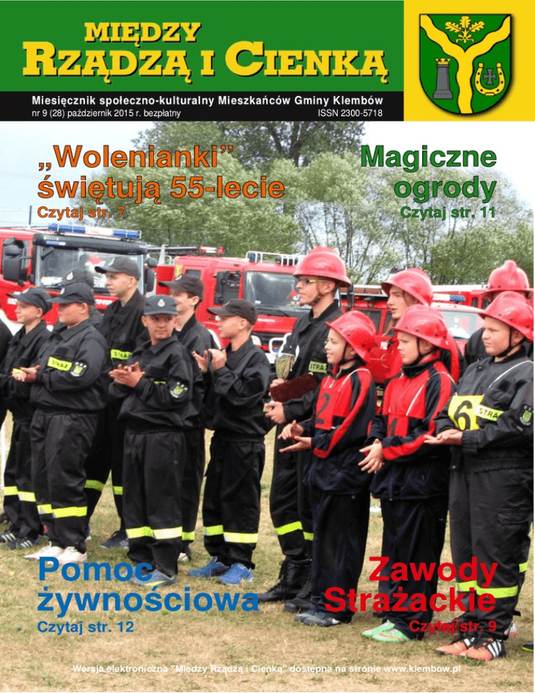Miesięcznik społeczno-kulturalny Mieszkańców Gminy Klembów nr 9 (28) październik 201 5 r. bezpłatny „Wolenianki” świętują 55-lecie Czytaj str. 7 Pomoc żywnościowa Czytaj str. 1 2 ISSN 2300-571 8 Magiczne ogrody Czytaj str. 1 1 Zawody Strażackie Czytaj str. 9 Wersja elektroniczna "Między Rządzą i Cienką" dostępna na stronie www.klembow.pl 2 MI ĘDZY RZĄDZĄ I CI ENKĄ nr 9 (28) październik 201 5 r. Zarządzenie Nr 0050.85.201 5 Wójta Gminy Klembów z dnia 22 września 201 5 r. w sprawie ustalenia wysokości stawek czynszu za najem lokali mieszkalnych stanowiących zasób mieszkaniowy gminy Klembów. Na podstawie art. 7 ust. l i art. 8 pkt l ustawy z dnia 21 czerwca 2001 r. o ochronie praw lokatorów, mieszkaniowym zasobie gminy i zmianie Kodeksu cywilnego ( Dz. U. z 201 4 r. poz. 1 50 z późn. zm.) i Roz.5.1 „Wieloletniego programu gospodarowania zasobem mieszkaniowym gminy Klembów na lata 201 3-201 7” - załącznik do uchwały Nr XXXVII.262.201 3 Rady Gminy Klembów z dnia 25 lipca 201 3 r. Wójt Gminy Klembów zarządza, co następuje: §1 Z dniem l stycznia 201 6 roku ustala się stawki czynszu za najem lokali administrowanych przez Zakład Gospodarki Komunalnej w Klembowie, stanowiących zasób mieszkaniowy gminy Klembów dla następujących kategorii mieszkań: Dla lokali socjalnych: 2,30zł. §2 Przy ustalaniu kategorii mieszkania nie uwzględnia się ulepszeń wykonanych przez najemcę we własnym zakresie i na własny koszt. §3 Wykonanie Zarządzenia powierza się Kierownikowi Zakładu Gospodarki Komunalnej w Klembowie. §4 Zarządzenie podlega ogłoszeniu na tablicy ogłoszeń w Urzędzie Gminy w Klembowie oraz podaniu do publicznej wiadomości w lokalnej prasie. WYNIKI EGZAMINÓW GIMNAZJALNYCH 201 5 R. W ZS W OSTRÓWKU „PLAN GOSPODARKI NISKOEMISYJNEJ DLA GMINY KLEMBÓW” Gmina Klembów, chcąc jak najaktywniej partycypować w nowej perspektywie wydatkowania środków z Unii Europejskiej i przygotować się do możliwości pozyskiwania środków zewnętrznych na nowe inwestycje, przystąpiła do opracowania „Planu gospodarki niskoemisyjnej dla Gminy Klembów”. Podstawowymi elementami pozwalającym opracować ten dokument są: gminna baza danych oraz inwentaryzacja źródeł emisji gazów cieplarnianych na terenie gminy Klembów. Chcąc stworzyć jak najbogatszą bazę danych oraz jak najdokładniej zinwentaryzować źródła emisji zwracamy się do Państwa z prośbą o wypełnienie ankiety w celu udzielenia informacji dotyczących m.in. powierzchni użytkowej Państwa obiektów oraz rodzaju i ilości zużywanych nośników energii i paliw. Ankietę można wypełnić elektronicznie na stronie www.klembow.pl lub w wersji papierowej w Urzędzie Gminy w Klembowie, ul. Żymirskiego 38. Wypełnienie ankiety nie jest żadnym wiążącym zobowiązaniem z Państwa strony, nam natomiast może pomóc w ustaleniu ilości emisji CO2, zużyciu energii oraz jej produkcji. Pozyskanie tych informacji od Państwa przyczyni się do lepszego rozpoznania i zdiagnozowania potrzeb naszej gminy oraz zaplanowania właściwej gospodarki niskoemisyjnej. Jeszcze raz zwracamy się do Państwa z prośbą o wypełnienie ankiety i dziękujemy za poświęcony czas. MIĘDZY RZĄDZĄ I CIENKĄ MIESIĘCZNIK SPOŁECZNOKULTURALNY MIESZKAŃCÓW GMINY KLEMBÓW BEZPŁATNY Wydawca: Gminny Ośrodek Kultury w Klembowie, ul. Strażacka 8, 05-205 Klembów ZS w Ostrówku W okresie wakacyjnym (lipiec-sierpień) na terenie naszej gminy zgłoszono policji 7 kradzieży, w tym jedną z włamaniem. Interweniowano również w sprawie rozboju, wyrzucenia śmieci (szyb, plastików i sprzętu elektronicznego) na prywatną działkę. Pod koniec sierpnia na jednej z prywatnych posesji znaleziono niewybuch z okresu II wojny światowej. Został przekazany saperom z JW Wesoła. AS Redaktor naczelna: Iwona Świebioda Redaguje: Zespół Adres redakcji: GOK, ul. Strażacka 8, 05-205 Klembów, tel. 29 741 03 50, e-mail: [email protected] Skład: Jarosław Przybysz Druk: Mdruk Sp. z o.o. Sp. k., ul. Jagiellońska 82, 03-301 Warszawa, www.m-druk.pl Redakcja nie zwraca tekstów nie zamówionych oraz zastrzega sobie prawo do ich redagowania i skracania. Redakcja nie ponosi odpowiedzialności za treść płatnych reklam. MI ĘDZY RZĄDZĄ I CI ENKĄ nr 9 (28) październik 201 5 r. 3 Dożynki Diecezjalno-Powiatowo-Gminne już za nami… Tegoroczne Diecezjalne Święto Plonów przeżywaliśmy 30 sierpnia br. w Klembowie w powiecie wołomińskim. Organizatorami uroczystości był Powiat Wołomiński, który reprezentował Starosta Kazimierz Rakowski, gmina Klembów reprezentowana przez Wójta Rafała Mathiaka oraz Kościół Parafialny p.w. Świętego Klemensa w Klembowie. Ręcznie zdobione wieńce, swojski chleb ze smalcem, lokalne wyroby: sery, kaszanka, kiełbasa, pierogi, ogórki małosolne, ciasta, nalewki, miody, zbiory z pól i sadów – to tylko niektóre atrakcje i wyroby, które można było podziwiać i smakować podczas Dożynek Diecezjalno-PowiatowoGminnych w Klembowie. Rolnicy zakończyli żniwa, plon zebrany – nadeszła pora uwieńczyć trudy wspólnym świętowaniem. Obchody rozpoczęli pp. Agnieszka i Marcin Szczapowie przedstawiając krótką historię Klembowa i prezentując korowód dożynkowy. Uroczystą mszę świętą o godz. 1 3.00 na Błoniach Klembowskich sprawował Arcybiskup Diecezji WarszawskoPraskiej Henryk Hoser, który modlił się o deszcz tak potrzebny wszystkim. Na uroczystości obecni byli przedstawiciele władz samorządowych województwa mazowieckiego, posłowie na Sejm RP, burmistrzowie, wójtowie, dyrektorzy instytucji samorządowych, sołtysi, gospodarze, rolnicy i delegacje poszczególnych gmin i powiatów. Starostami dożynek byli p. Katarzyna Wnuk z miejscowości Tuł oraz p. Arkadiusz Kielak z miejscowości Stary Kraszew. Po mszy świętej nadeszła pora na świętowanie i zabawę. Rozstrzygnięto konkurs na najpiękniejszy wieniec dożynkowy. Dokonanie wyboru nie b