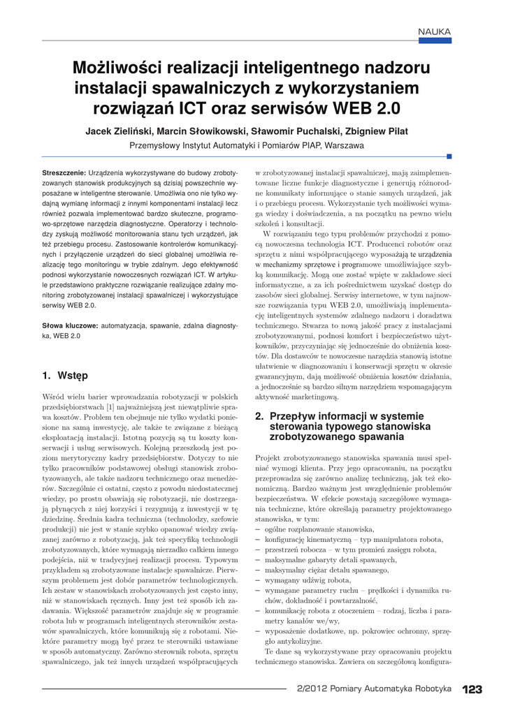 NAUKA Możliwości realizacji inteligentnego nadzoru instalacji spawalniczych z wykorzystaniem rozwiązań ICT oraz serwisów WEB 2.0 Jacek Zieliński, Marcin Słowikowski, Sławomir Puchalski, Zbigniew Pilat Przemysłowy Instytut Automatyki i Pomiarów PIAP, Warszawa Streszczenie: Urządzenia wykorzystywane do budowy zrobotyzowanych stanowisk produkcyjnych są dzisiaj powszechnie wyposażane w inteligentne sterowanie. Umożliwia ono nie tylko wydajną wymianę informacji z innymi komponentami instalacji lecz również pozwala implementować bardzo skuteczne, programowo-sprzętowe narzędzia diagnostyczne. Operatorzy i technolodzy zyskują możliwość monitorowania stanu tych urządzeń, jak też przebiegu procesu. Zastosowanie kontrolerów komunikacyjnych i przyłączenie urządzeń do sieci globalnej umożliwia realizację tego monitoringu w trybie zdalnym. Jego efektywność podnosi wykorzystanie nowoczesnych rozwiązań ICT. W artykule przedstawiono praktyczne rozwiązanie realizujące zdalny monitoring zrobotyzowanej instalacji spawalniczej i wykorzystujące serwisy WEB 2.0. Słowa kluczowe: automatyzacja, spawanie, zdalna diagnostyka, WEB 2.0 1. Wstęp Wśród wielu barier wprowadzania robotyzacji w polskich przedsiębiorstwach [1] najważniejszą jest niewątpliwie sprawa kosztów. Problem ten obejmuje nie tylko wydatki poniesione na samą inwestycję, ale także te związane z bieżącą eksploatacją instalacji. Istotną pozycją są tu koszty konserwacji i usług serwisowych. Kolejną przeszkodą jest poziom merytoryczny kadry przedsiębiorstw. Dotyczy to nie tylko pracowników podstawowej obsługi stanowisk zrobotyzowanych, ale także nadzoru technicznego oraz menedżerów. Szczególnie ci ostatni, często z powodu niedostatecznej wiedzy, po prostu obawiają się robotyzacji, nie dostrzegają płynących z niej korzyści i rezygnują z inwestycji w tę dziedzinę. Średnia kadra techniczna (technolodzy, szefowie produkcji) nie jest w stanie szybko opanować wiedzy związanej zarówno z robotyzacją, jak też specyfiką technologii zrobotyzowanych, które wymagają nierzadko całkiem innego podejścia, niż w tradycyjnej realizacji procesu. Typowym przykładem są zrobotyzowane instalacje spawalnicze. Pierwszym problemem jest dobór parametrów technologicznych. Ich zestaw w stanowiskach zrobotyzowanych jest często inny, niż w stanowiskach ręcznych. Inny jest też sposób ich zadawania. Większość parametrów znajduje się w programie robota lub w programach inteligentnych sterowników zestawów spawalniczych, które komunikują się z robotami. Niektóre parametry mogą być przez te sterowniki ustawiane w sposób automatyczny. Zarówno sterownik robota, sprzętu spawalniczego, jak też innych urządzeń współpracujących w zrobotyzowanej instalacji spawalniczej, mają zaimplementowane liczne funkcje diagnostyczne i generują różnorodne komunikaty informujące o stanie samych urządzeń, jak i o przebiegu procesu. Wykorzystanie tych możliwości wymaga wiedzy i doświadczenia, a na początku na pewno wielu szkoleń i konsultacji. W rozwiązaniu tego typu problemów przychodzi z pomocą nowoczesna technologia ICT. Producenci robotów oraz sprzętu z nimi współpracującego wyposaĪDMąWHXU]ąG]HQLD ZPHFKDQL]P\VSU]ĊWRZHLSURJUamowe umożliwiające szybką komunikację. Mogą one zostać wpięte w zakładowe sieci informatyczne, a za ich pośrednictwem uzyskać dostęp do zasobów sieci globalnej. Serwisy internetowe, w tym najnowsze rozwiązania typu WEB2.0, umożliwiają implementację inteligentnych systemów zdalnego nadzoru i doradztwa technicznego. Stwarza to nową jakość pracy z instalacjami zrobotyzowanymi, podnosi komfort i bezpieczeństwo użytkowników, przyczyniając się jednocześnie do obniżenia kosztów. Dla dostawców te nowoczesne narzędzia stanowią istotne ułatwienie w diagnozowaniu i konserwacji sprzętu w okresie gwarancyjnym, dają możliwość obniżenia kosztów działania, a jednocześnie są bardzo silnym narzędziem wspomagającym aktywność marketingową. 2. Przepływ informacji w systemie sterowania typowego stanowiska zrobotyzowanego spawania Projekt zrobotyzowanego stanowiska spawania musi spełniać wymogi klienta. Przy jego opracowaniu, na początku przeprowadza się zarówno analizę techniczną, jak też ekonomiczną. Bardzo ważnym jest uwzględnienie problemów bezpieczeństwa. W efekcie powstają szczegółowe wymagania techniczne, które określają parametry projektowanego stanowiska, w tym: − ogólne rozplanowanie stanowiska, − konfigurację kinematyczną – typ manipulatora robota, − przestrzeń robocza – w tym promień zasięgu robota, − maksymalne gabaryty detali spawanych, − maksymalny ciężar detalu spawanego, − wymagany udźwig robota, − wymagane parametry ruchu – prędkości i dynamika ruchów, dokładność i powtarzalność, − komunikację robota z otoczeniem – rodzaj, liczba i parametry kanałów we/wy, − wyposażenie dodatkowe, np. pokrowiec ochronny, sprzęgło antykolizyjne. Te dane są wykorzystywane przy opracowaniu projektu technicznego stanowiska. Zawiera on szczegółową konfigura- 2/2012 Pomiary Automatyka Robotyka 123 NAUKA kontrolery komunikacyjne, można je połączyć z zakładową siecią informatyczną. Takie rozwiązanie pozwala zorganizować monitorowanie stanowiska zrobotyzowanego z komputera na biurku technologa, szefa produkcji czy dyrektora. Możliwe jest wtedy także włączenie sterowników urządzeń technologicznych, wprost lub przez sieć zakładową, do sieci globalnej Internet. Wtedy monitoring instalacji w trybie zdalnym może być realizowany z dowolnego miejsca na świecie, również przez przedstawicieli dostawców lub producentów nadzorowanych urządzeń. Jego efektywność może Rys. 1. Typowe gniazdo spawalnicze Fig. 1. Layout of a typical welding stand cję. Typowe stanowiska spawalnicze zawierają następujące urządzenia (rys. 1): ϭͿ robota prz