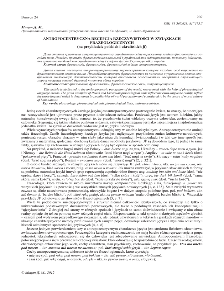207 Випуск 24 Мицан Д. М., УДК 81’367.623: 81’’373.7 Прикарпатський національний університет імені Василя Стефаника, м. Івано-Франківськ ANTROPOCENTRYCZNA RECEPCJA RZECZYWISTOŚCI W ZWIĄZKACH FRAZEOLOGICZNYCH (na przykładzie polskich i ukraińskich jf) Дана стаття присвячена антропоцентричному сприйняттю світу вираженому завдяки фразеологічним засобам мови. Наведені приклади фразеологізмів з польської і української мов віддзеркалюють позамовну дійсність, яка зумовлена особливістю сприйняття світу і є ядром духовної культури обох народів. Ключові слова: фразеологія, фразеологізм, фразеологічні зв’язки, антропоцентризм. Даная статья посвящена антропоцентрическому мировосприятию которое находит своë выражение во фразеологическом составе языка. Приведëнные примеры фразеологизмов из польского и украинского языков отображают внеязыковую действительность, которая обословлена особенностями восприятия отражающего мира и является основой духовной культуры обоих народов. Ключевые слова: фразеология, фразеологизм, фразеологические связи, антропоцентризм. This article is dedicated to the anthropocentric perception of the world, represented with the help of phraseological language means. The given examples of Polish and Ukrainian praseological units reflect the extra-linguistic reality, reflect the extra-linguisti which is determined by peculiarities of world perception and considered to be the centre of moral culture of both nations. Key words: phraseology, phraseological unit, phraseological links, anthropocentrism. Jedną z cech charakterystycznych każdego języka jest antropocentryczne postrzeganie świata, to znaczy, że otoczająca nas rzeczywistość jest ujmowana przez pryzmat doświadczeń człowieka. Ponieważ język jest tworem ludzkim, jakby naturalną konsekwencję owego faktu stanowi to, że przedstawia świat widziany oczyma człowieka, zorientowany na człowieka. Sugerując się takim właśnie punktem widzenia, człowiek postrzegany jest jako najcenniejsza i najdoskonalsza jednostka świata. To zjawisko doskonale widoczne jest w języku ludowym. Wiele wyrazistych przejawów antropocentryzmu odnajdujemy w zasobie leksykalnym. Antropocentryzm nie ominął także frazeologii. Zasób frazeologiczny każdego języka jest najlepszym przykładem zmian kulturowo-narodowych, ponieważ system obrazów ukazany w nim służy jako nisza dla kumulacji światopoglądu i w taki czy inny sposób jest związany z materialną, społeczną i duchową kulturą danej wspólnoty językowej. JF są dowodem tego, że jedne i te same fakty, zjawiska czy zachowanie w różnych językach mogą być opisane w sposób odmienny. Na przykład, o ucieczce kogoś mówi się: Polacy – ktoś bierze nogi za pas, Ukraińcy – хтось бере ноги в руки, jak i Niemcy – die Beine in die Hand nehmen (dosłownie “ktoś bierze nogi w ręce”), Anglicy – to take to one’s heels (dosł. “pokazywać pięty”), Francuzi – prendre ses jambes à son cou (dosł. “brać nogi na szyję”), Słowacy – vziat’ nohy na pleca (dosł. “brać nogi na plecy”), Rosjani – уносить ноги (dosł. “unosić nogi”) [2, с. 321]. O osobie bardzo szczupłej w różnych językach mówi się, używając JF: pol. skóra i kości, ukr. шкіра та кості, ros. кожа да кости, biał. кожа і кості, bułg. сама кожа и кокали. Jak można zauważyć, w językach słowiańskich te formy są podobne, natomiast języki innych grup reprezentują zupełnie różne formy: ang. nothing but skin and bone (dosł. “nic oprócz skóry i kości”), szwedz. bara skinn och ben (dosł. “tylko skóra i kość”), turec. bir deri, bik kemik (dosł. “sama skóra, sama kość”), wietn. xu’o’ng boc da (dosł. “kości przykryte skórą”), uzb. қypyқ cyяк (dosł. “sucha kość”). Frazeologia, która zawiera w swoim inwentarzu nazwy komponentów ludzkiego ciała, funkcjonuje a priori we wszystkich językach i z pewnością we wszystkich znanych językach nowożytnych [1, с. 135]. Stałe związki wyrazowe zawsze są silnie nacechowane potocznością, niezwykle bogate i w dużym stopniu podobne (por. pol. pod bokiem, ukr. під боком tj. ‘bardzo blisko’; pol. choć ręką podaj, ukr. як рукою подати ‘mała odległość, bardzo blisko’). Wszystkie przykłady JF odnotowano ze słowników frazeologicznych [5, с. 7]. Wiele tu podobieństw międzyjęzykowych i struktur niemal całkowicie identycznych, co świadczy nie tylko o uniwersalności podstawowych doświadczeń poznawczych, ale także o podobnych zasadach ich konceptualizacji i “ujęzykowienia”. Z drugiej zaś strony w różnych epokach i językach to samo doświadczenie i związany z nim obraz realny opisuje się też za pomocą nazw różnych części ciała. Eksponowanie w taki sposób niektórych aspektów zjawisk – czasem pod wpływem przypadkowego skojarzenia, ale jednak utrwalonych w tekstach i językach różnych narodów – ukazuje charakterystyczne metody profilowania tych samych pojęć, dowodząc zależności języka i myślenia od kultury i historii odmiennych społeczności